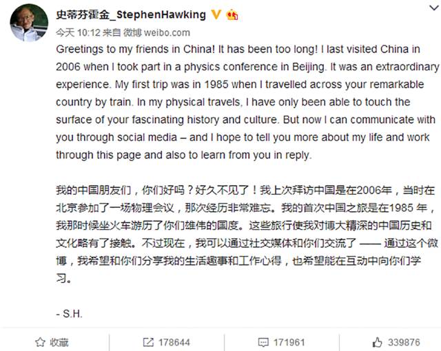 他不是第一次这么“任性”了,这个传奇的科学家,在中国发布的第一条微博就掀起一阵关注热潮。短短5个小时之内,得到17万回复,33万点赞,俘获了超过100万的微博粉丝。