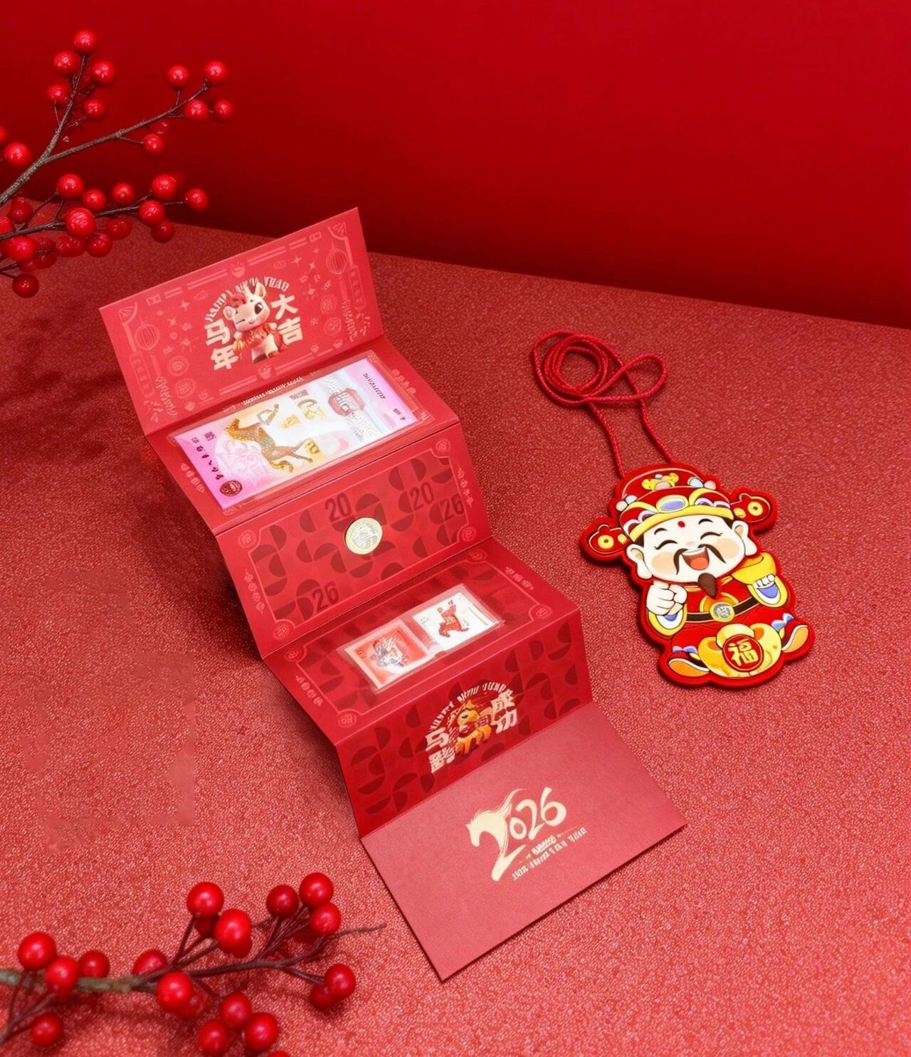 明细: ⭐2026马年纪念钞一张,⭐2026马年纪念币一枚,⭐2026丙午马年生肖邮票一套两枚,⭐超长折页红包一个,⭐「财源滚滚」立体布艺大红包一个,⭐栖霞寺手机财库贴一枚,⭐足金转运福一个,⭐福袋一个,