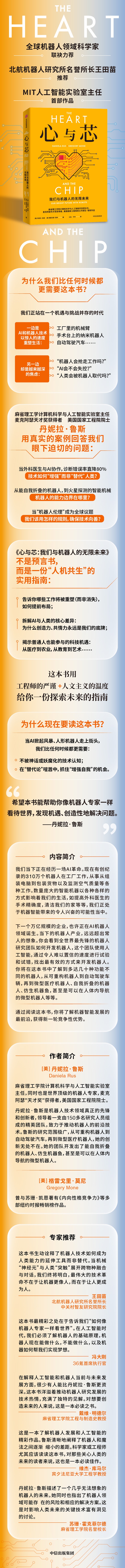 1. 本书聚焦机器人学、人工智能和深度学习,向读者展示了机器人领域的快速发展以及公司和人才聚焦的关键技术。本书由北航机器人研究所名誉所长王田苗荐,是一部了解未来机器人投资机会和可能性的重磅作品。2.妮拉•鲁斯是麻省理工学院(MIT)计算机科学和人工智能实验室(CSAIL)的主任、世界先的机器人专家、麦克阿瑟 “天才”奖得主,美国国家工程院院士。她长期从事人工智能和机器人研究,研究人工智能和机器人技术。她领导着一支由150多名研究人员组成的精英团队,致力于推动机器人的前沿技术。鲁斯的研究范围极广,从可重构机器人到自动驾驶汽车,再到微型医疗机器人,她的创新无处不在。她的团队开发出了能自我折叠的机器人、仿生机器鱼,甚至是可以在人体内导航的微型机器人。