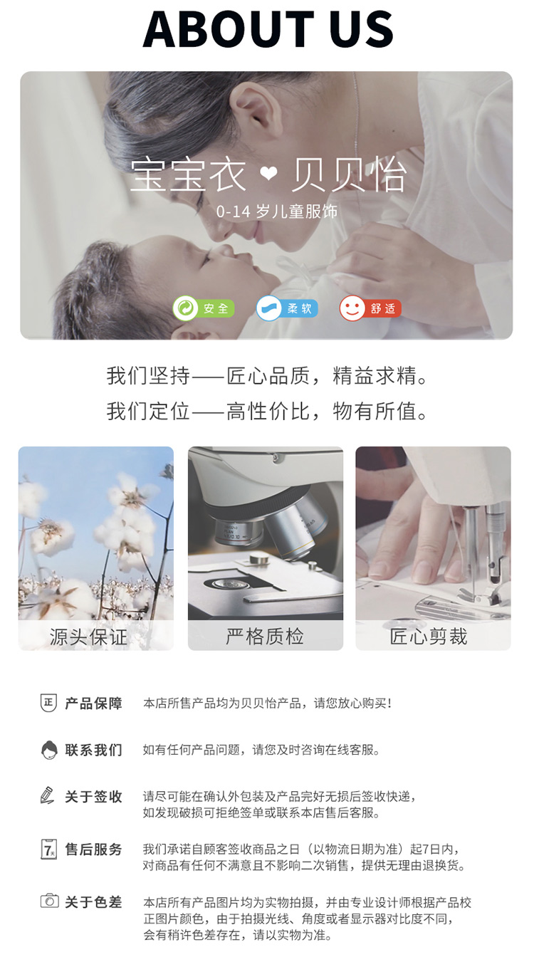 - 贝贝怡专注0-6岁婴幼儿服饰,坚持安全、柔软、舒适的产品理念,为千万中国家庭提供超高品质、安全可靠的婴幼儿服饰产品,妈妈放心,宝宝开心!