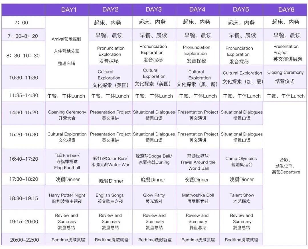 为孩子们打造全英文的语言环境,随时随地把英语脱口而出!激情的英语发音口语课堂,让营员学习流利标准的英语发音,语调训练,节奏训练,连读略读训练,英语思维,美式课堂,文化体验,英语演讲,唇枪舌辩,素质拓展,在活动和游戏过程中口语狂轰滥炸!6天5夜英语浸泡,把英语彻底说出来!