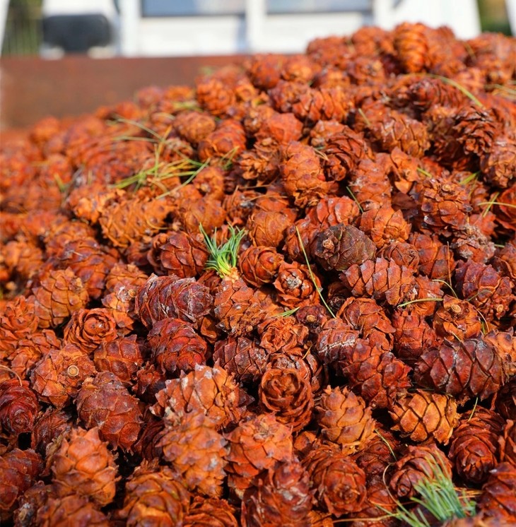 偃松果采回家,下一步就是脱粒,得到闪亮的松子。脱粒的机器是林区老人们研究制造的,简单有效。只要松果成熟饱满,脱粒就非常容易。