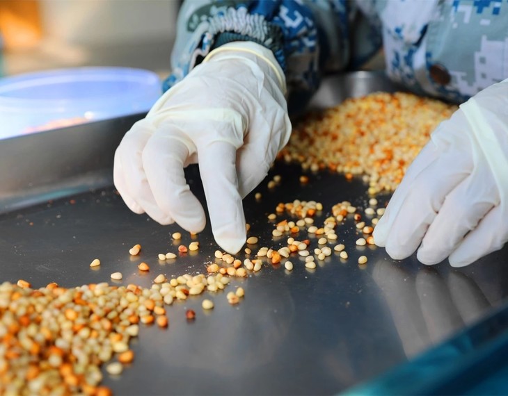 松仁加工完成后,还要进行手工挑选,保证大家吃到的松仁都是完好美味的。
