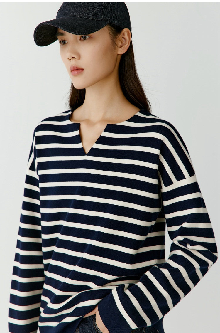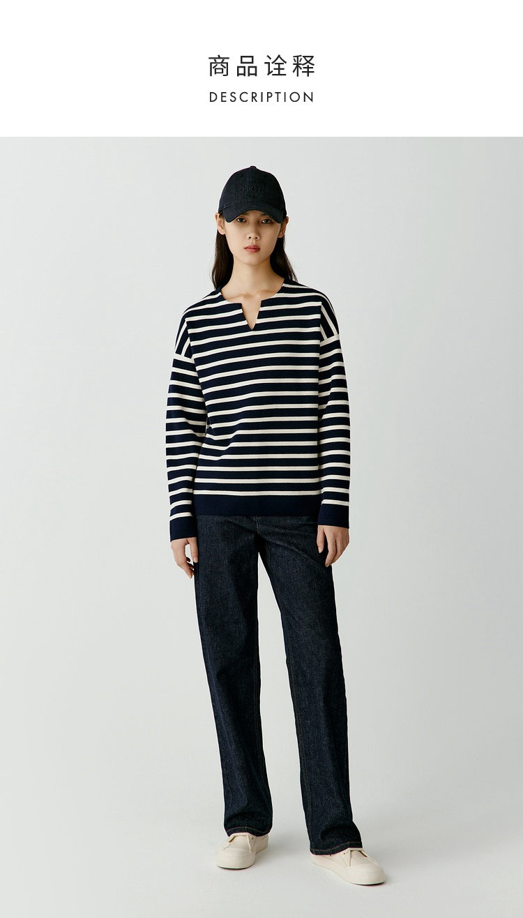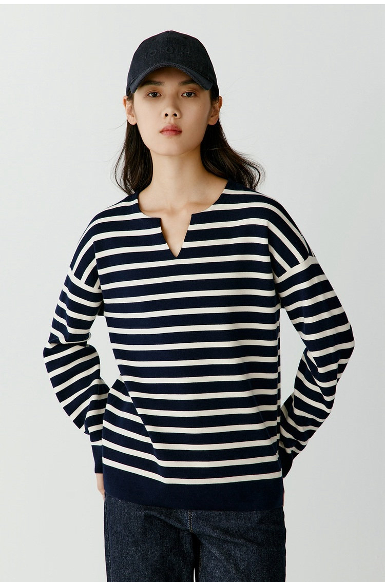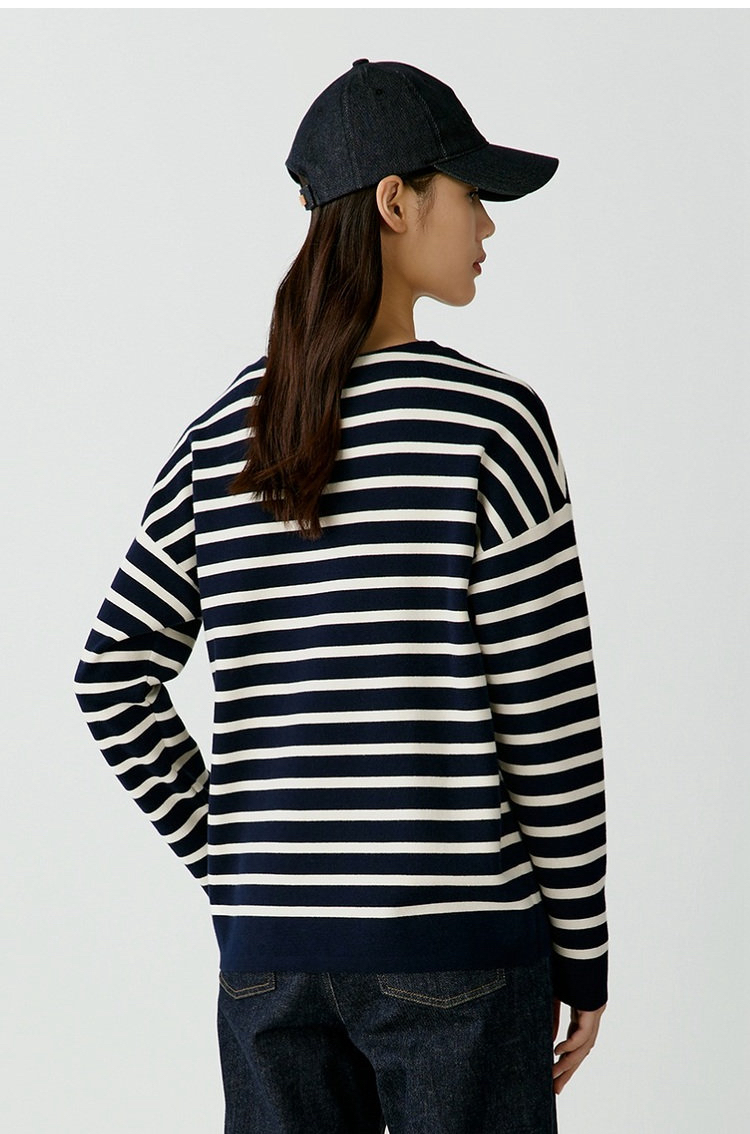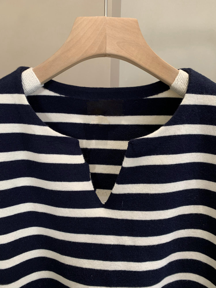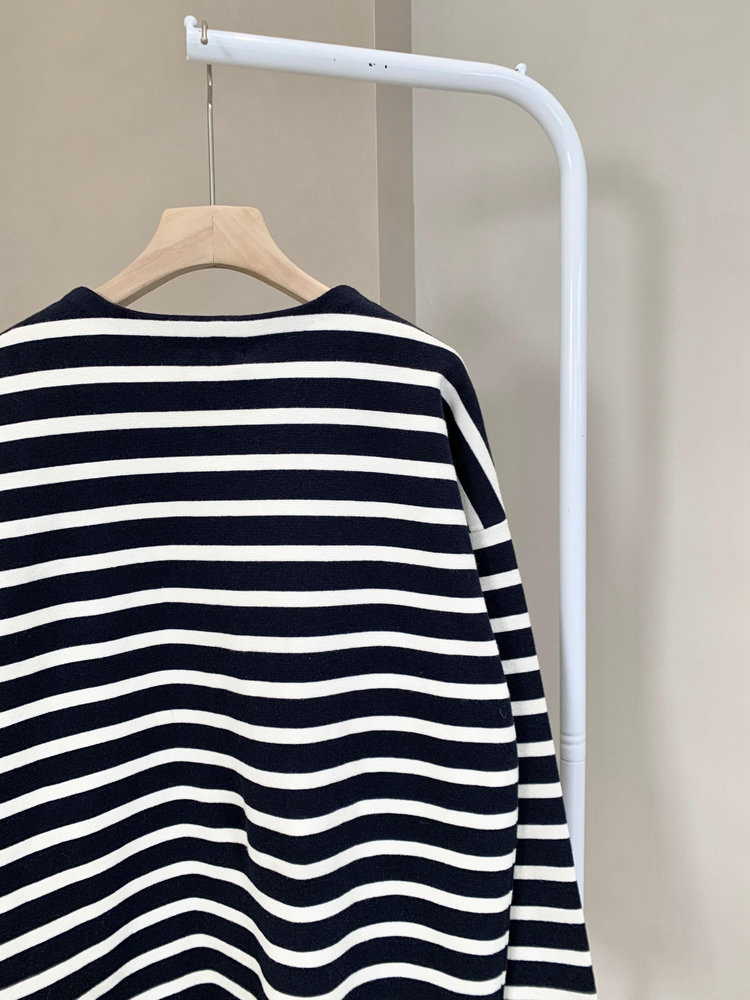 半精纺棉羊绒针织衫 条纹设计明快有活力 落肩直身廓形 自在舒适 领型独特 版型显瘦有空间感 藏青色+白色配色经典