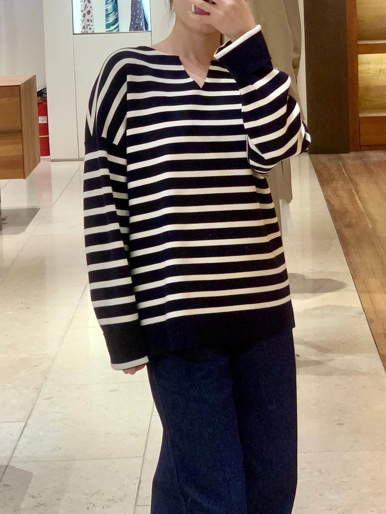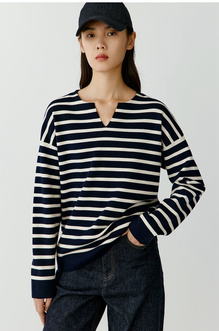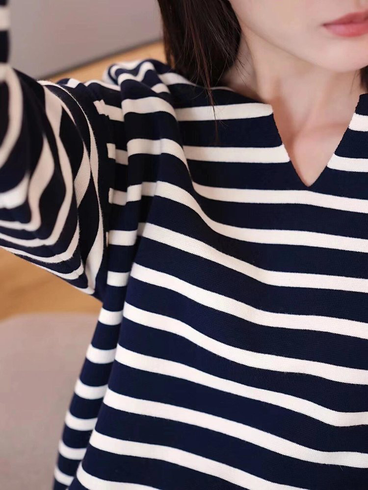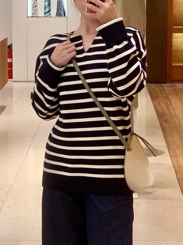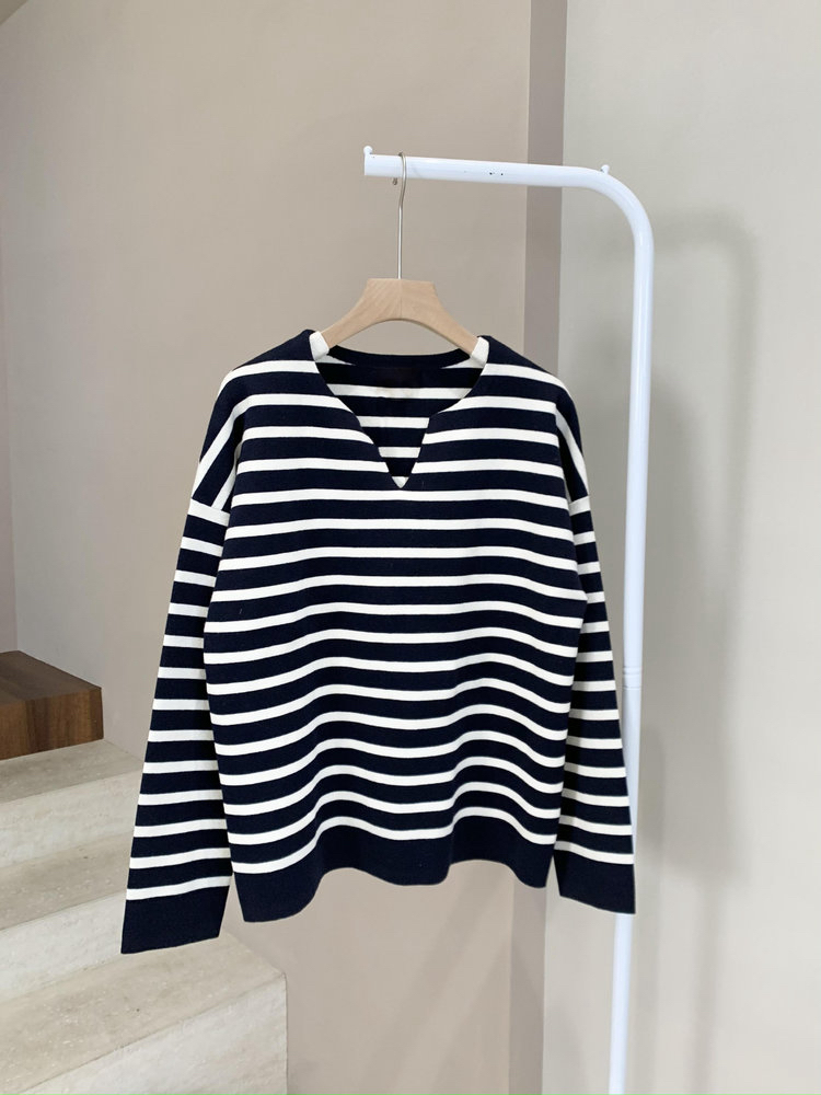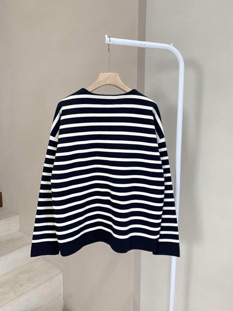 半精纺棉羊绒针织衫 条纹设计明快有活力 落肩直身廓形 自在舒适 领型独特 版型显瘦有空间感 藏青色+白色配色经典