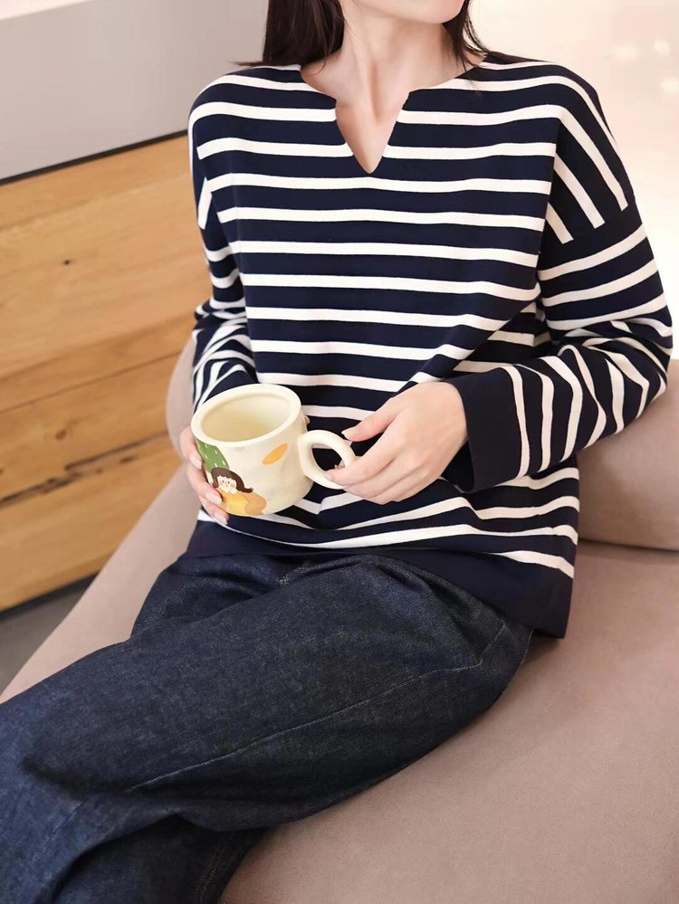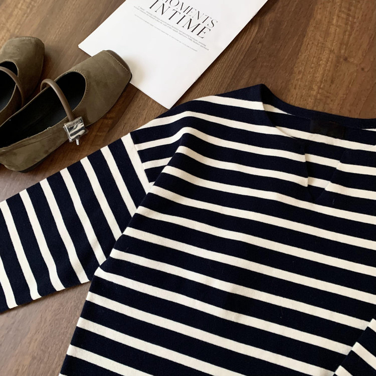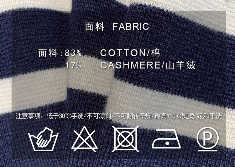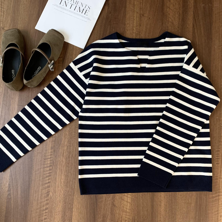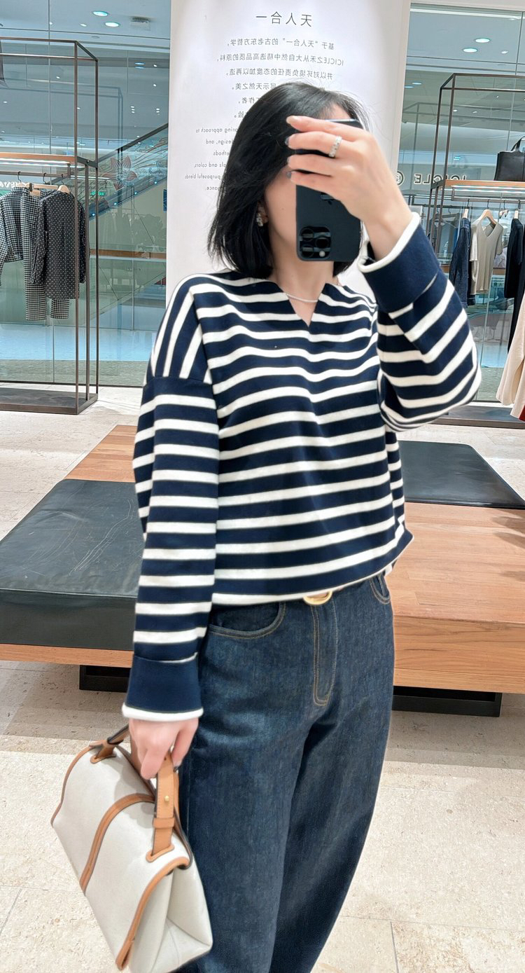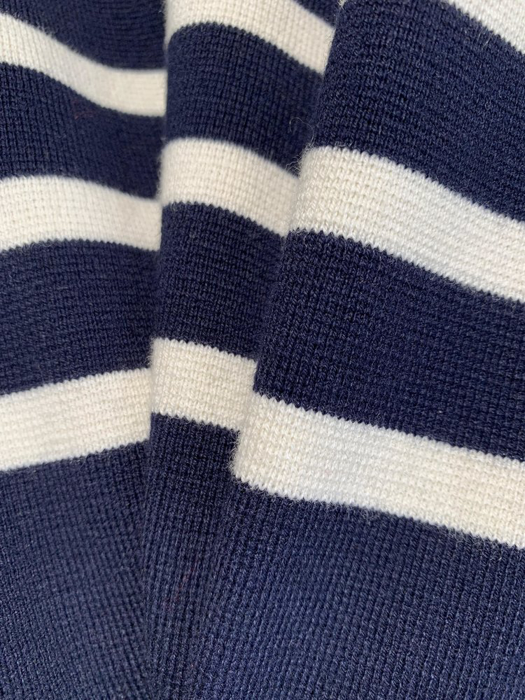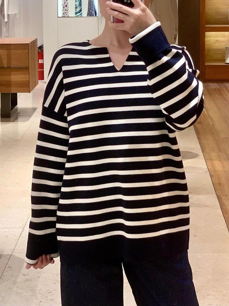 半精纺棉羊绒针织衫 条纹设计明快有活力 落肩直身廓形 自在舒适 领型独特 版型显瘦有空间感 藏青色+白色配色经典
