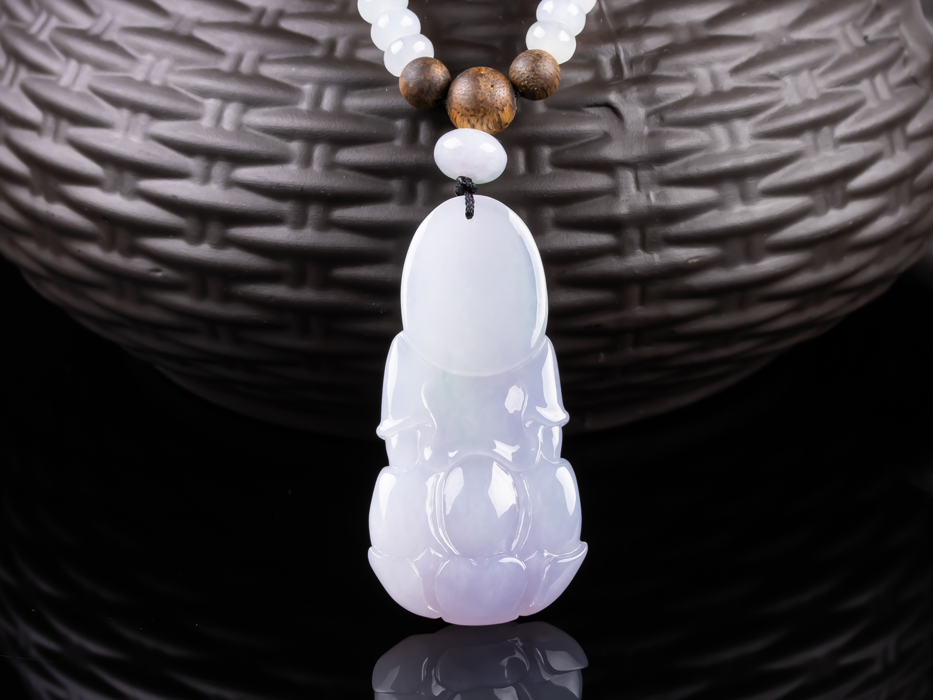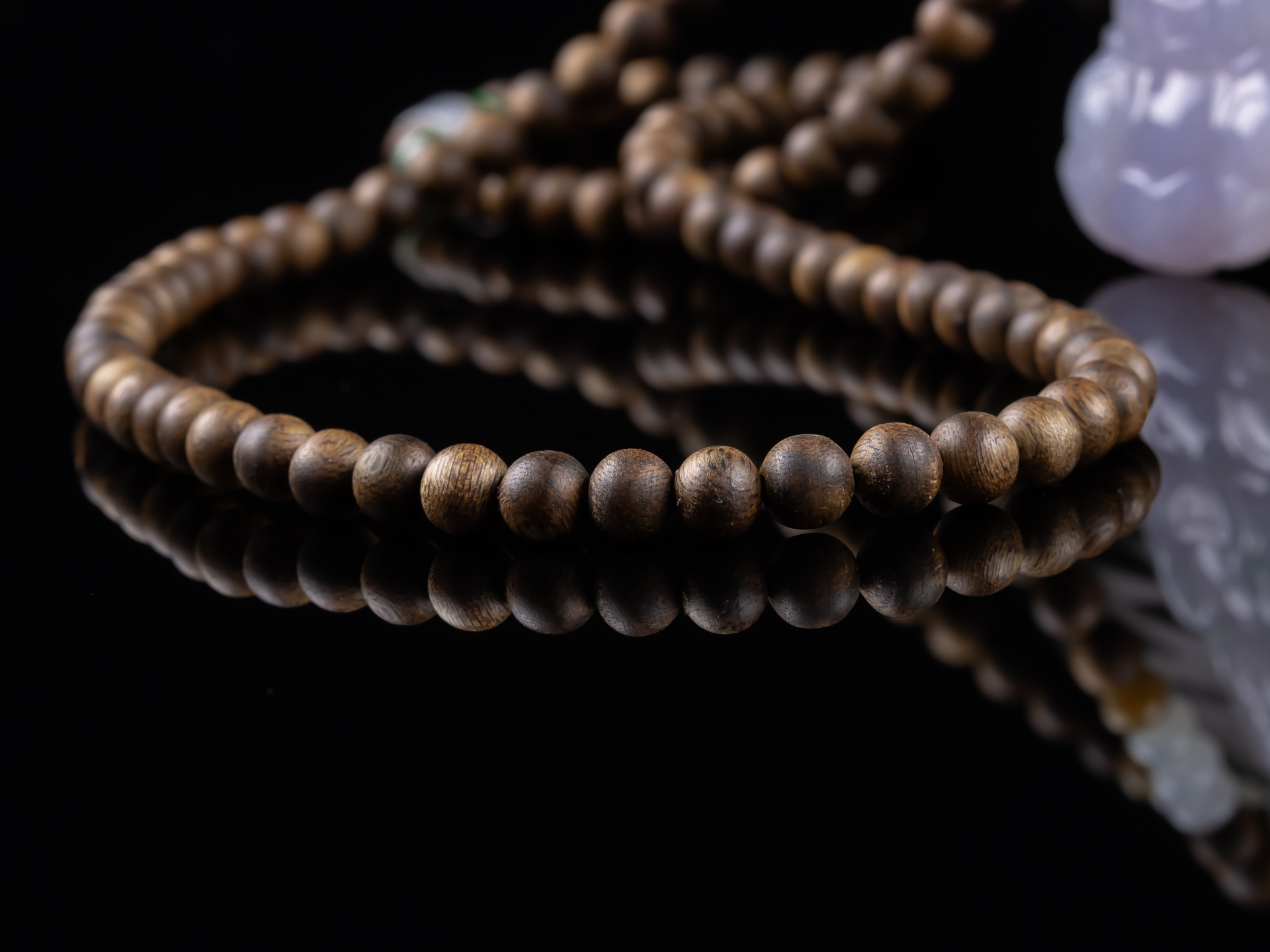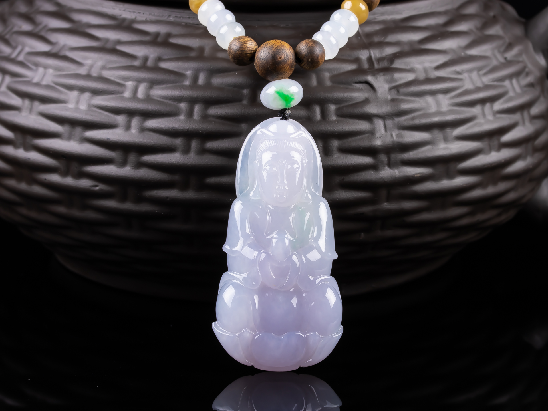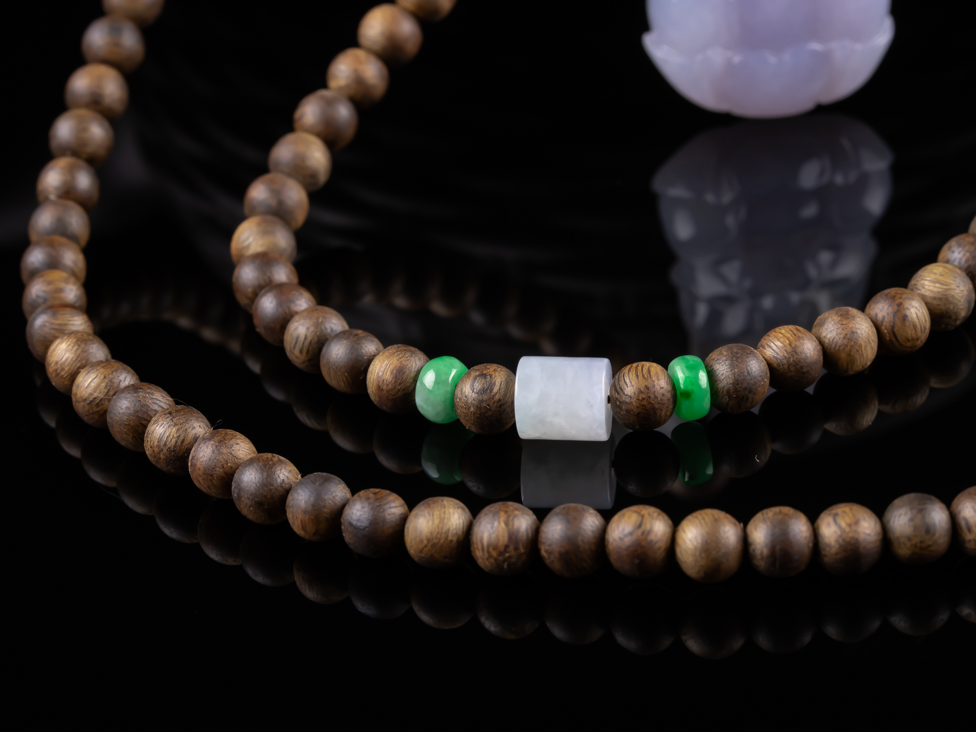 原创DIY沉香翡翠珠链+紫罗兰翡翠观音挂件,天然沉香6.3mm珠子,链子总长31cm,原色原味,香气清甜,翡翠观音面相祥和,慈悲为怀,庇佑平安。佩戴于胸膛闻到那股细腻的沉香气息时,仿佛整个世界都变得那么安静而温暖。整个人的磁场都充满了能量。