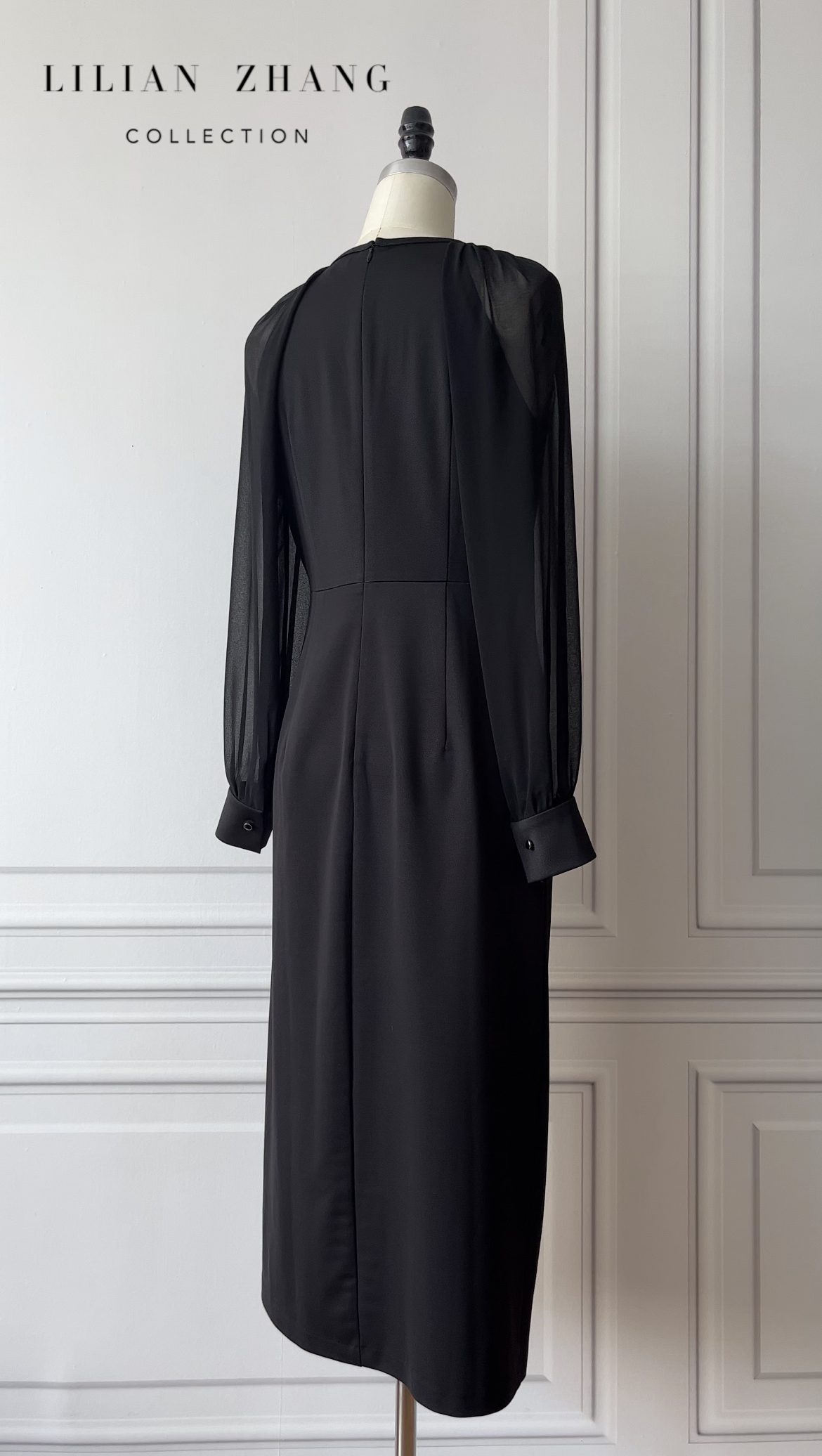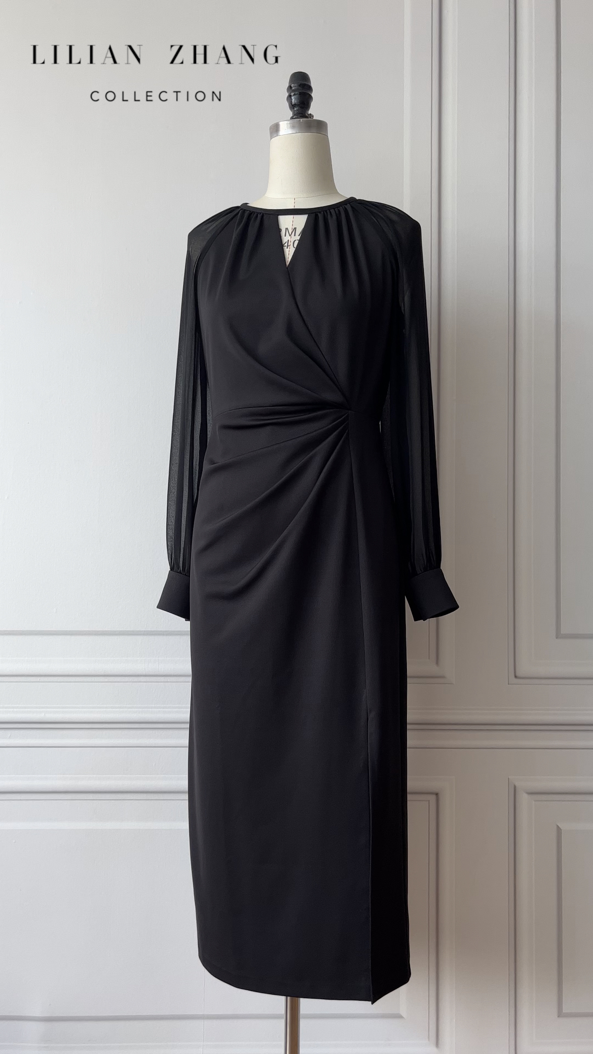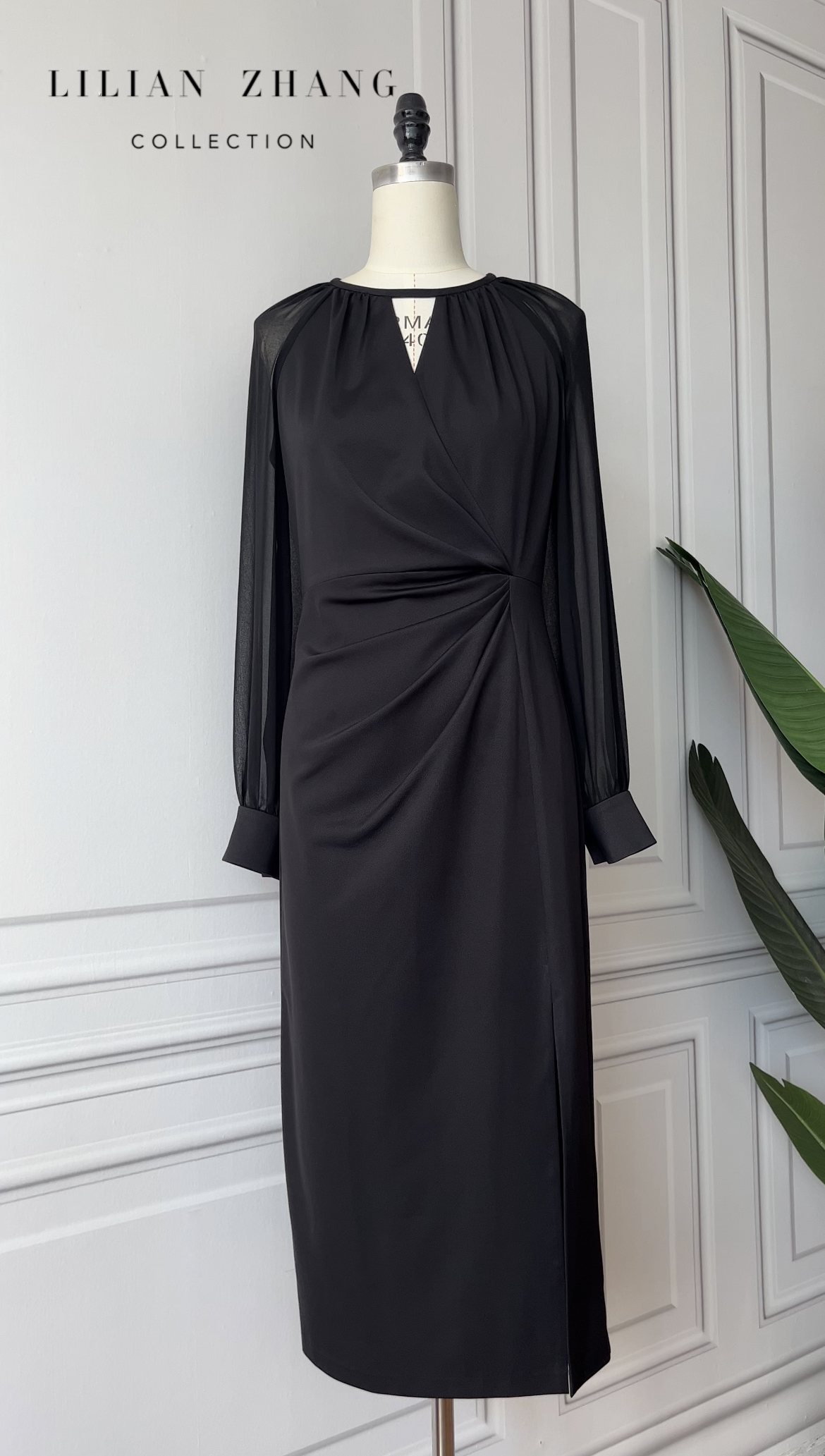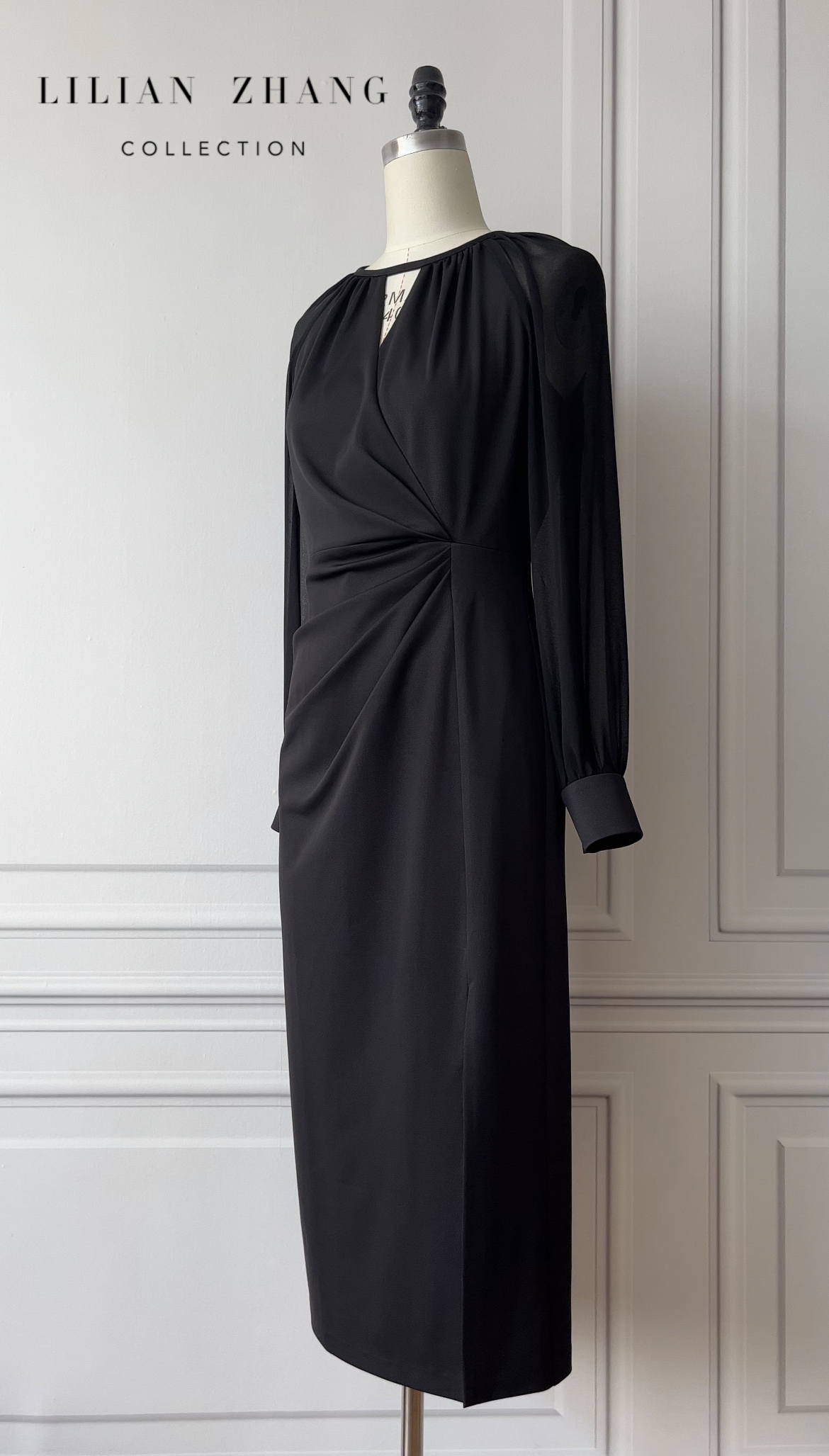 浪漫邂逅—法式褶皱塑身X型长袖显瘦连衣裙气质黑色女神裙2301002