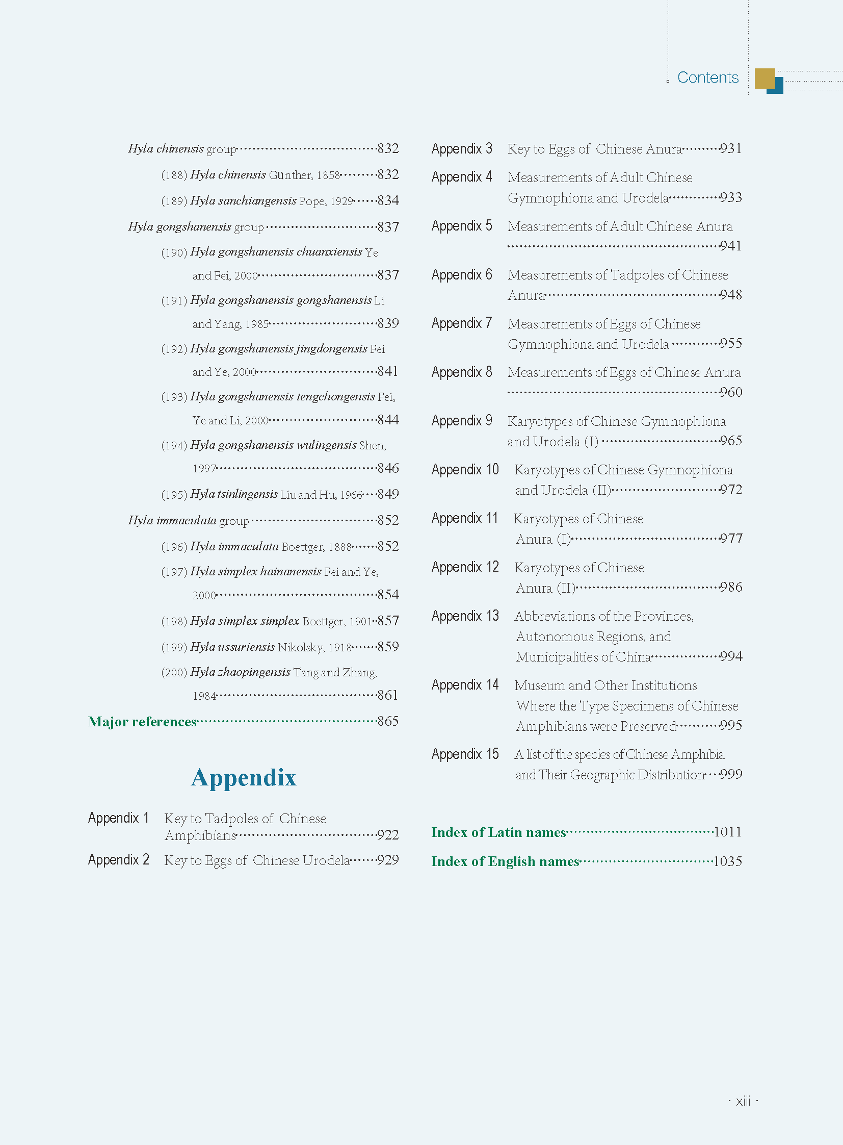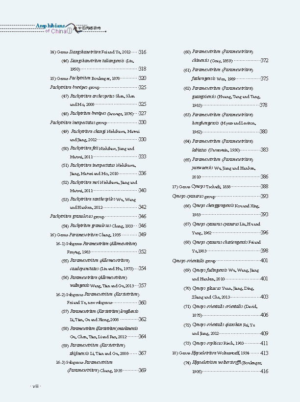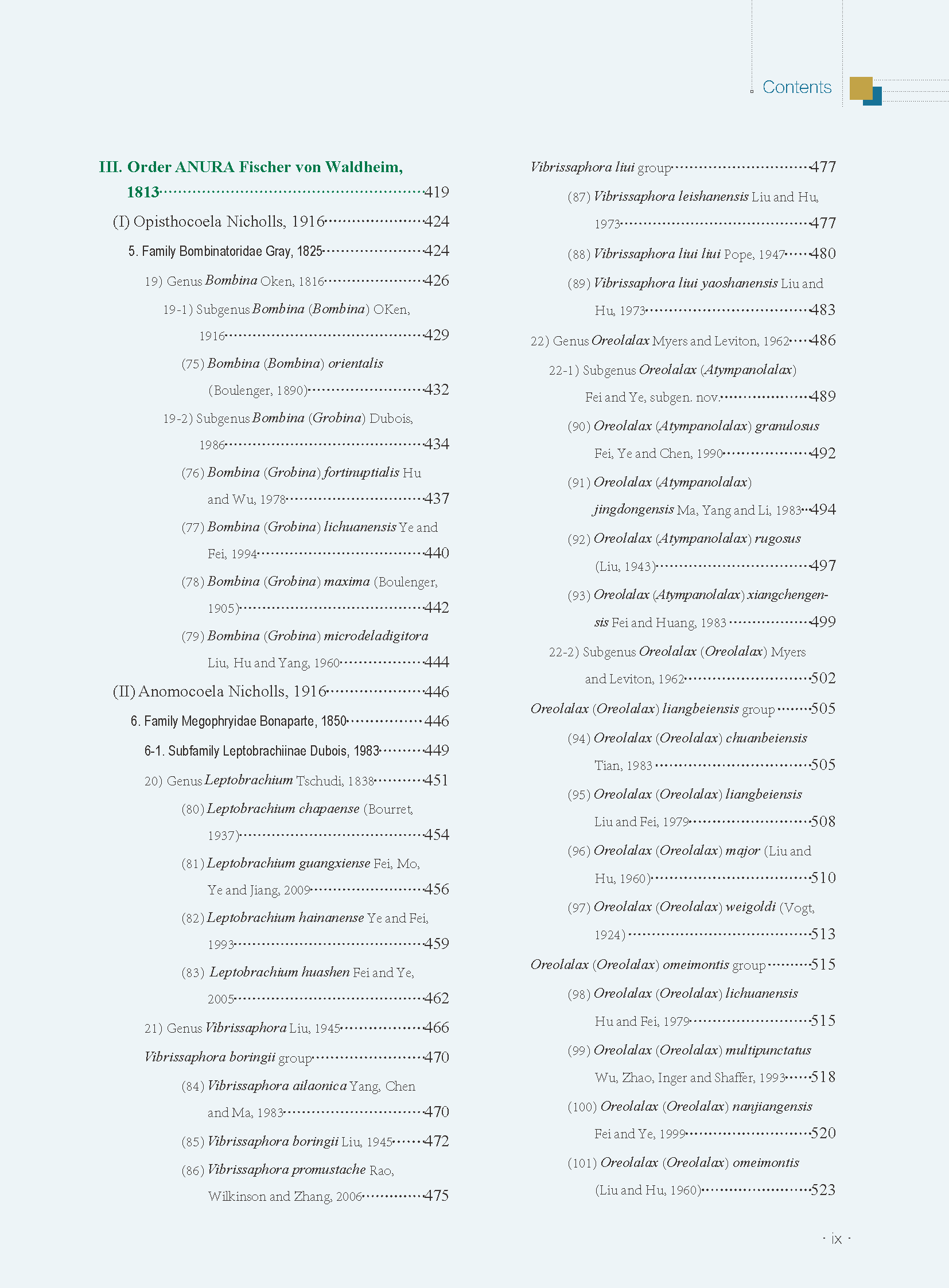 每种动物的编写内容包括其拉丁学名、英文名、异名、形态特征、生物学资料、种群现状、受威胁等级、地理分布及必要的分类讨论。书中收录各类图片约9000幅,其中包括部分首次发表的骨骼图片,书中还对比了各属或类群物种的完全骨化特征,为蛙类躯体结构与功能研究提供了广泛依据。此外,每一卷均附有系列附录,包括蝌蚪与卵的检索表、成体及蝌蚪与卵的测量数据、成体骨骼术语,以及核型Ⅰ和核型Ⅱ;此外,附录还涵盖物种地理分布、英文与拉丁学名索引,以及馆藏中国模式标本图片。