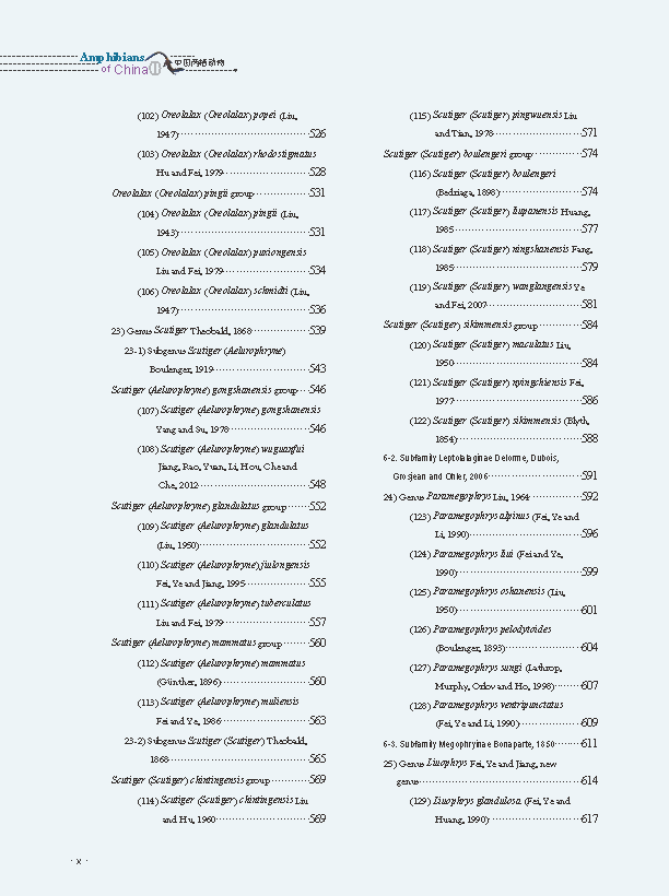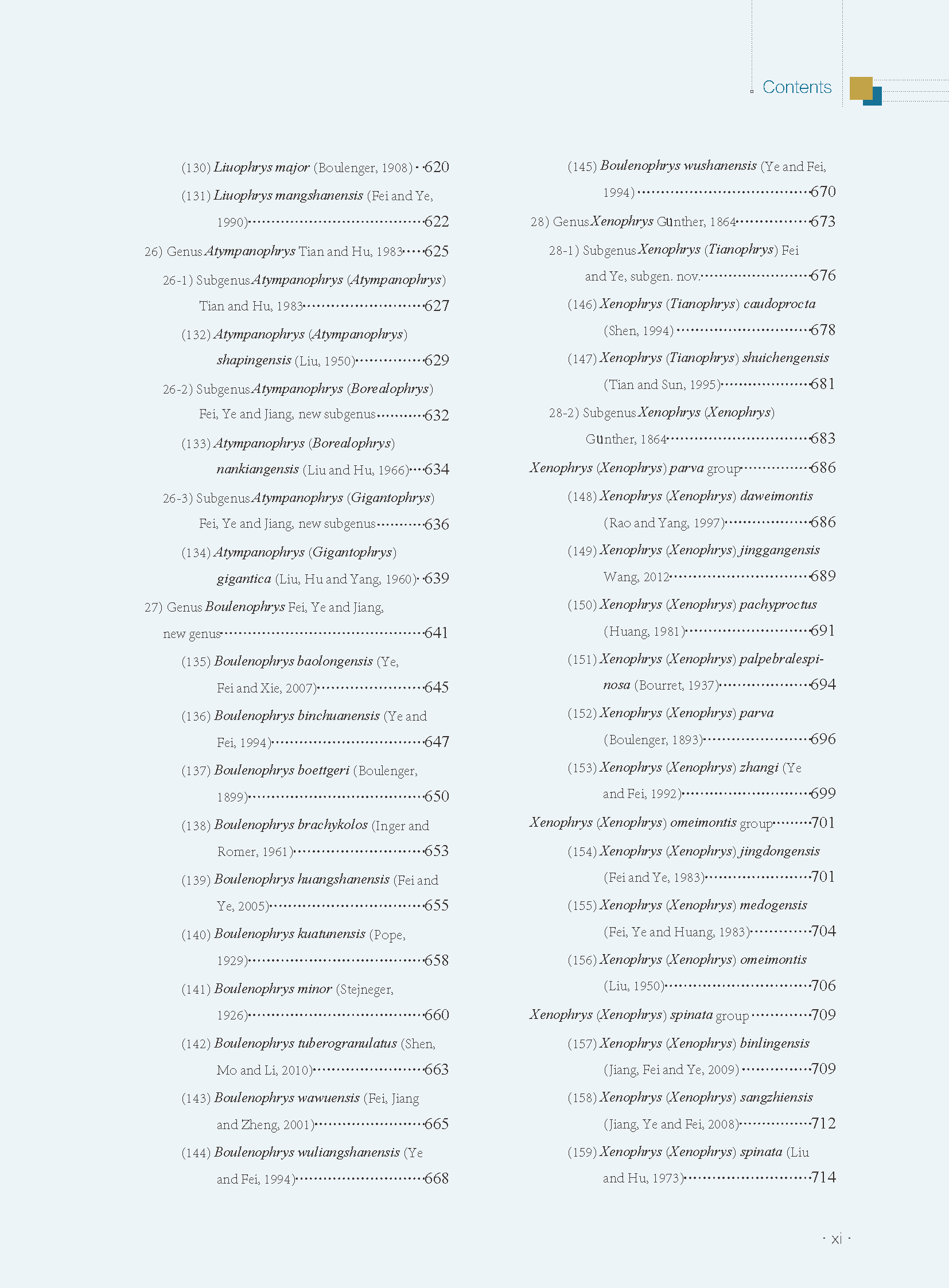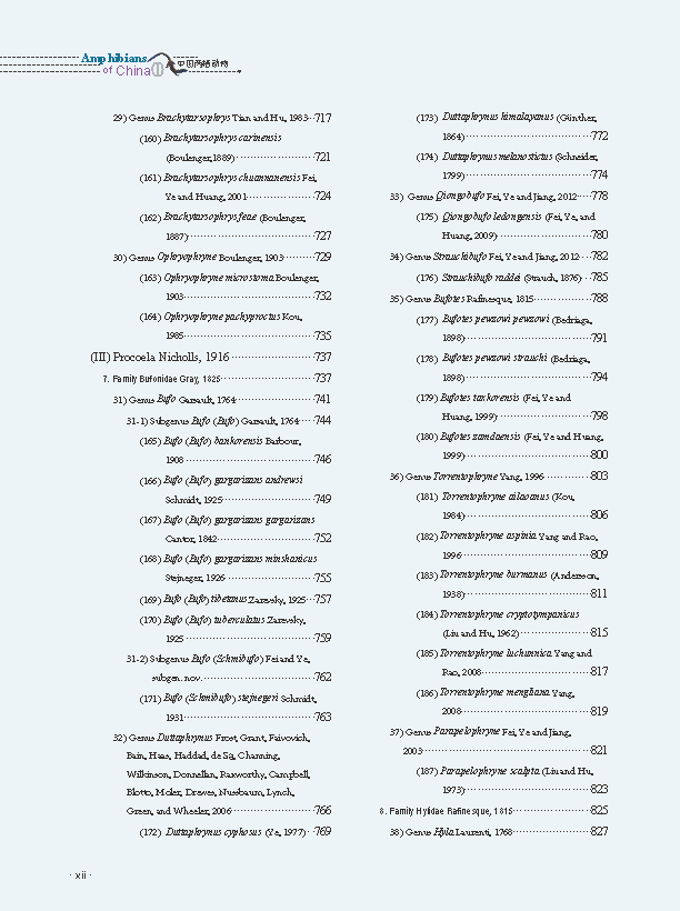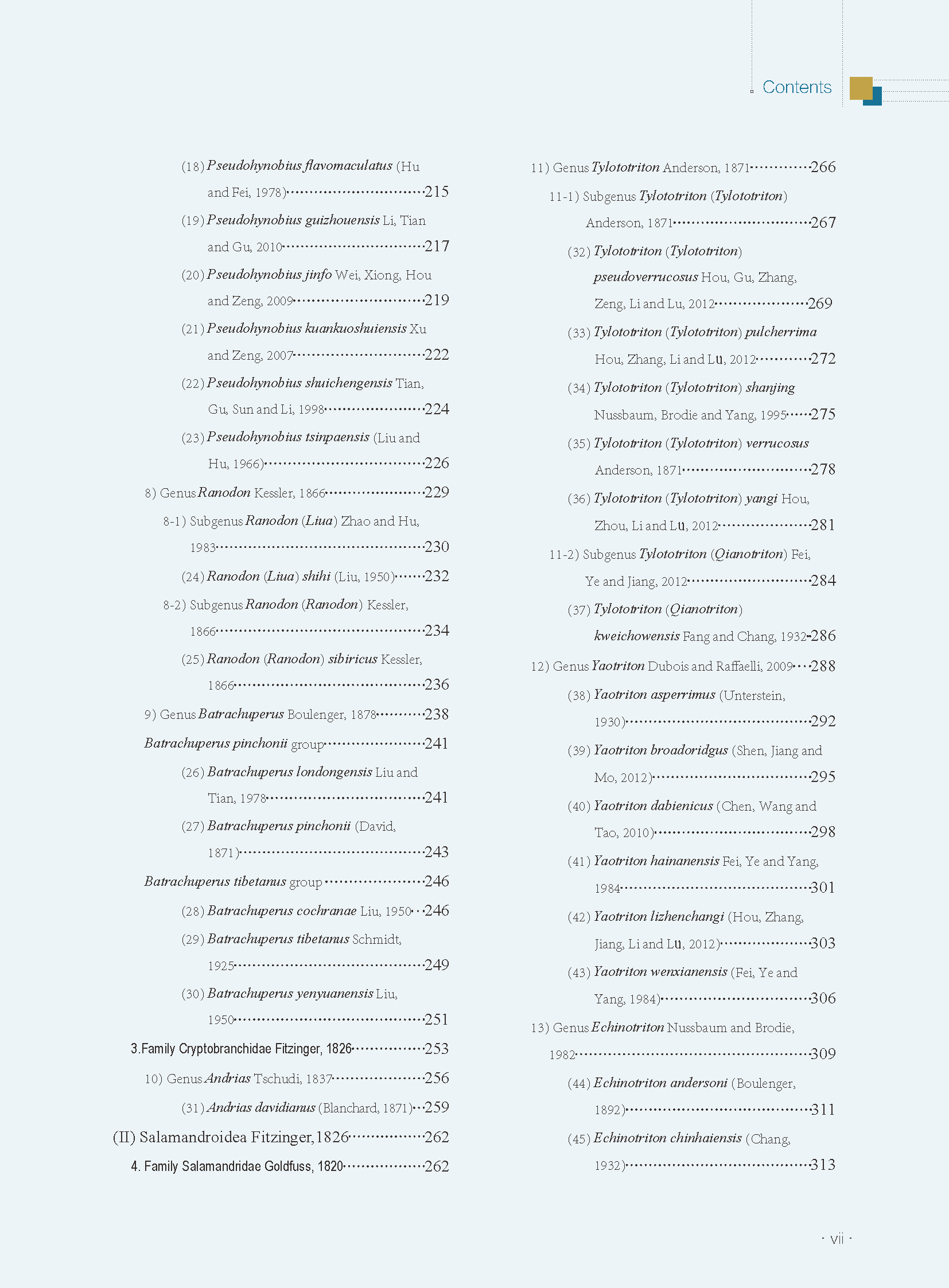 每种动物的编写内容包括其拉丁学名、英文名、异名、形态特征、生物学资料、种群现状、受威胁等级、地理分布及必要的分类讨论。书中收录各类图片约9000幅,其中包括部分首次发表的骨骼图片,书中还对比了各属或类群物种的完全骨化特征,为蛙类躯体结构与功能研究提供了广泛依据。此外,每一卷均附有系列附录,包括蝌蚪与卵的检索表、成体及蝌蚪与卵的测量数据、成体骨骼术语,以及核型Ⅰ和核型Ⅱ;此外,附录还涵盖物种地理分布、英文与拉丁学名索引,以及馆藏中国模式标本图片。