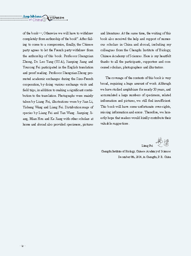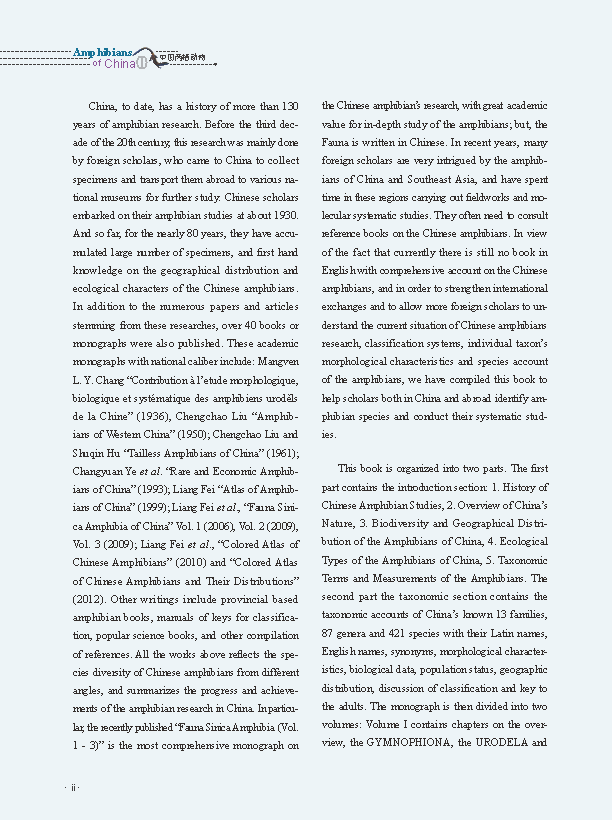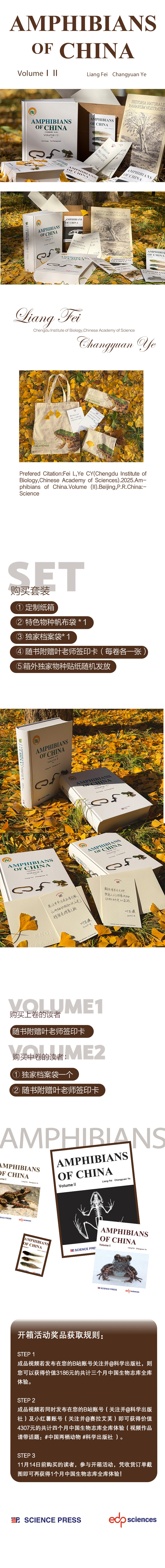 《中国两栖动物》是一部基于作者数十年野外调查、实验室研究,并整合国内外相关文献信息编写而成的学术专著。该著作共分三卷陆续出版,其中第一和第二卷分别于2016和2025年出版。