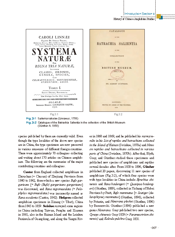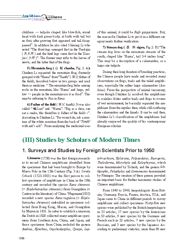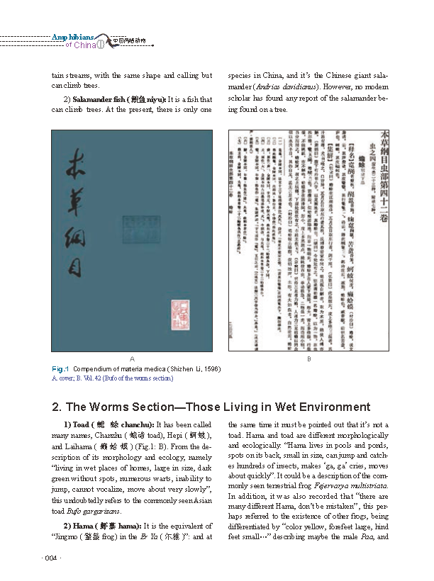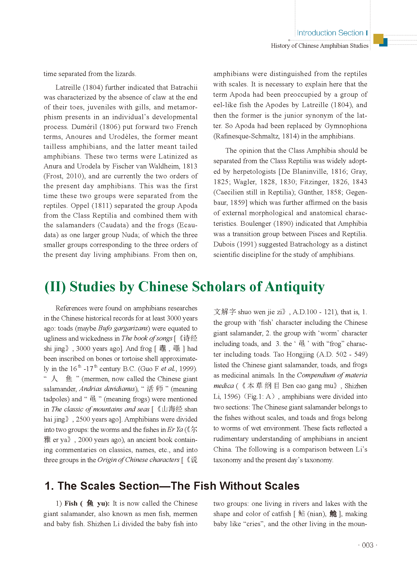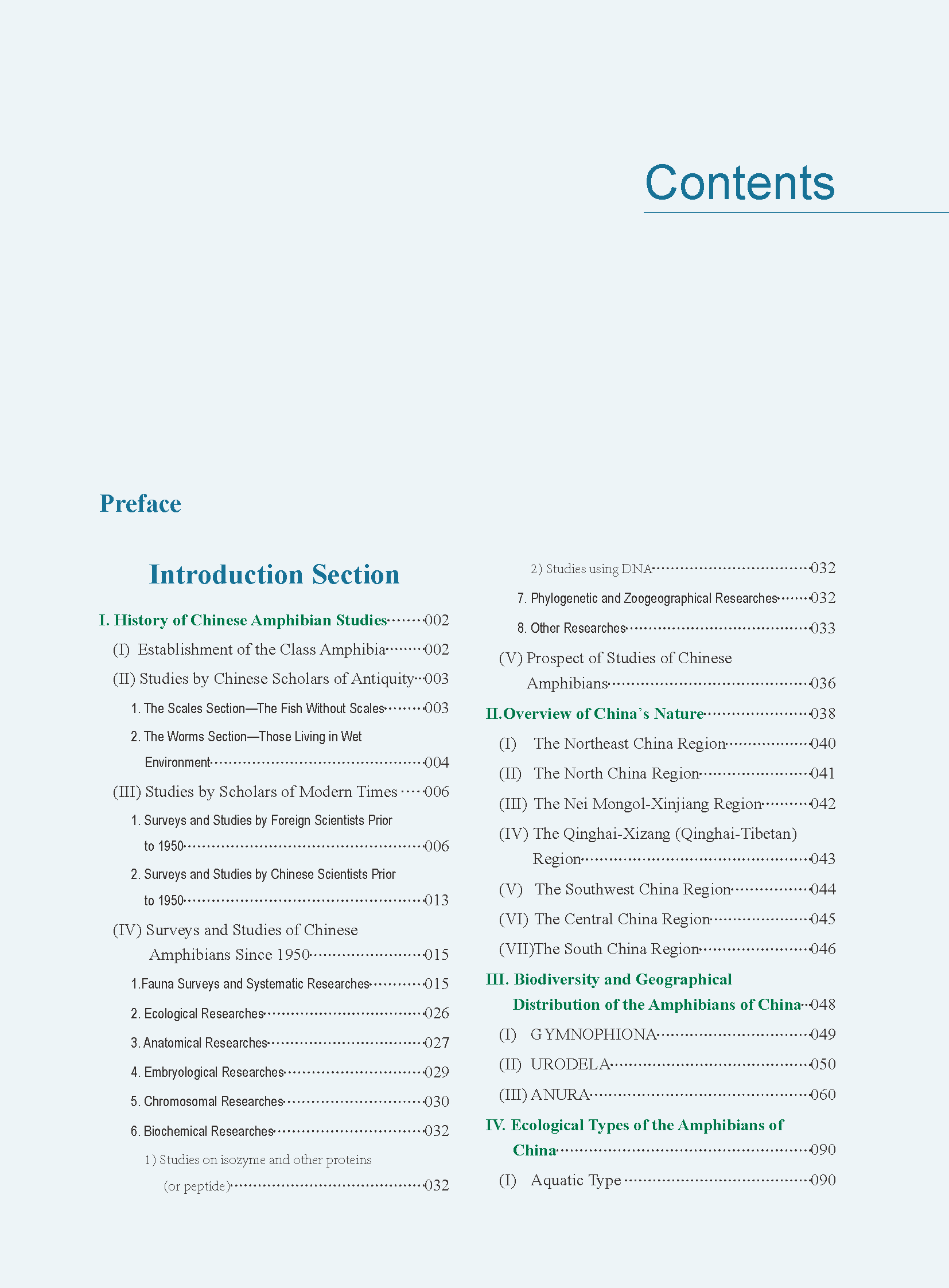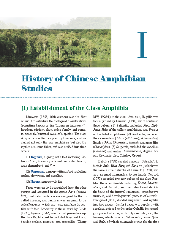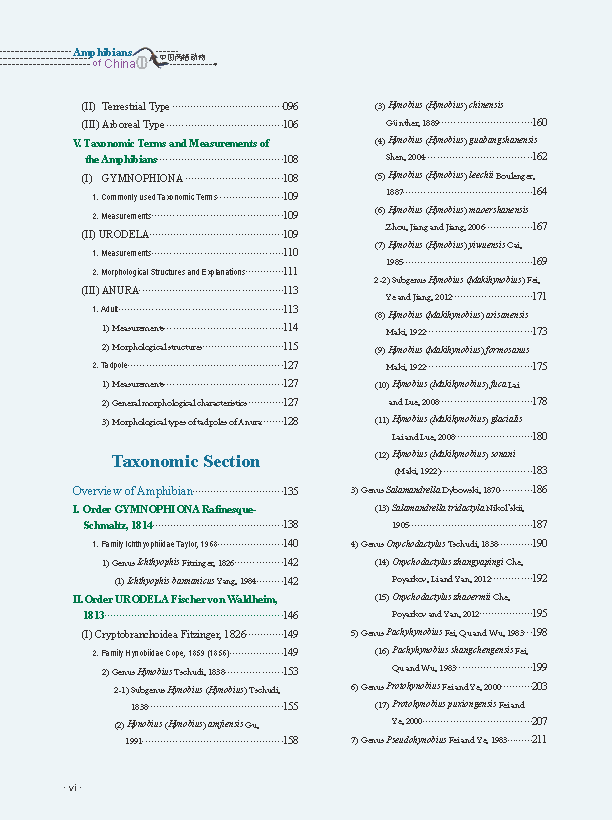 第一卷包括两大部分:第一部分为概述部分,内容包括中国两栖动物研究史、中国自然概况、中国两栖动物生物多样性与地理分布、中国两栖动物生态类型,以及两栖动物分类术语与测量方法。第二部分收录蚓螈目、有尾目和无尾目,含蚓螈科、隐鳃鲵科、小鲵科、蝾螈科、铃蟾科、角蟾科、蟾蜍科、雨蛙科8科,共38属、200种及亚种。