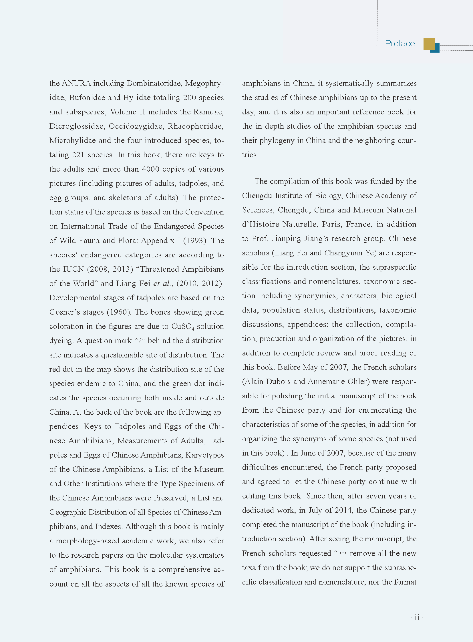第三卷包含两大部分:第一部分收录无尾目浮蛙科、亚洲角蛙科、树蛙科和姬蛙科,预计约129种。第二部分为增补截止于2022年第一卷所录科属在其之后的新发表的新种和国家新纪录种,约4科13属84种。预计共约收录213种。