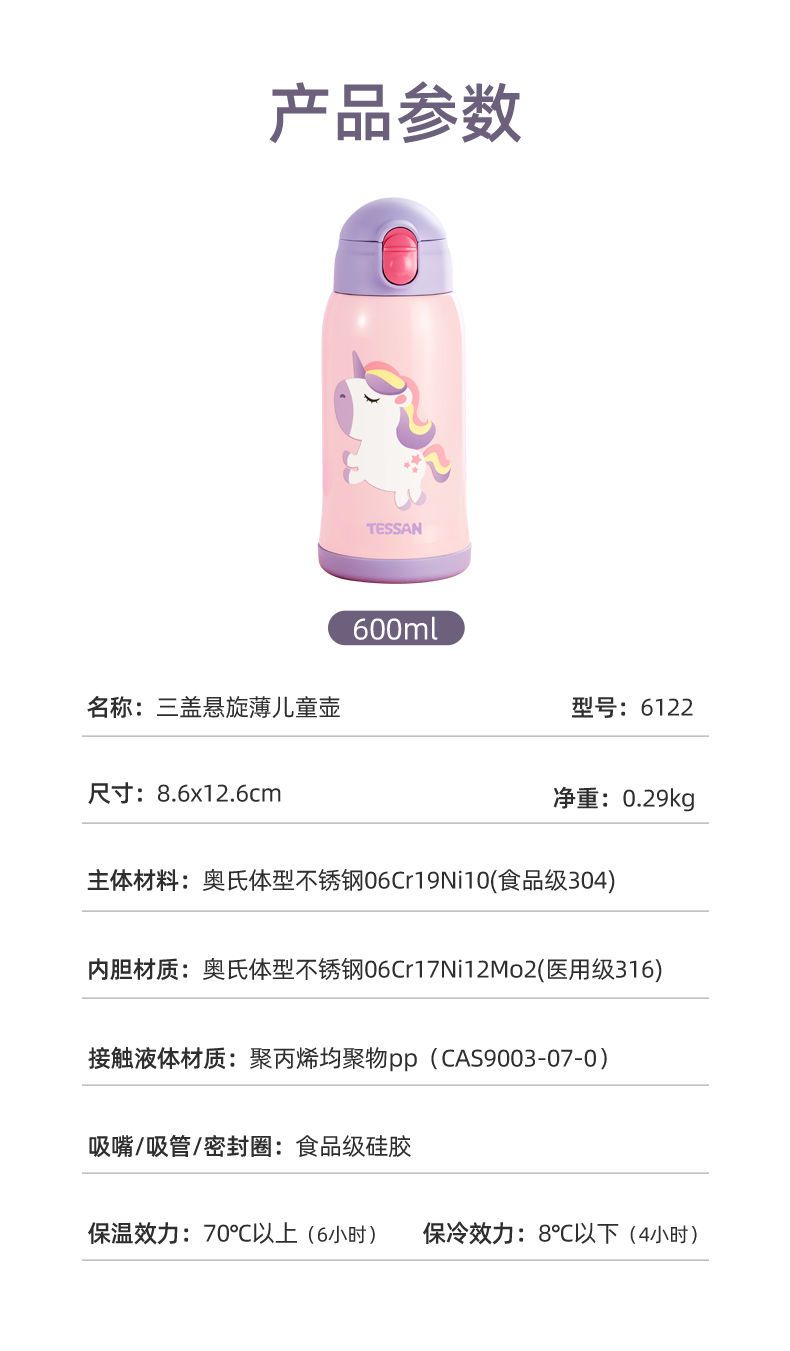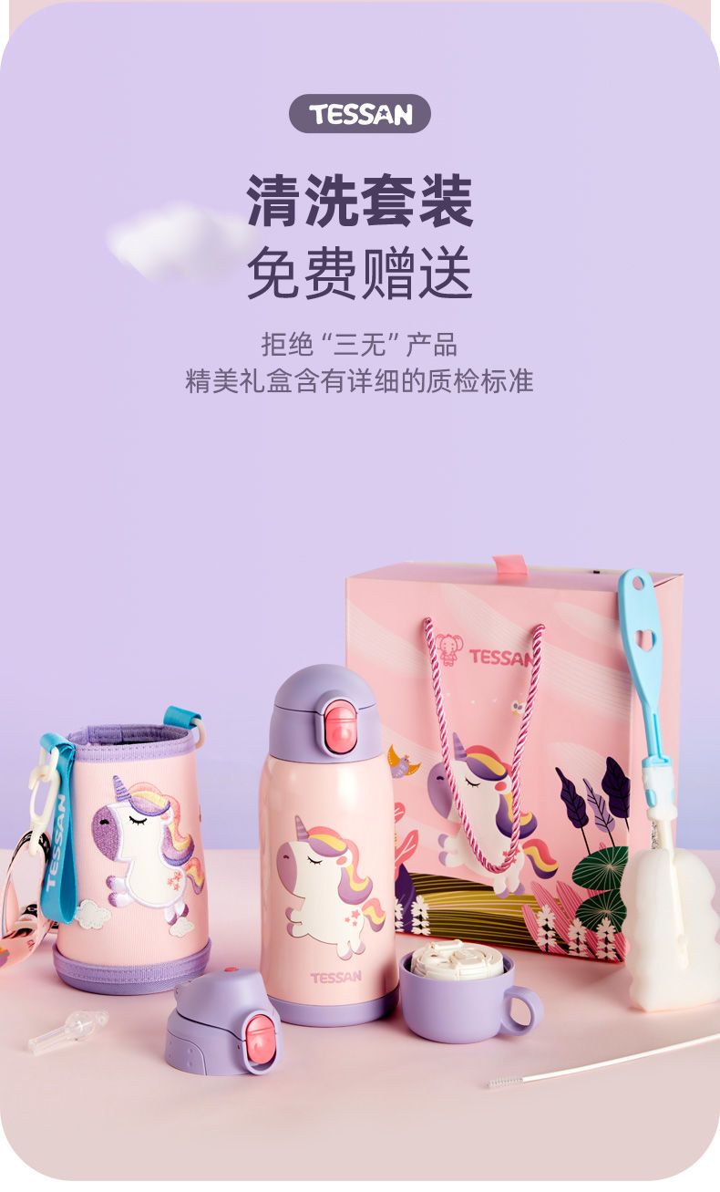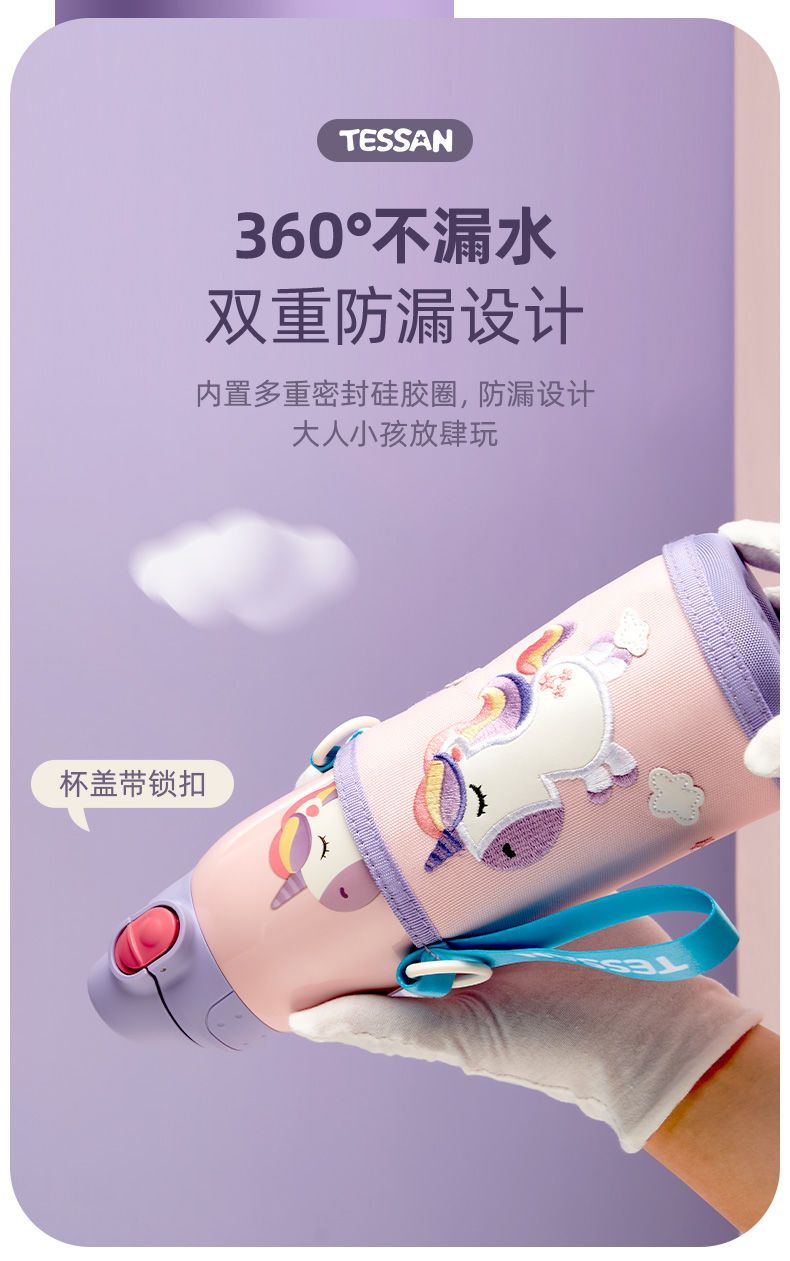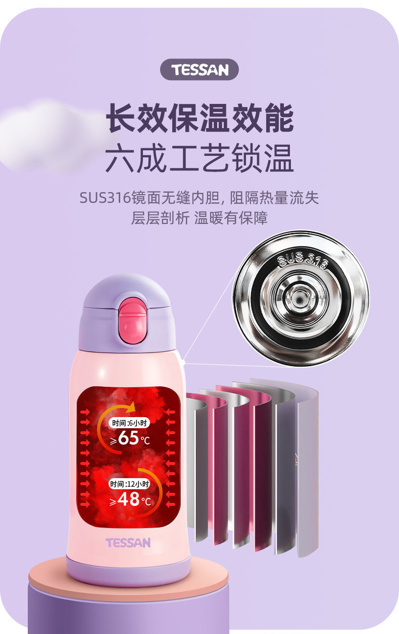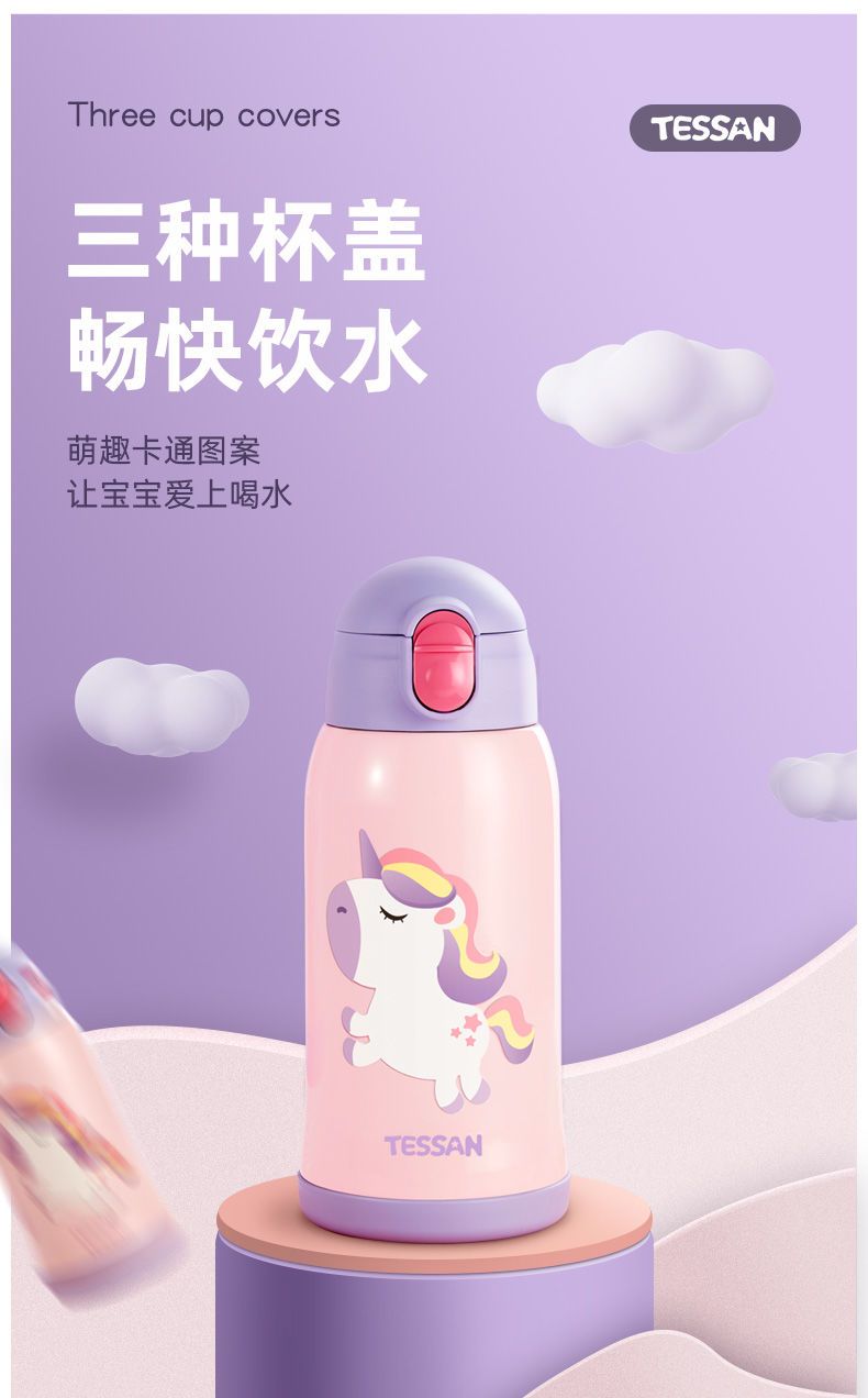 TESSAN儿童保温杯带吸管316食品级女孩男童小学生幼儿园水壶水杯
