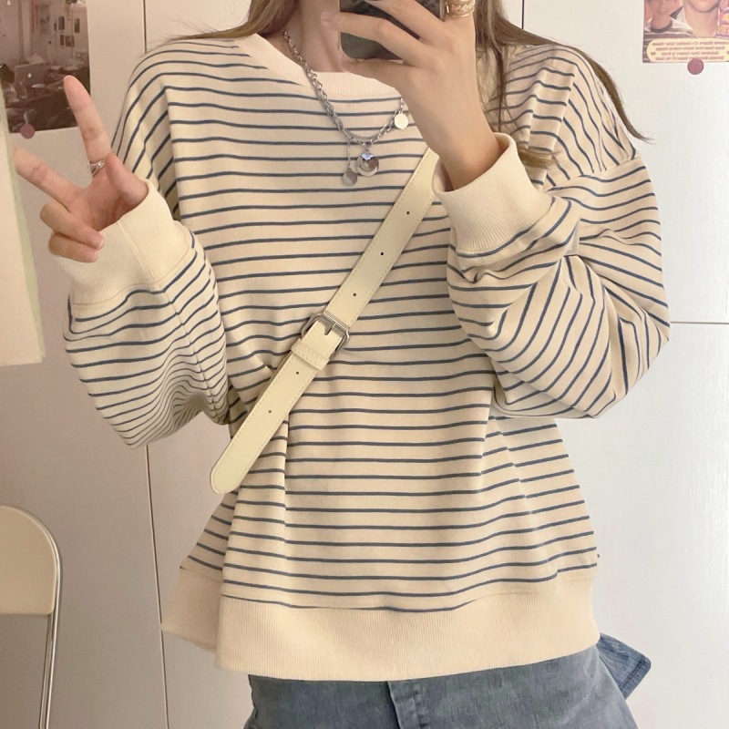 【早秋常备❗️搭配起来很有设计感】新款卫衣女早秋韩版宽松设计感条纹上衣圆领套头长袖T恤潮