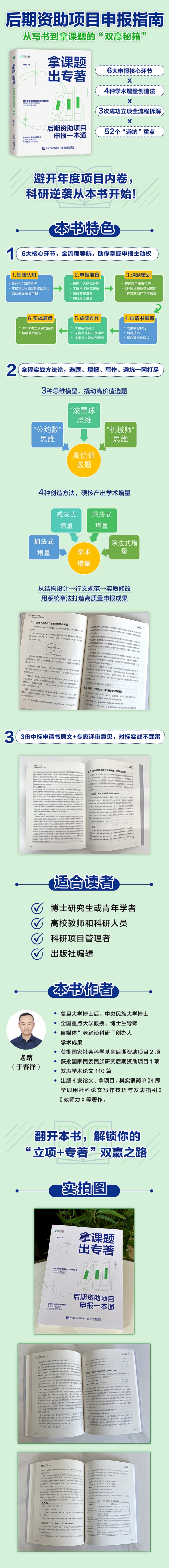 面对科研赛道竞争日趋激烈、项目立项难度不断加大的现状,后期资助项目可以成为广大科研工作者实现立项的破局点。本书结合作者3次成功获批后期资助项目的经验,基于基础认知、申报准备、选题策划、申请书写作、申报成果写作和实战复盘六大板块,打造提高后期资助项目立项成功率的系统解决方案。 《拿课题 出专著:后期资助项目申报一本通》对于申报包括国家社会科学基金后期资助项目在内的各类后期资助项目、学术专著出版基金项目、*博士论文出版项目具有重要指导意义,也是撰写高质量学术专著的参考书。