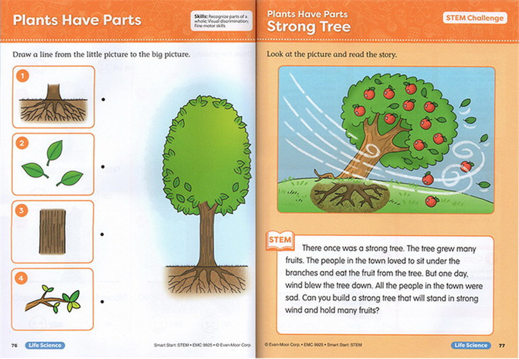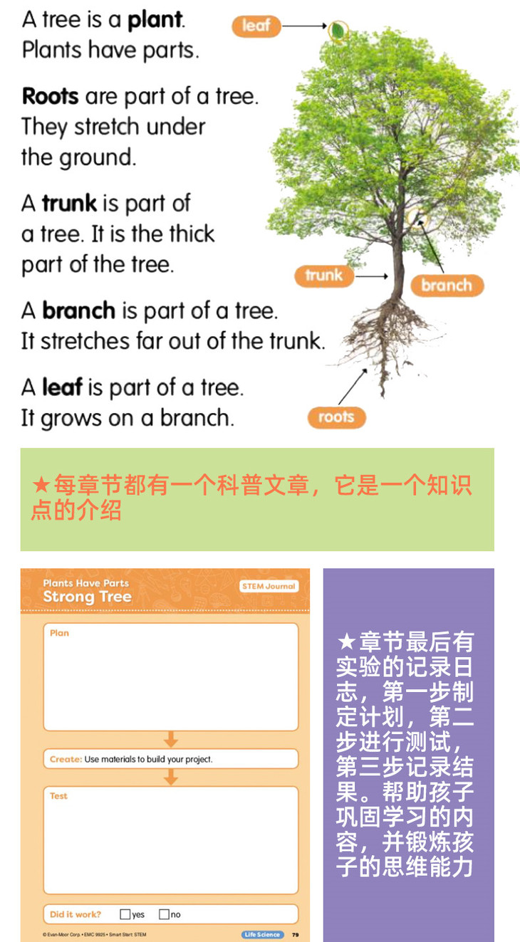 这套练习册一共有三本,分别是preK、K和1年级,循序渐进难度升级。包含了三大STEM主题:物理、生命和地球。书里的每一个章节由5部分内容组成: