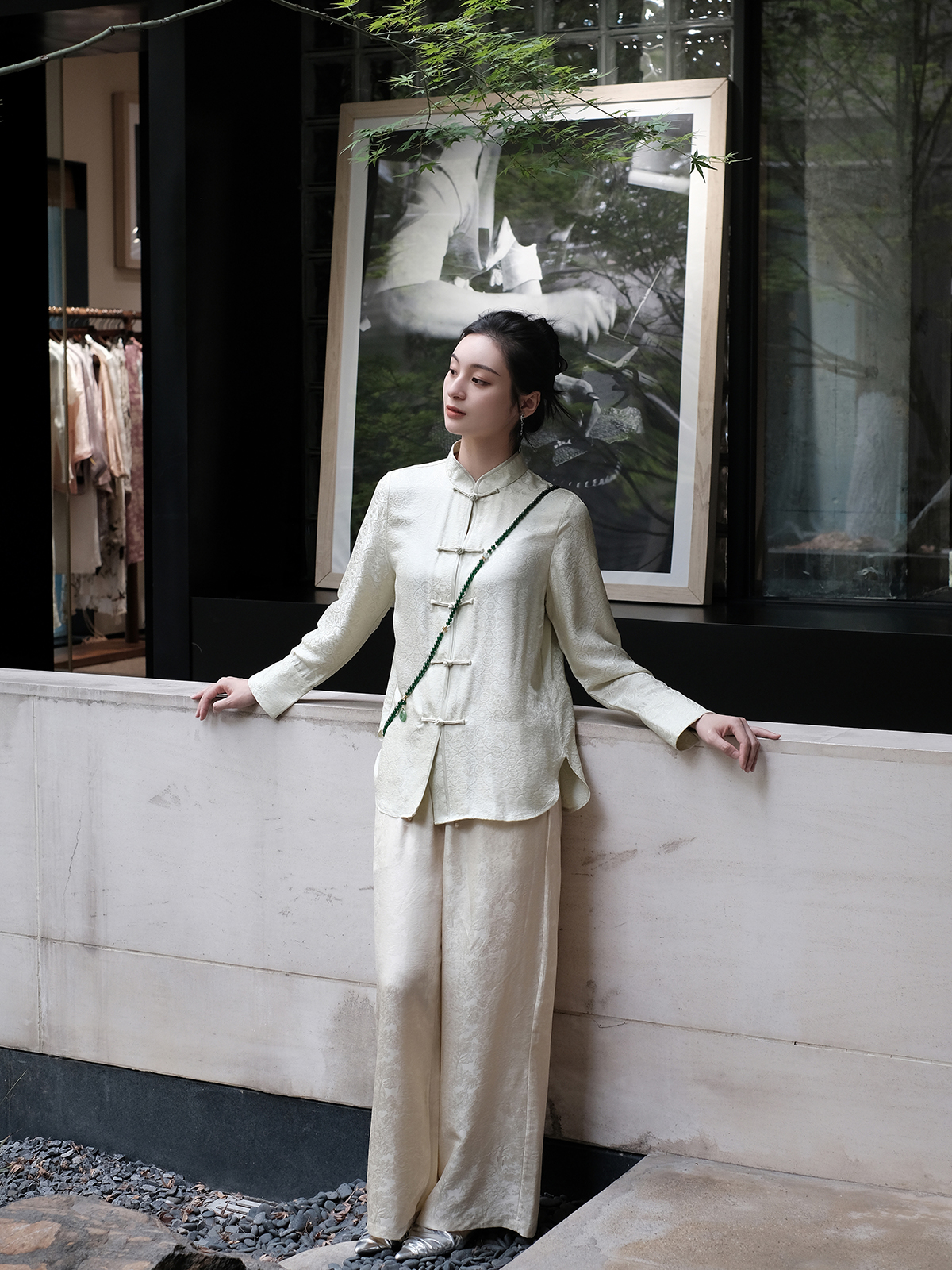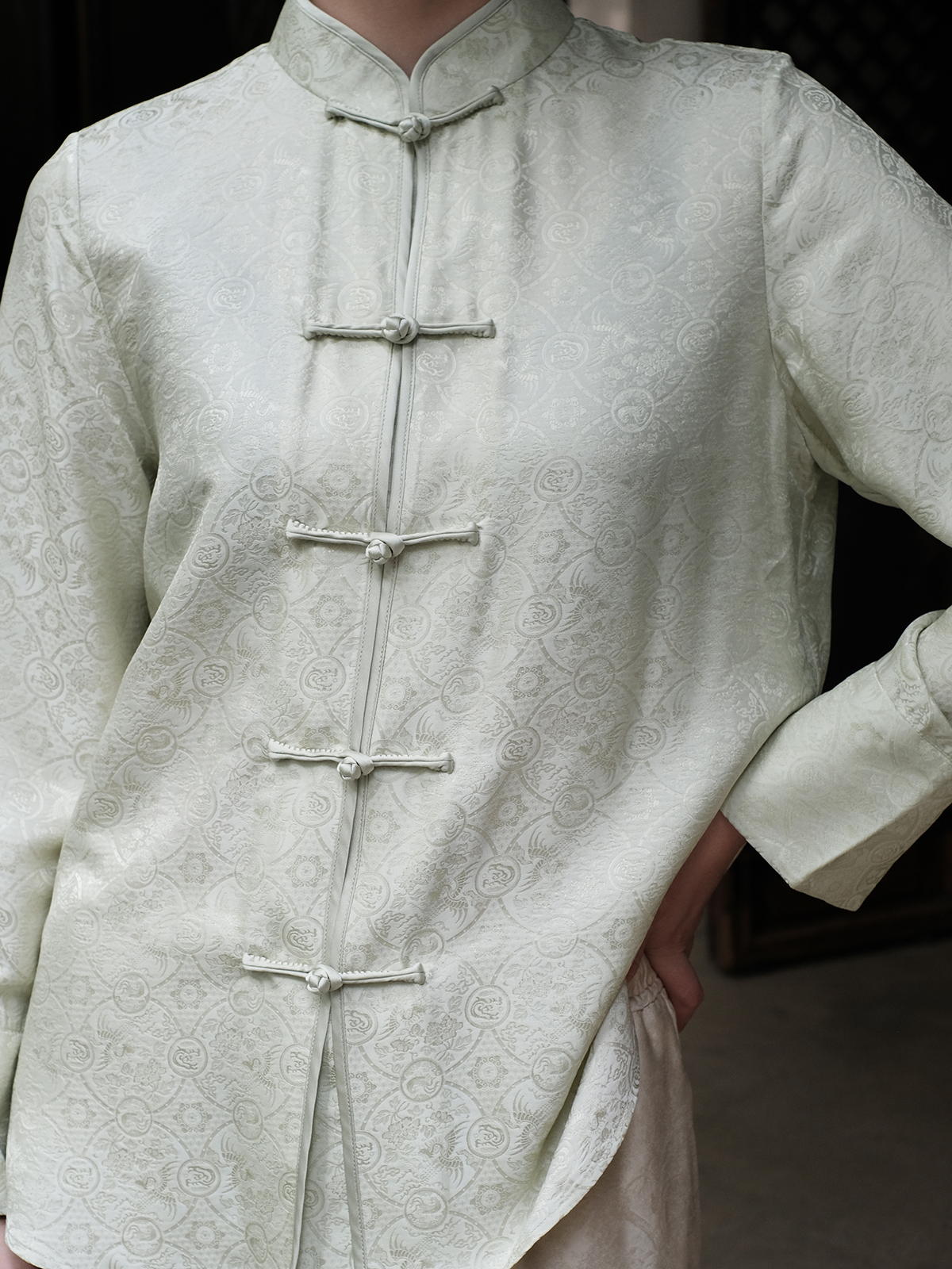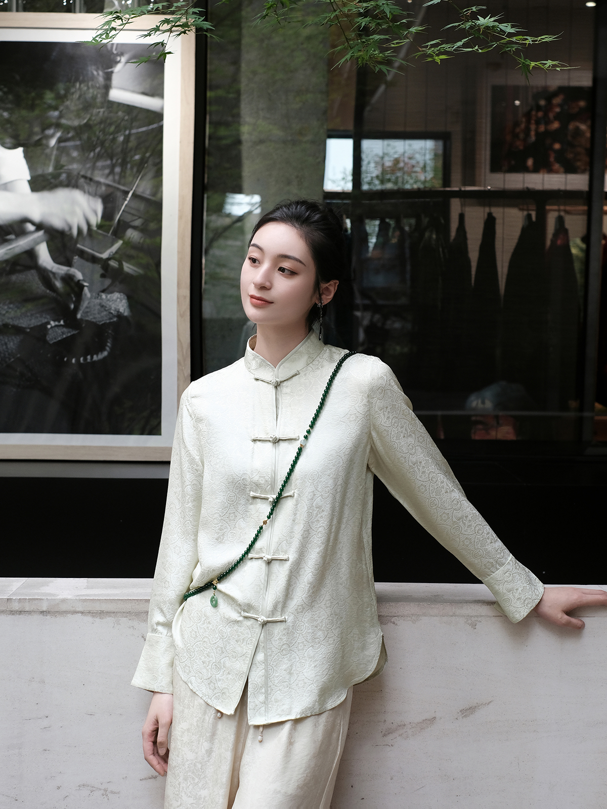 盛唐婧 |真丝花罗百搭对襟衬衫-白绿色
