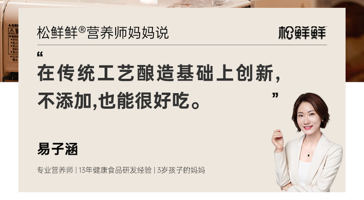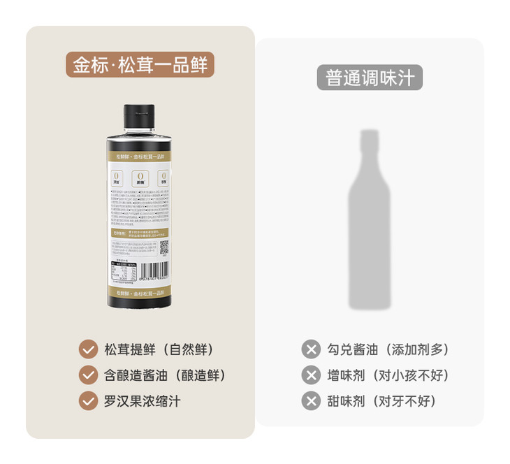 松鲜鲜的金牌松茸一品鲜,在传统工艺酿造的基础上做升级,融入香格里拉松茸原鲜,代替增味剂提鲜;同时精选非转基因东北大豆,制作过程中保留了豆类的油脂,真正做到有酱也有油;生产过程中更是坚持一惯的0添加,0防腐剂(苯甲酸钠、山梨酸钾)、0添加甜味剂(糖精钠、甜蜜素)、0添加蔗糖,还通过了SGS权威检测203项保证0农残,纯食物提鲜,吃得更放心!