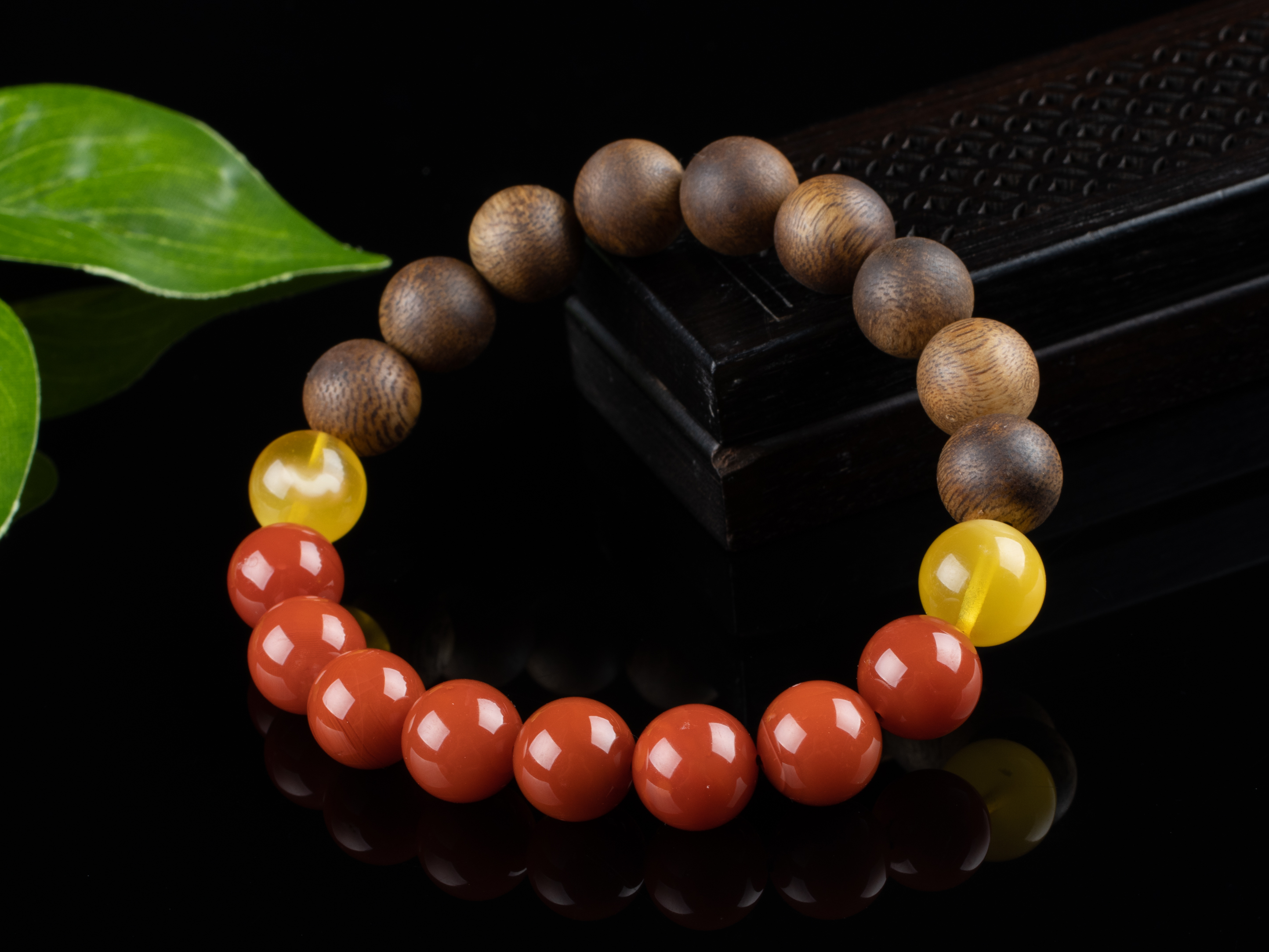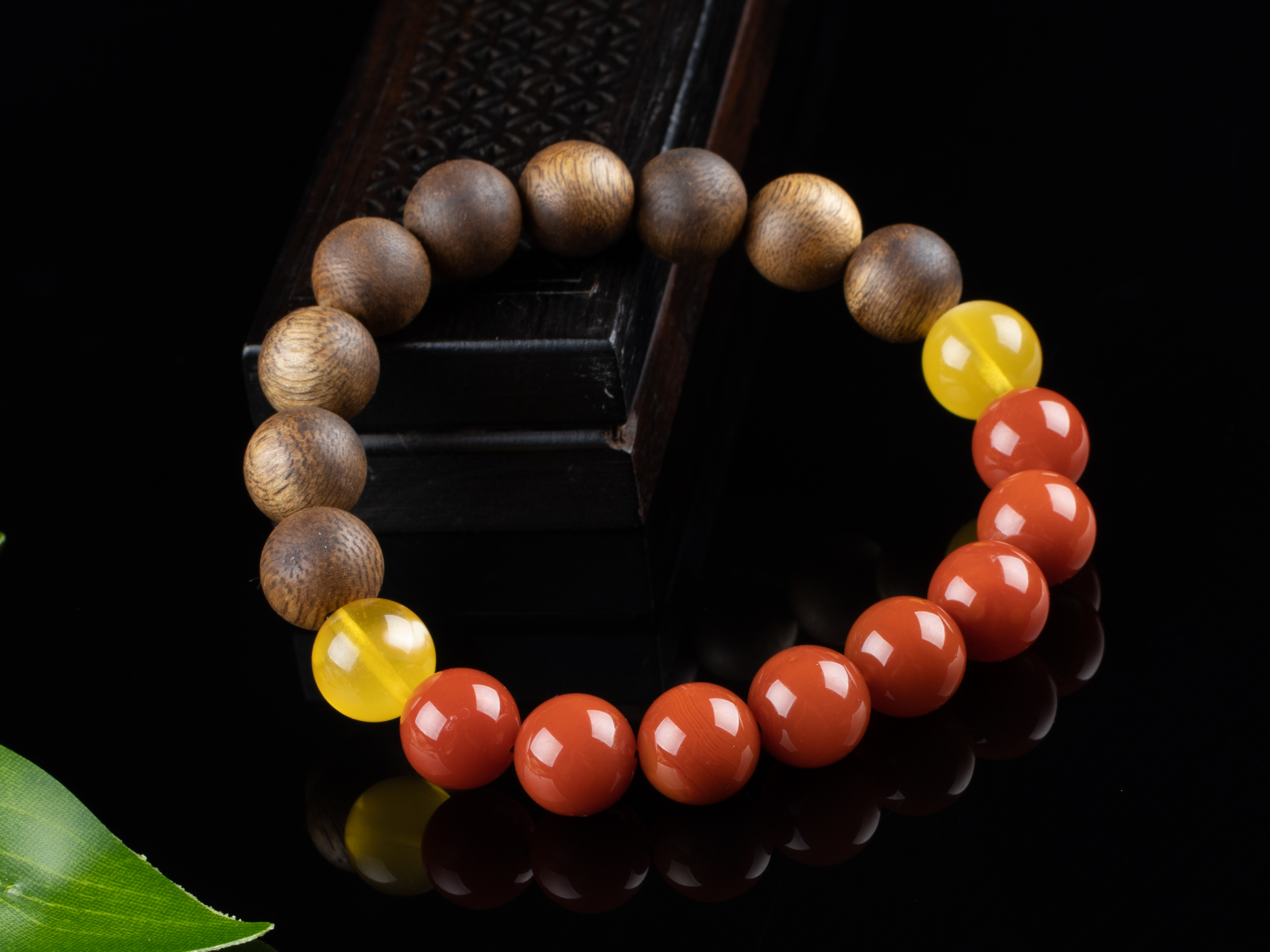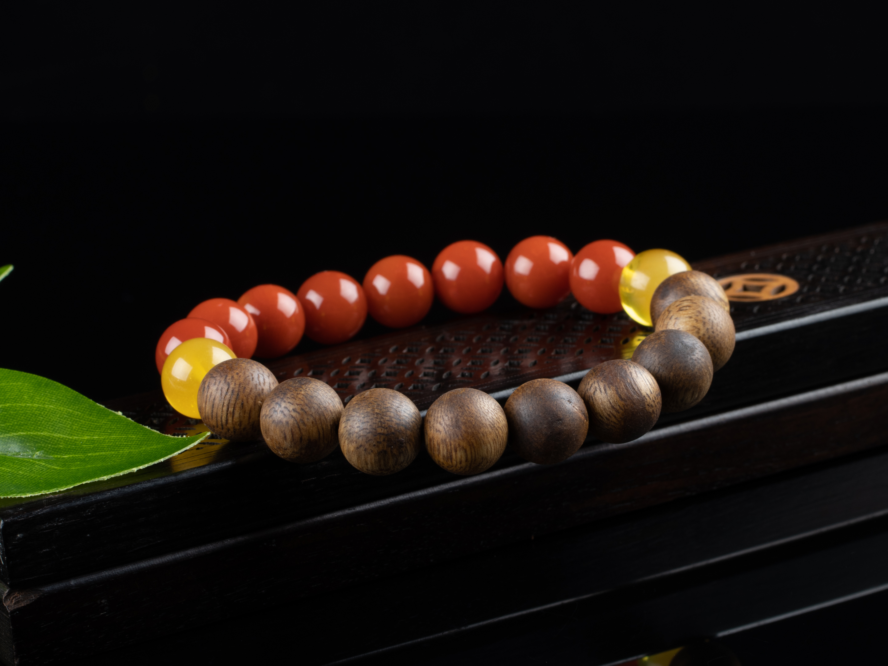 XY0126沉香南红蜜蜡手串,天然沉香圆珠10.3mm,原色原味,香味自然清甜,8颗满色满肉的南红,2颗金黄色蜜蜡,与原色沉香形成鲜明的碰撞,古色古香的韵味。
