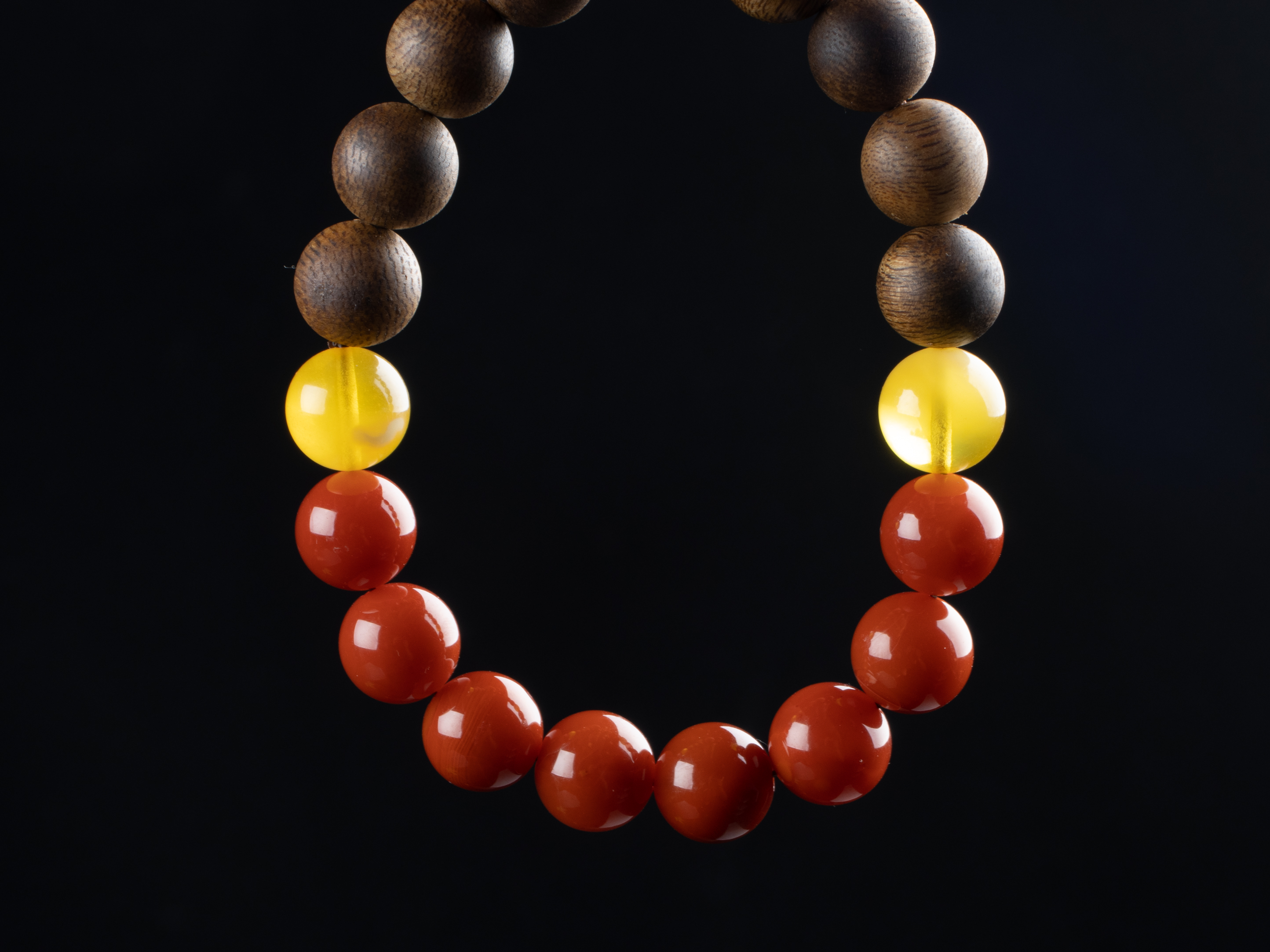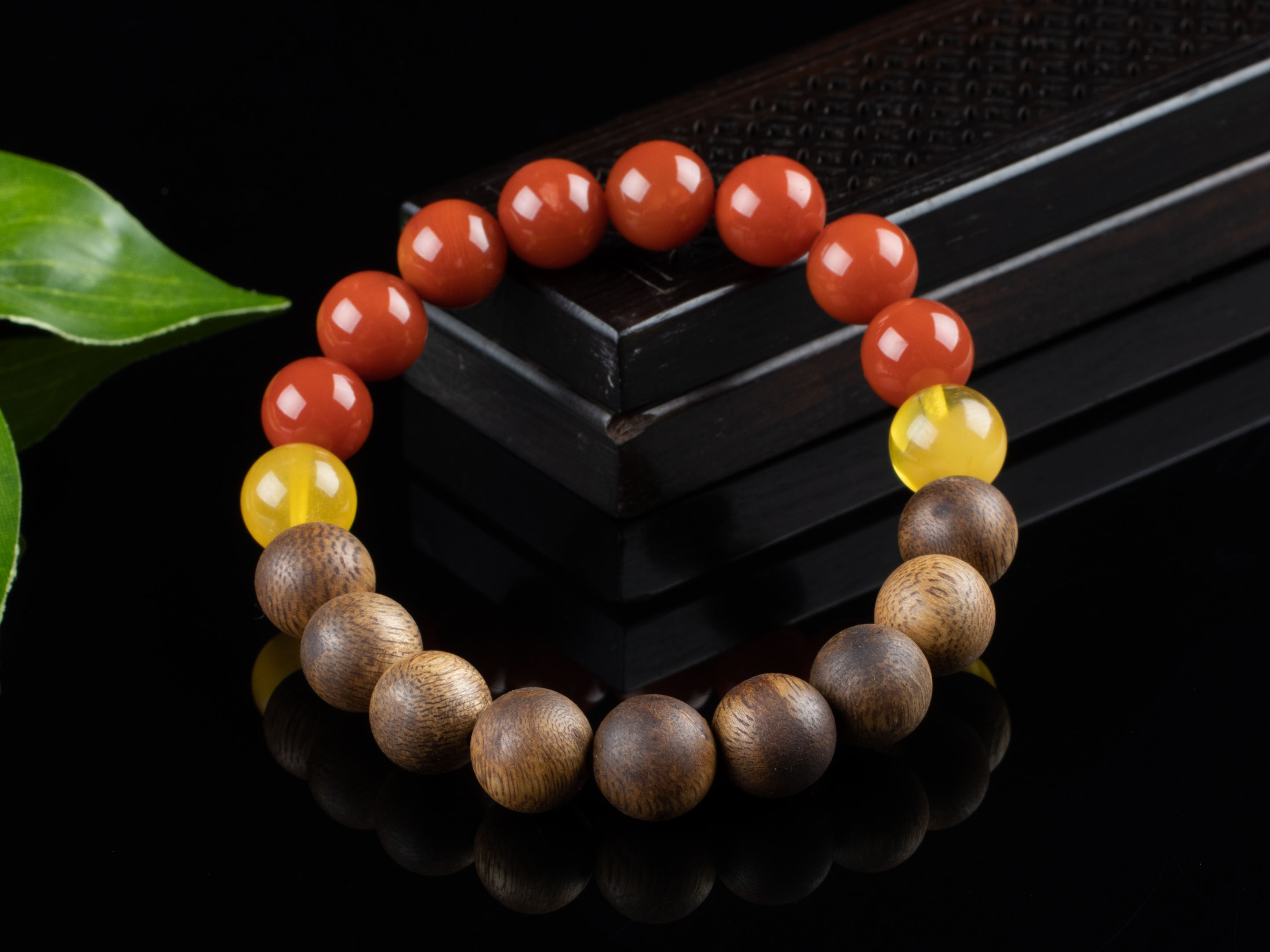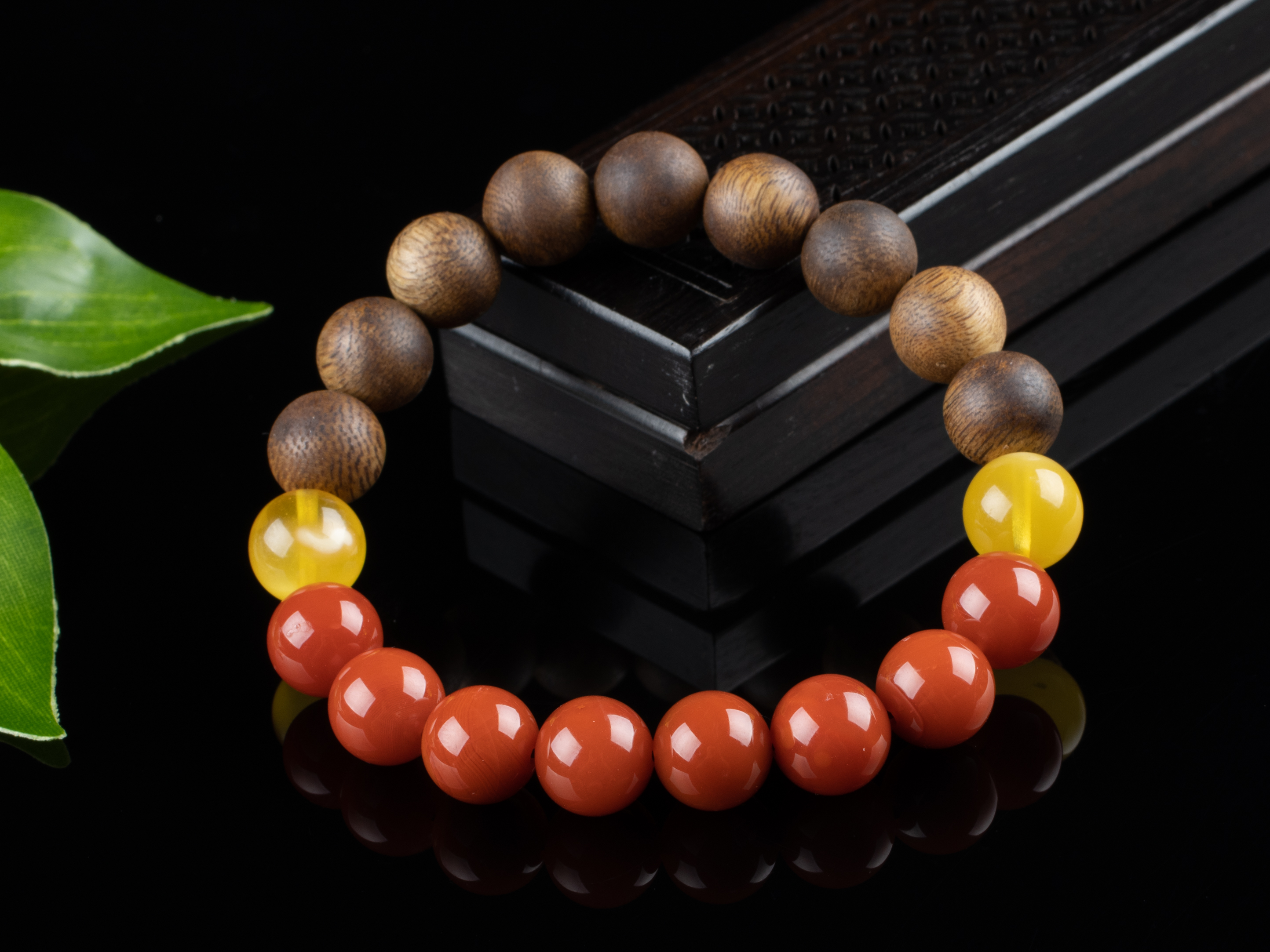 XY0126沉香南红蜜蜡手串,天然沉香圆珠10.3mm,原色原味,香味自然清甜,8颗满色满肉的南红,2颗金黄色蜜蜡,与原色沉香形成鲜明的碰撞,古色古香的韵味。