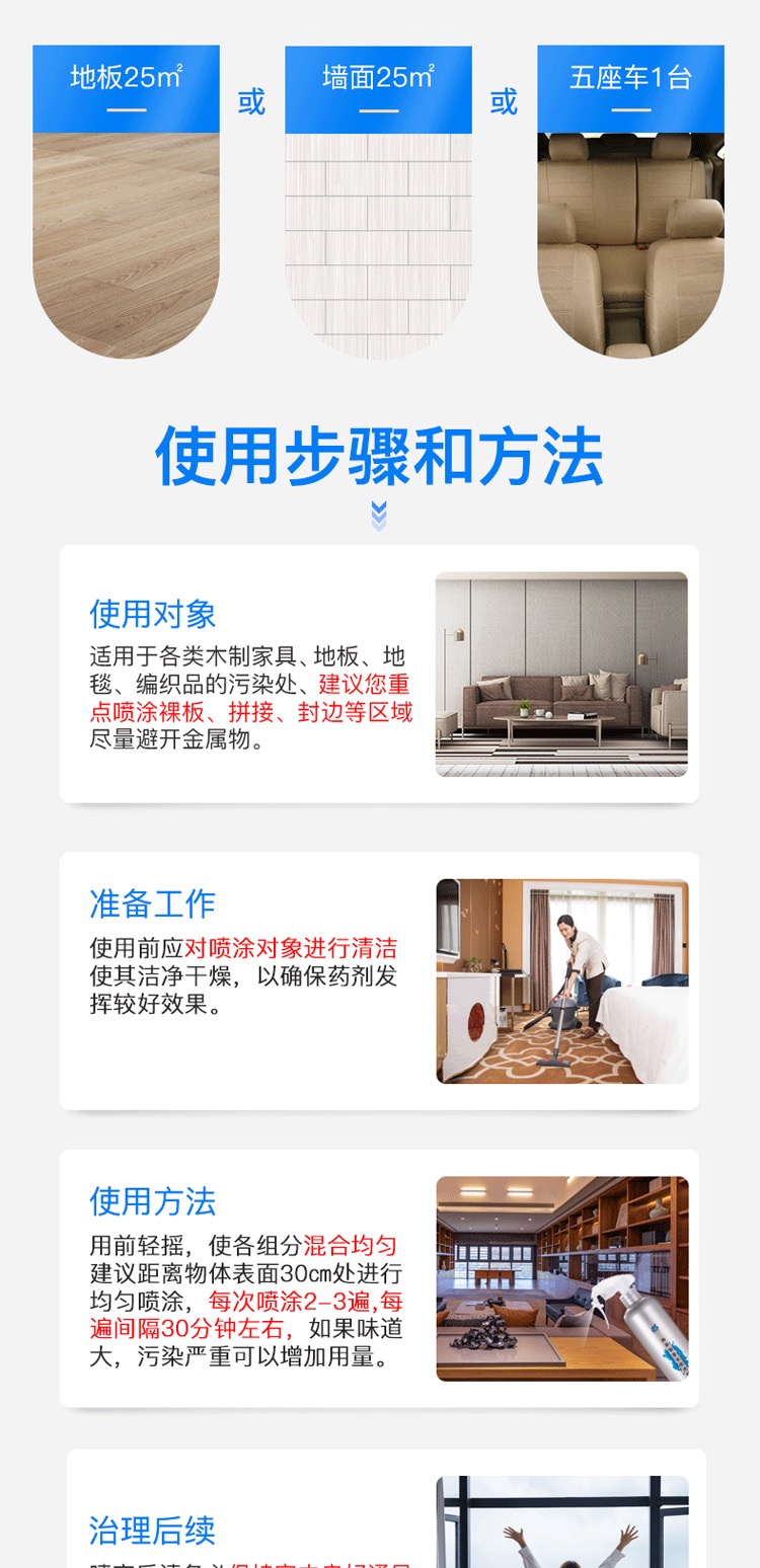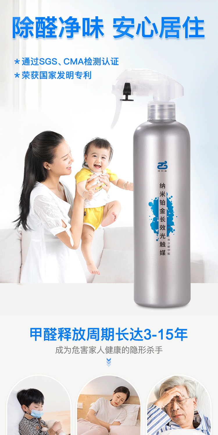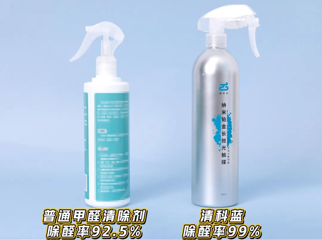 比如新装修的墙面和地板,就可以用清科蓝纳米铂金长效光触媒进行喷涂除醛。