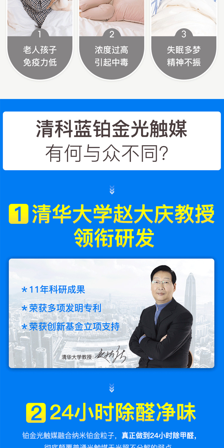 清科蓝纳米铂金长效光触媒是由清华大学赵大庆教授联合了多位优秀技术人员研发所得。