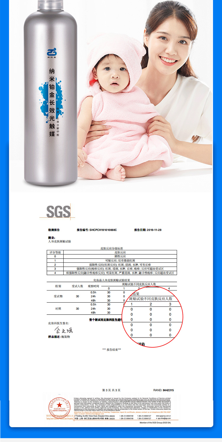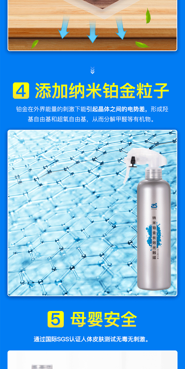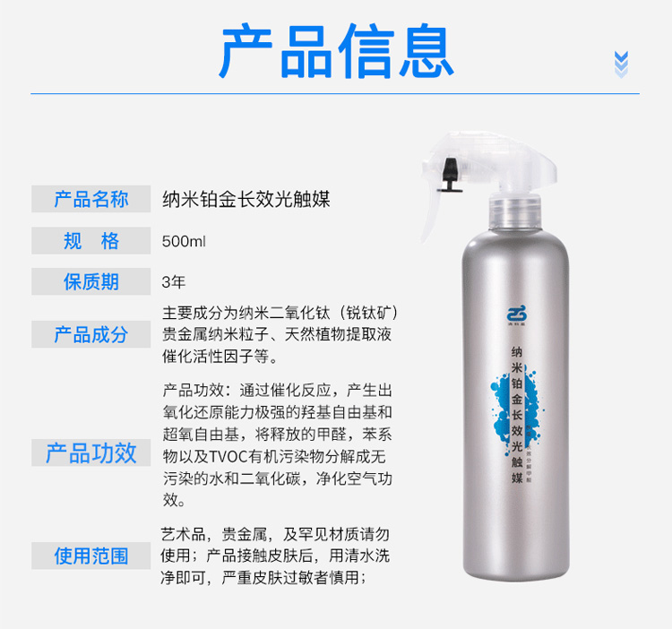 而清科蓝纳米铂金长效光触媒中特别添加了纳米铂金粒子,有光无光都能分解甲醛,除醛效果更长久。