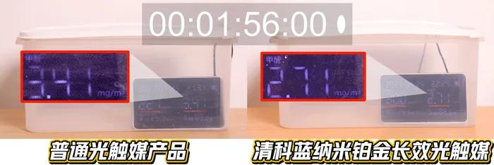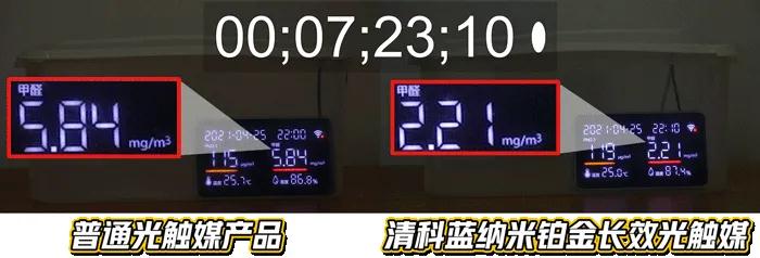 而清科蓝纳米铂金长效光触媒那边的甲醛浓度降到2.71mg/m³,比普通产品低了0.7mg/m³。