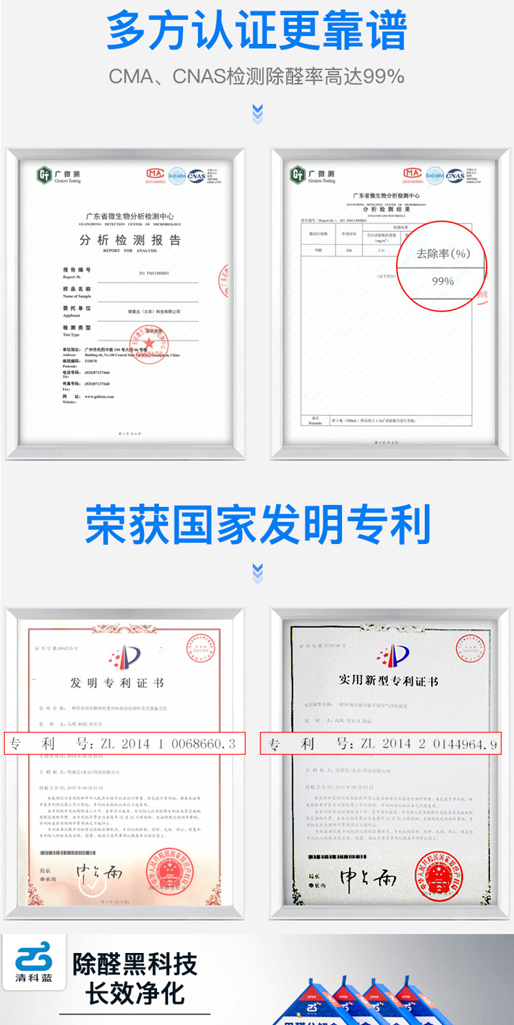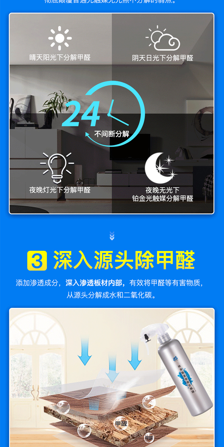所以要安利一款除甲醛的产品——清科蓝纳米铂金长效光触媒。不仅在晚上无光的环境也能分解甲醛,而且除醛率99%,比市面上的除醛产品高。