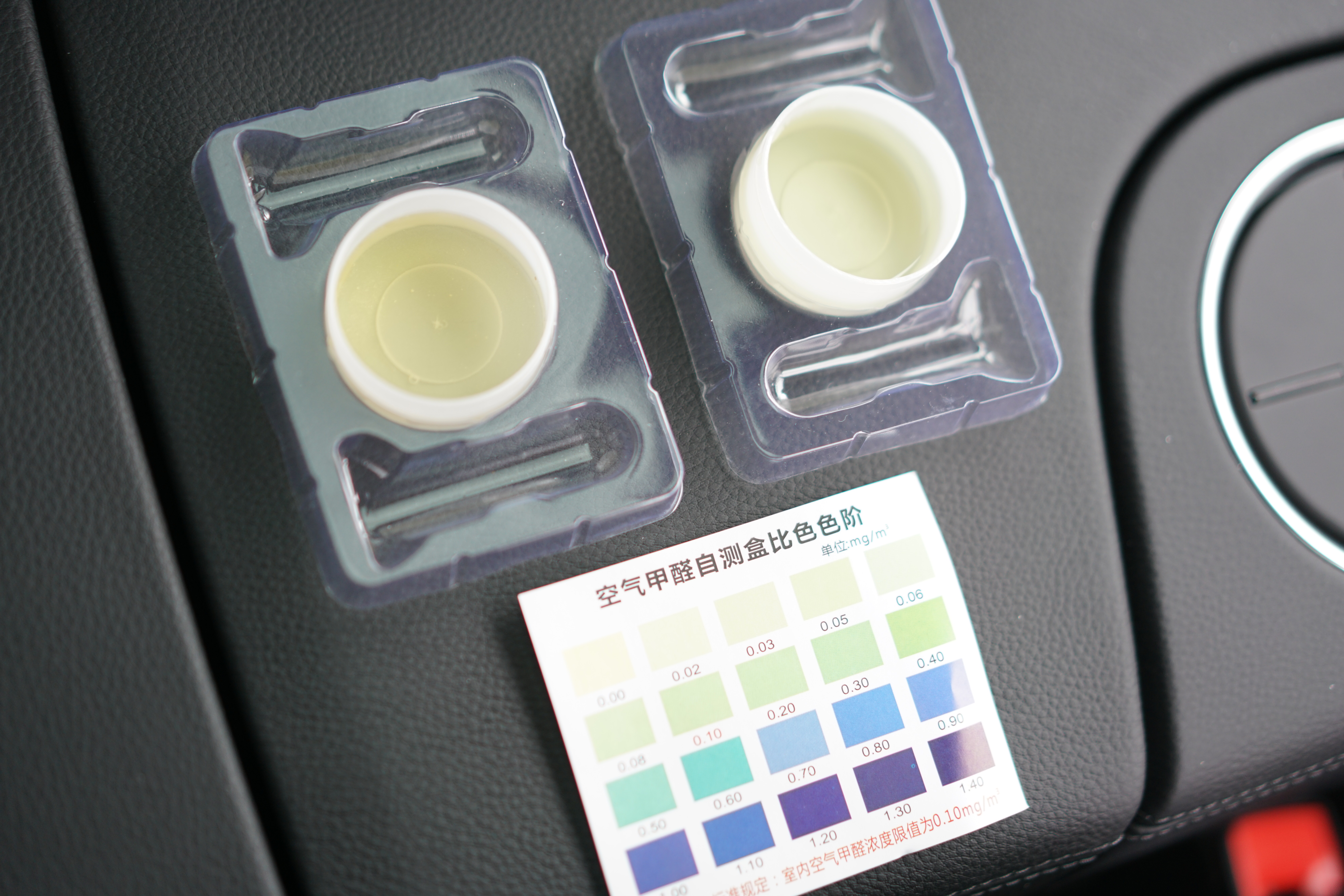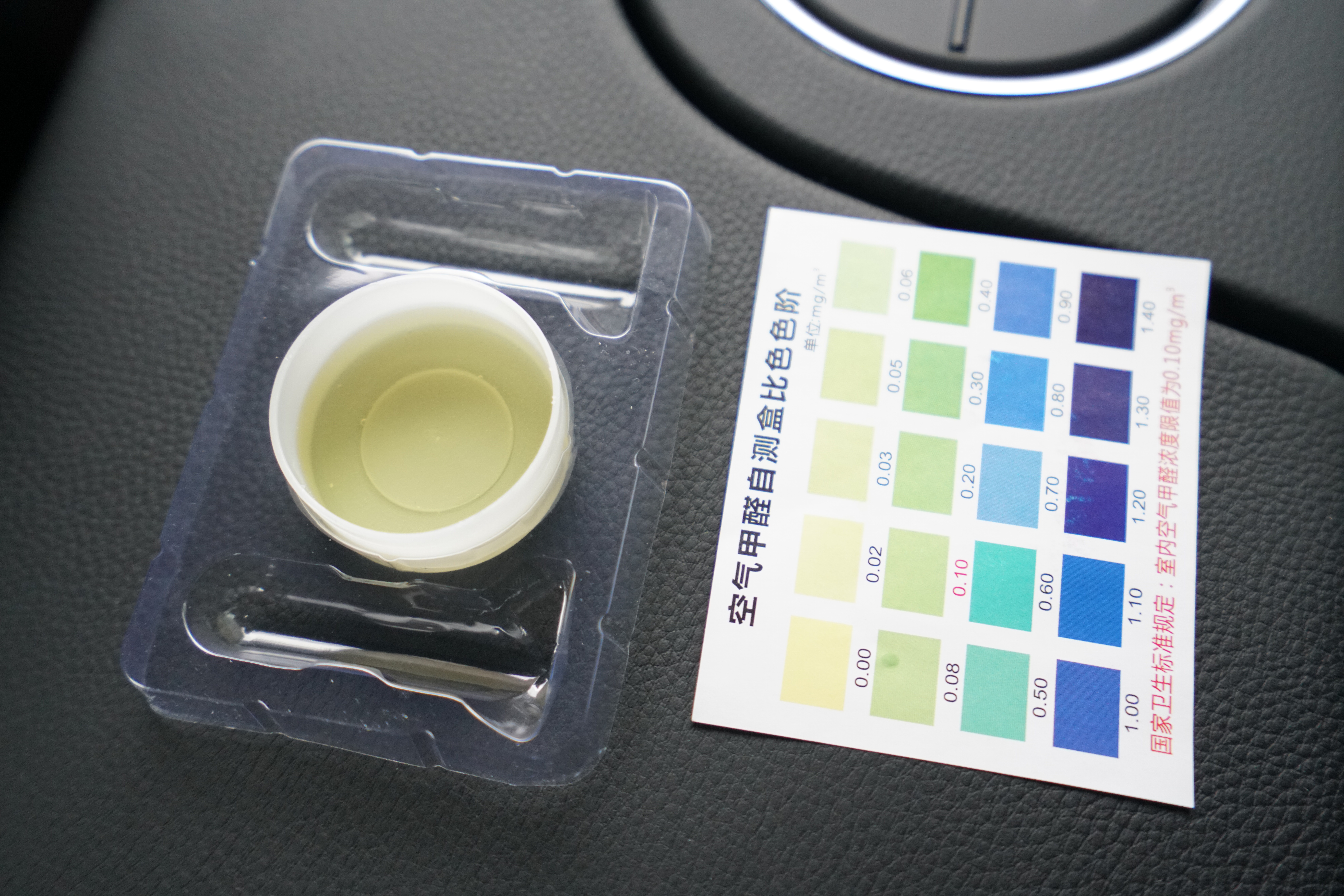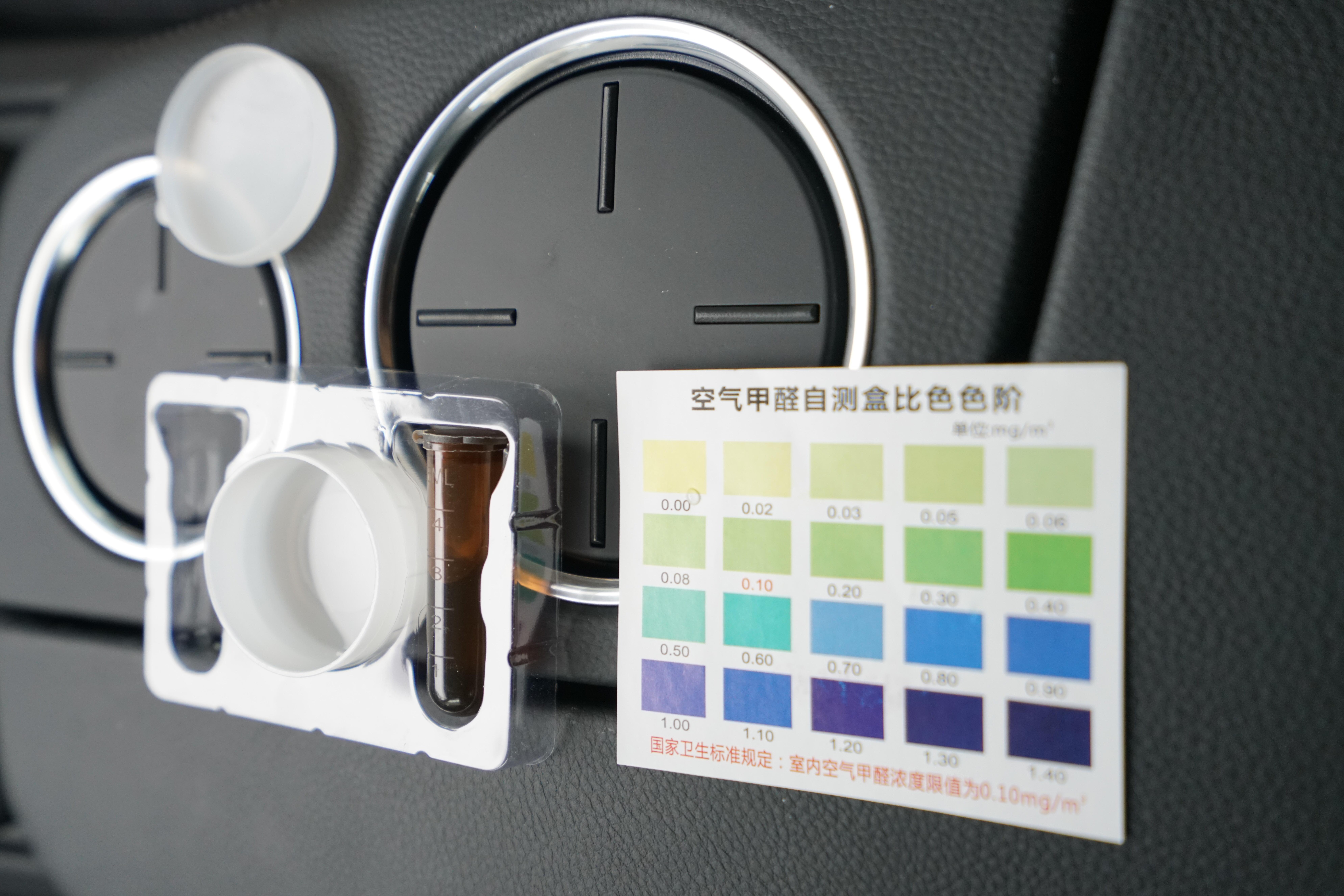 测试结果是,根据现场的测试盒内液体颜色,车内空气甲醛浓度时0.02mg/立方米,没有超标。