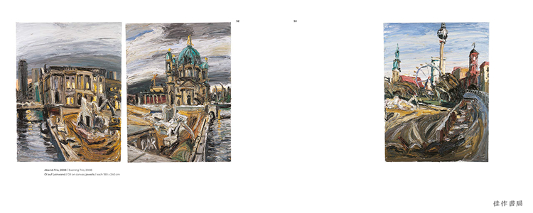 莱姆普弗一年四季数次来到几个相同的地点,用十年时间记录下这一庞大的建设项目。他创作的宏伟景观呈现了一座大都市的生命周期。莱姆普弗在各种天气下,现场完成所有的作品,画中厚重的、旋转的笔触展现出城市里不断变化的能量。莱姆普弗工作时的幕后照片展示了其标志性的绘画技法——直接用手在画布上涂抹大量的颜料,并揭示了其创作中纯粹的物性。这一系列的作品可谓是一封写给柏林的情书,通过作者独特的艺术视角呈现了重新规划和建造一座城市的艰辛。