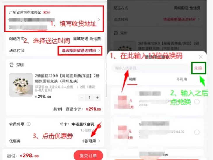 2、填写收货信息,点击优惠券,输入12位兑换码后,点击兑换,完成即可提交订单