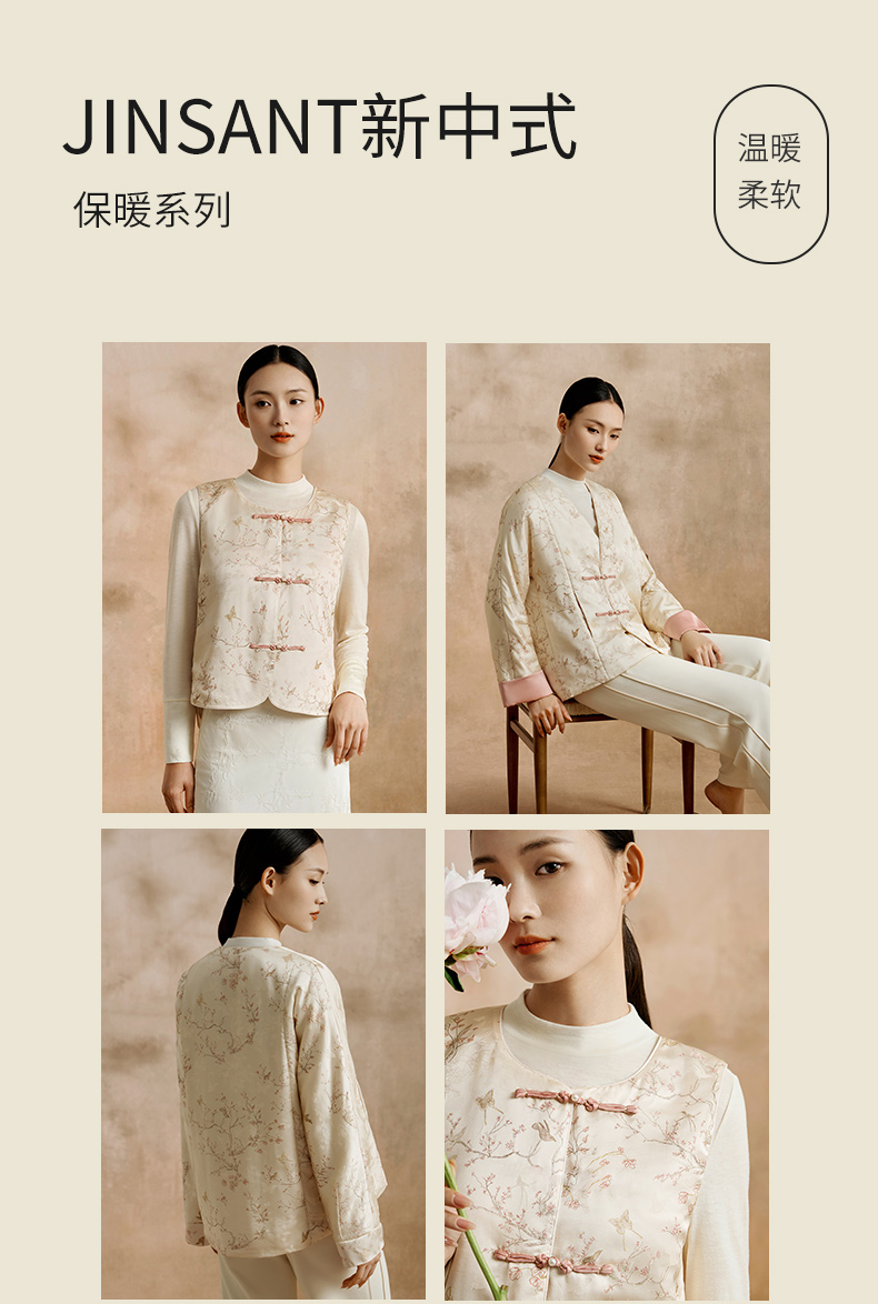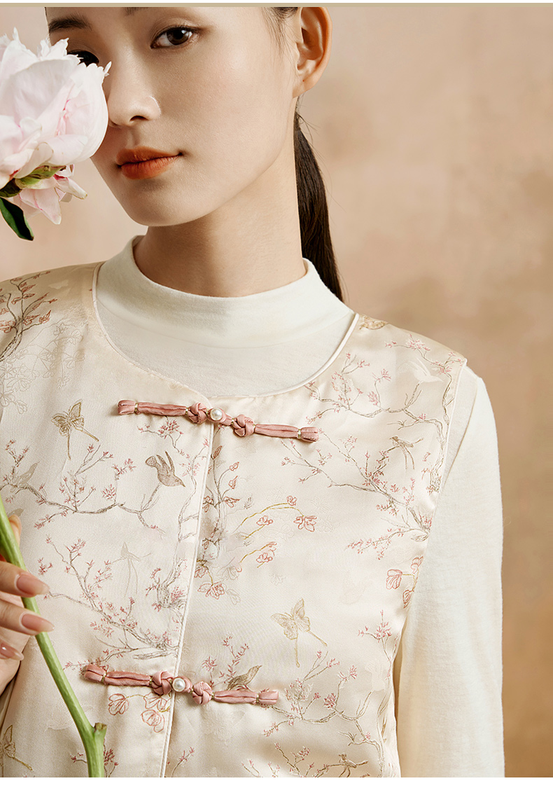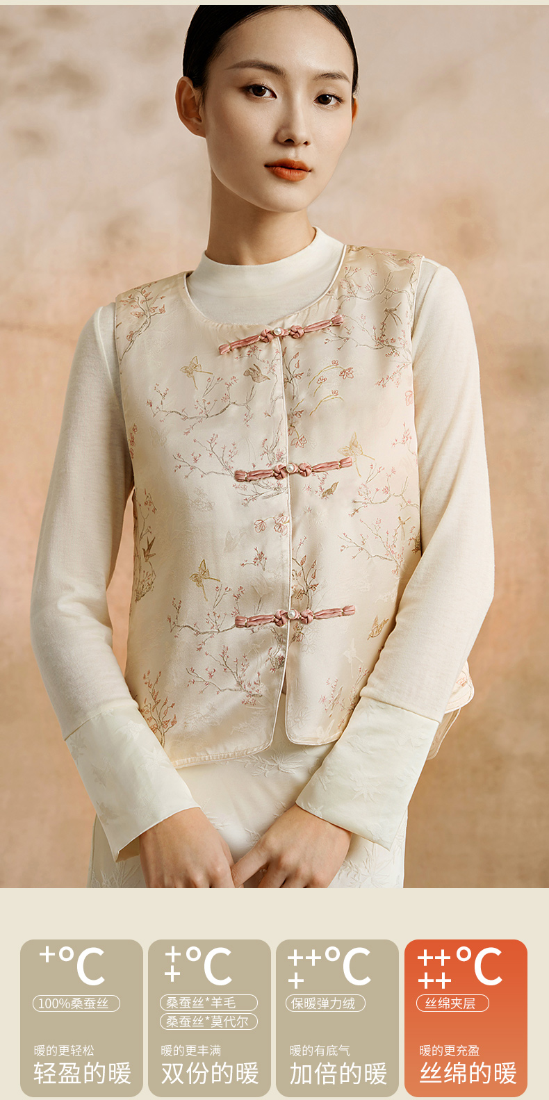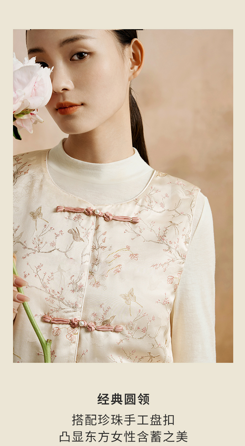 金三塔新中式100%桑蚕丝填充保暖马甲圆领珍珠盘扣秋冬新品上装女 NSFED730