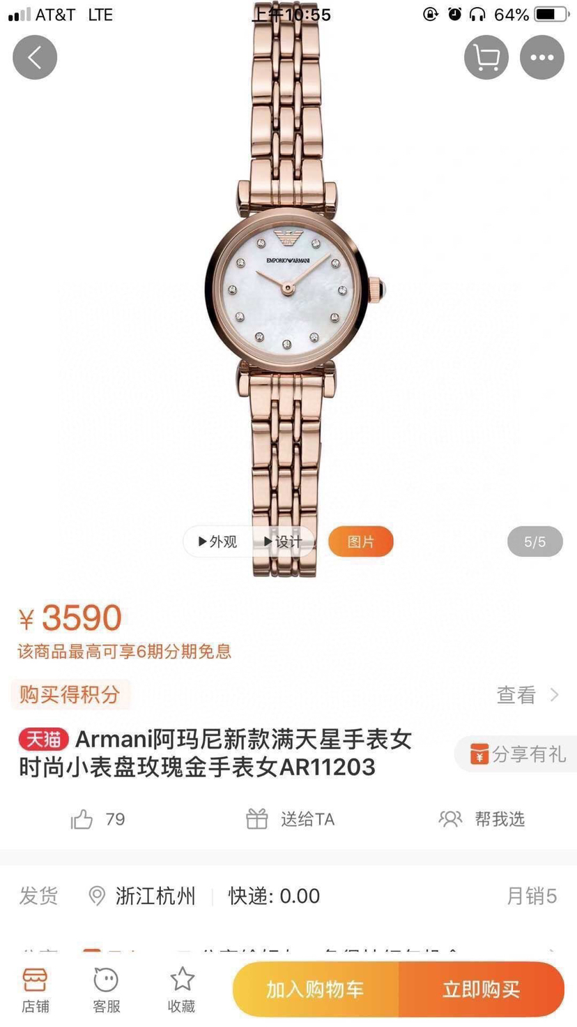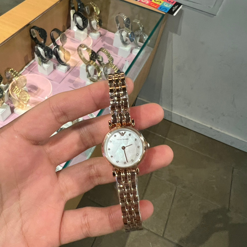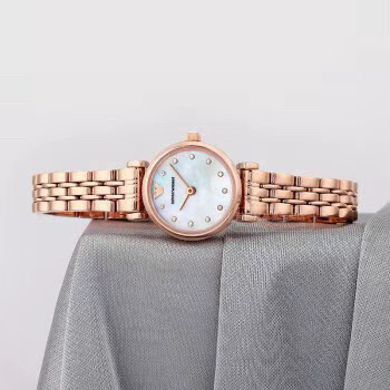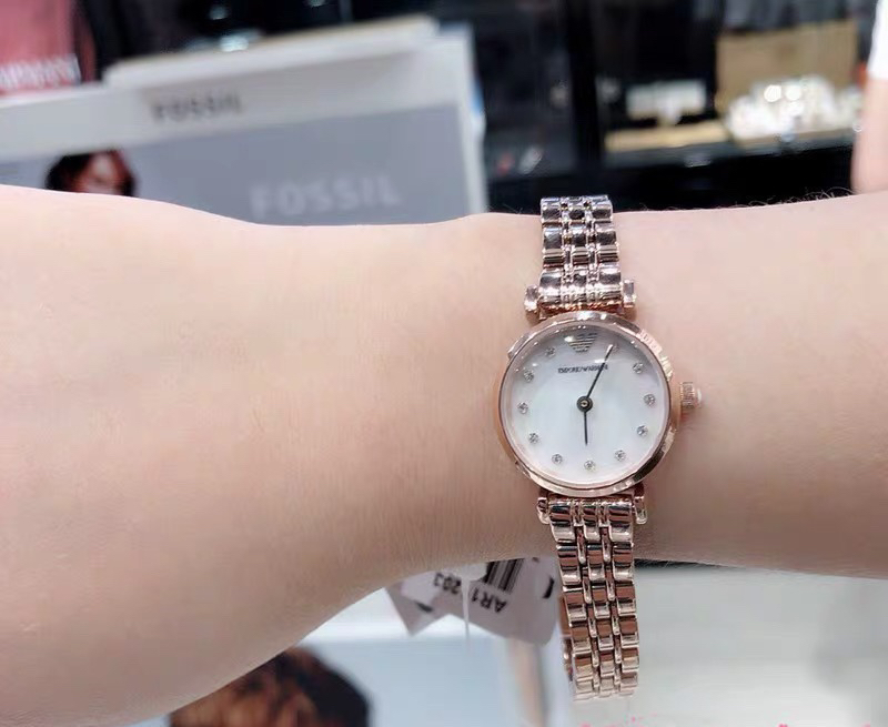 美国现货¥1050直邮!ARMANi阿玛尼ar11203,精致小表盘女表再次爆款,玫瑰金精钢石英腕表 精钢表壳表带 双搭扣设计 表盘直径22mm 石英机芯 生活防水,小人鱼珍珠彩贝表盘点缀着11颗闪亮水晶 表盘设计风格简洁优雅