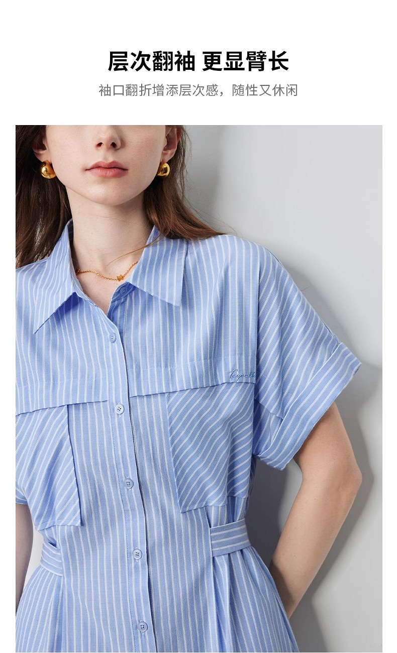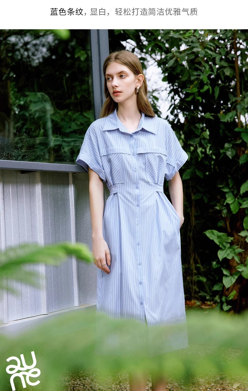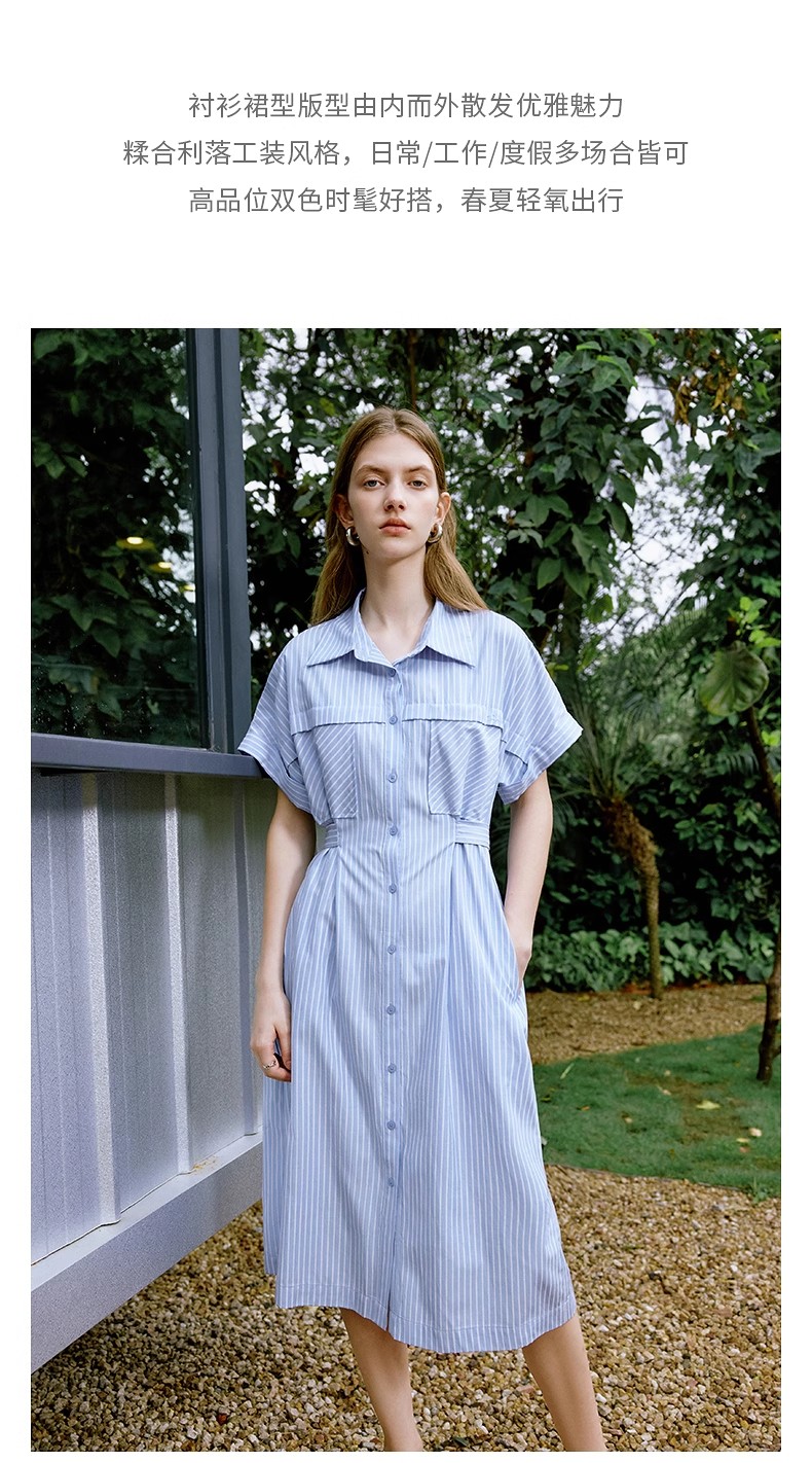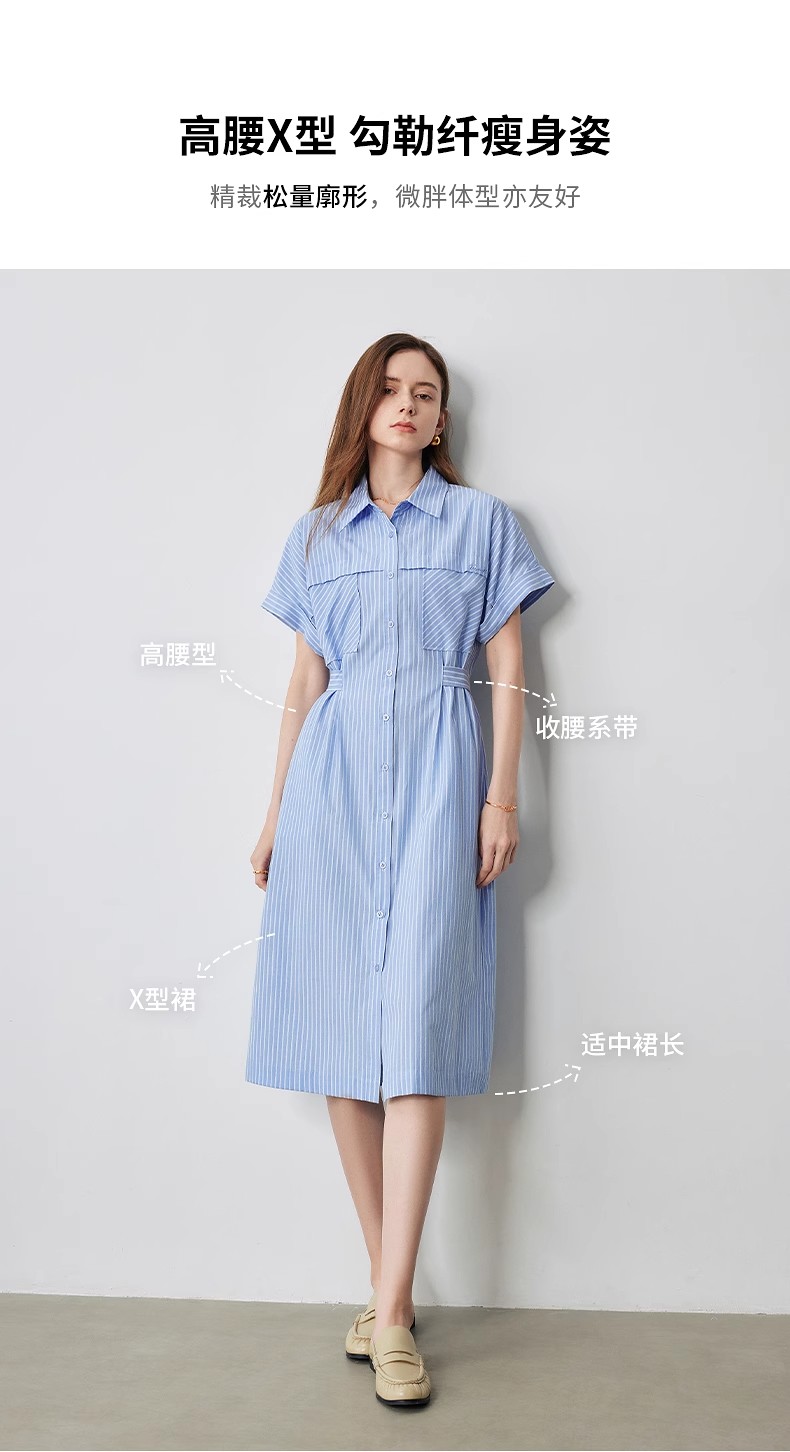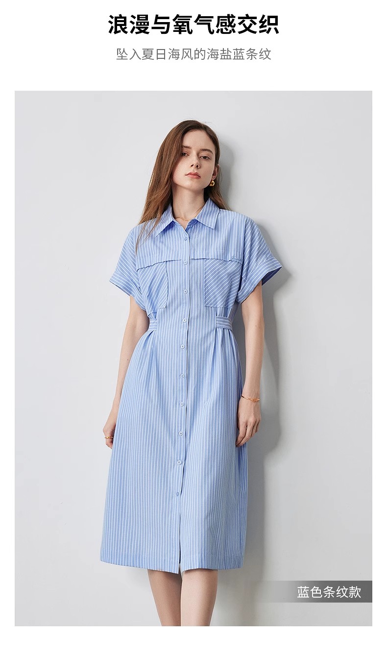 初语条纹衬衫连衣裙女夏季收腰显瘦短袖长裙