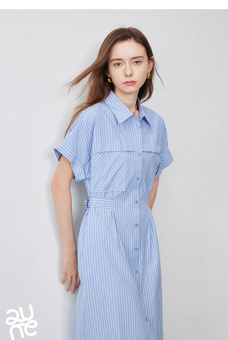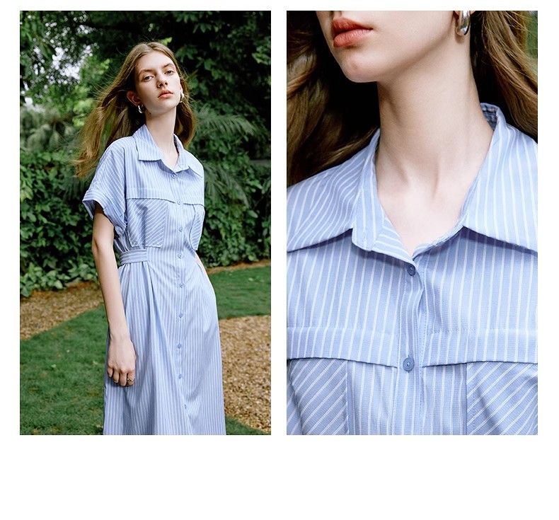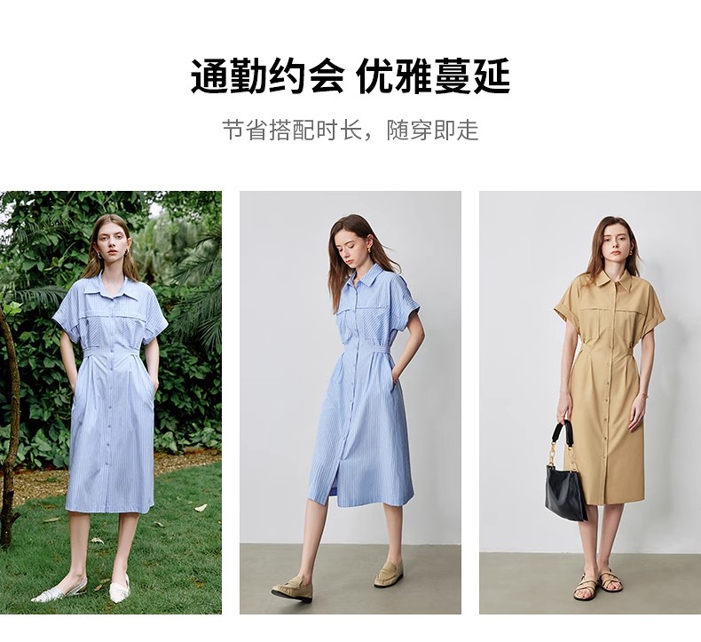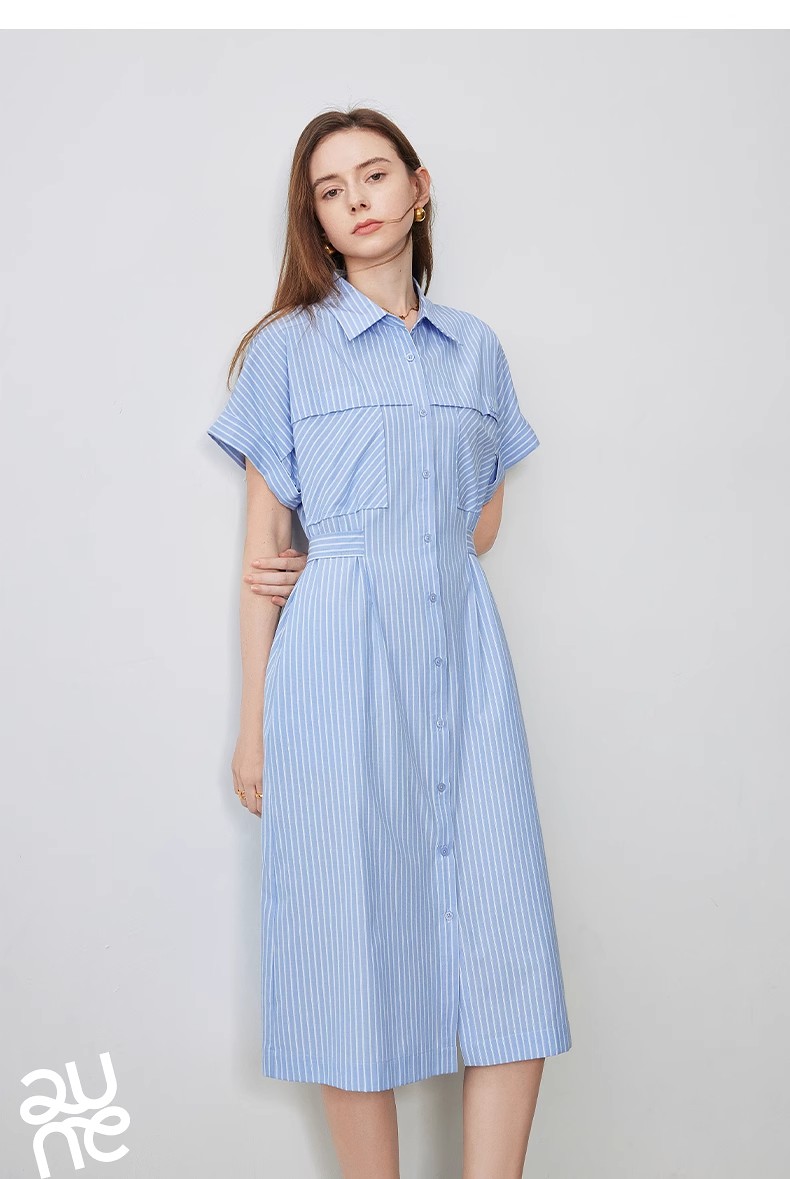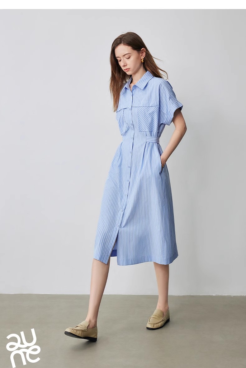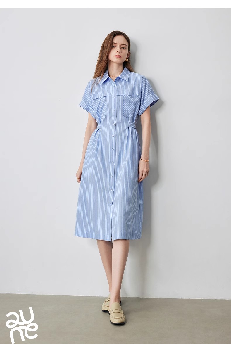 初语条纹衬衫连衣裙女夏季收腰显瘦短袖长裙