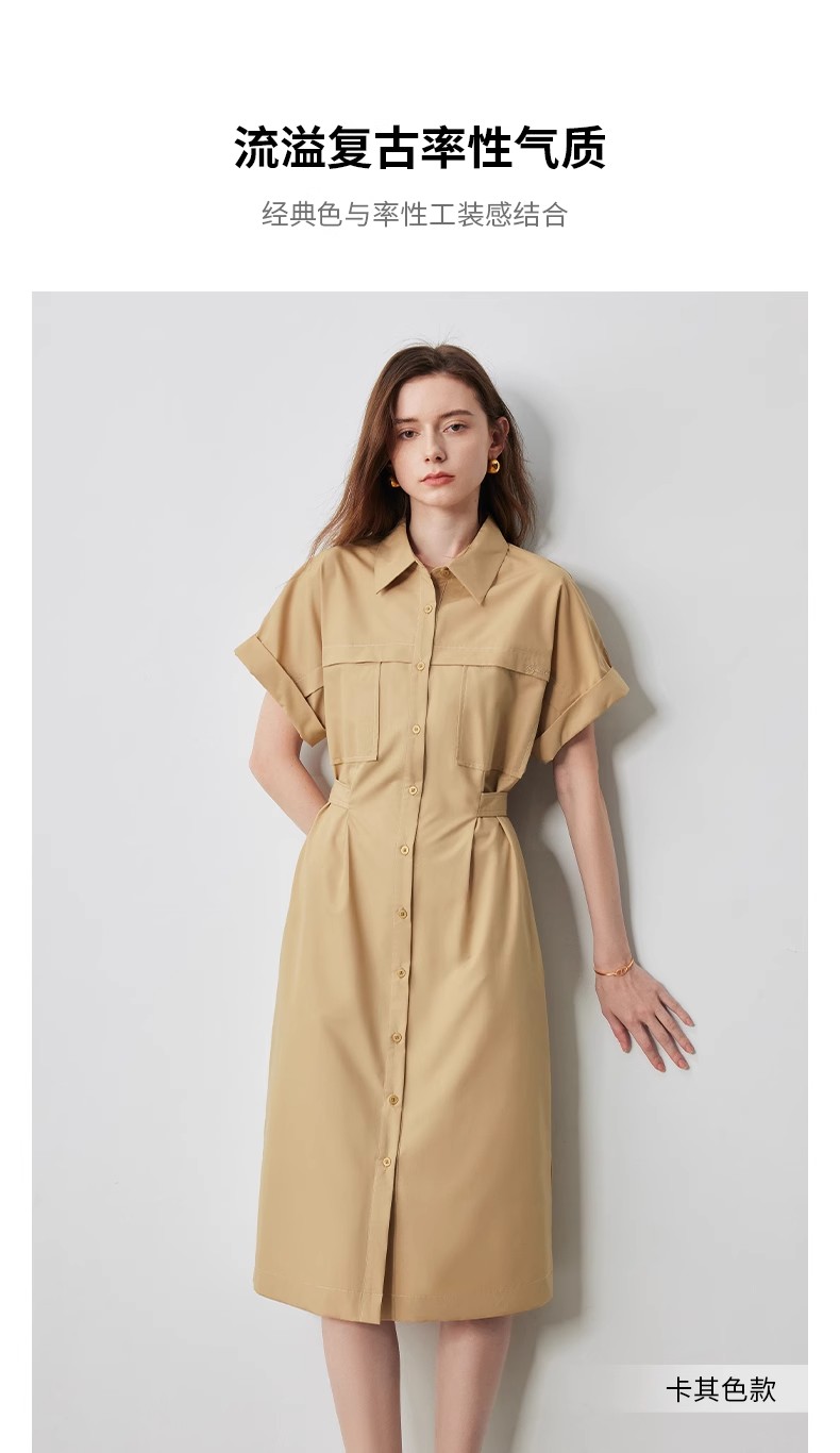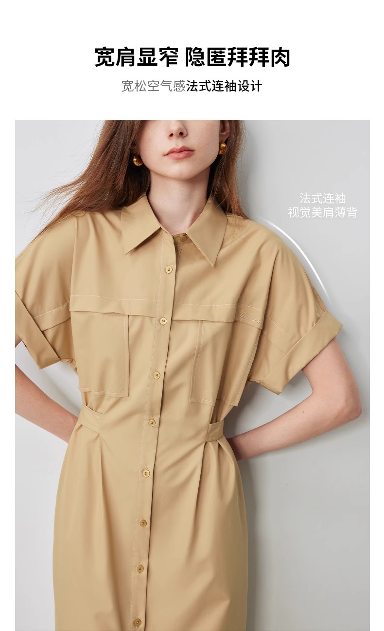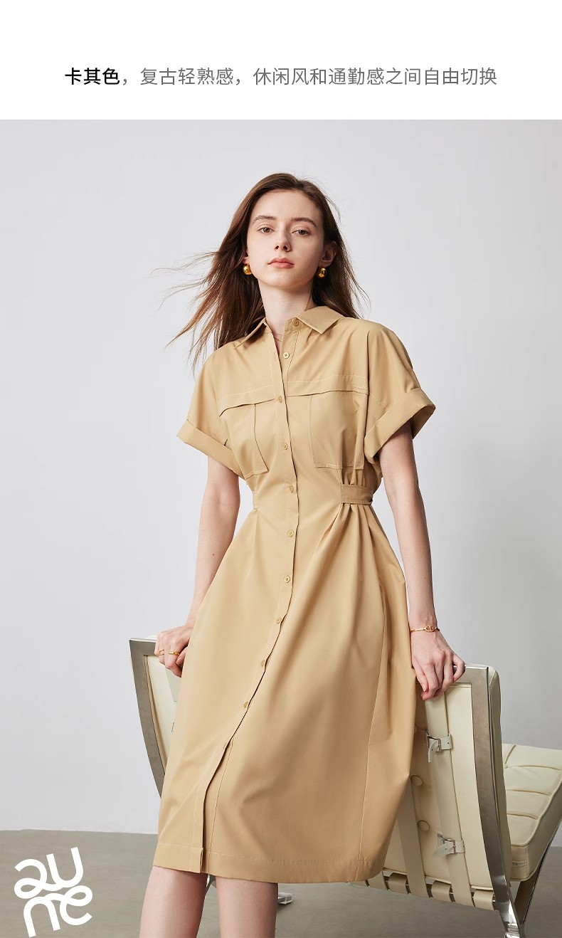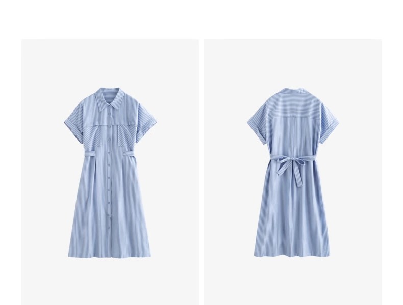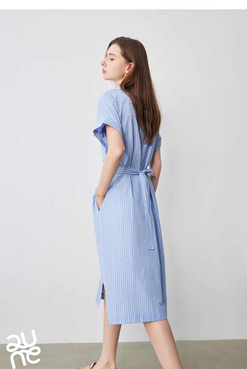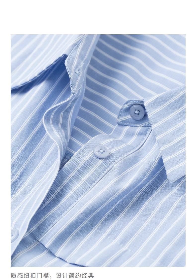 初语条纹衬衫连衣裙女夏季收腰显瘦短袖长裙