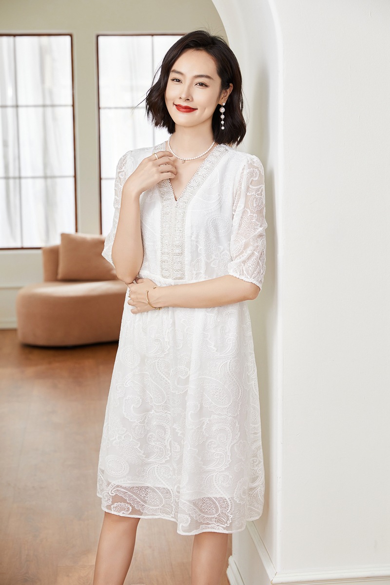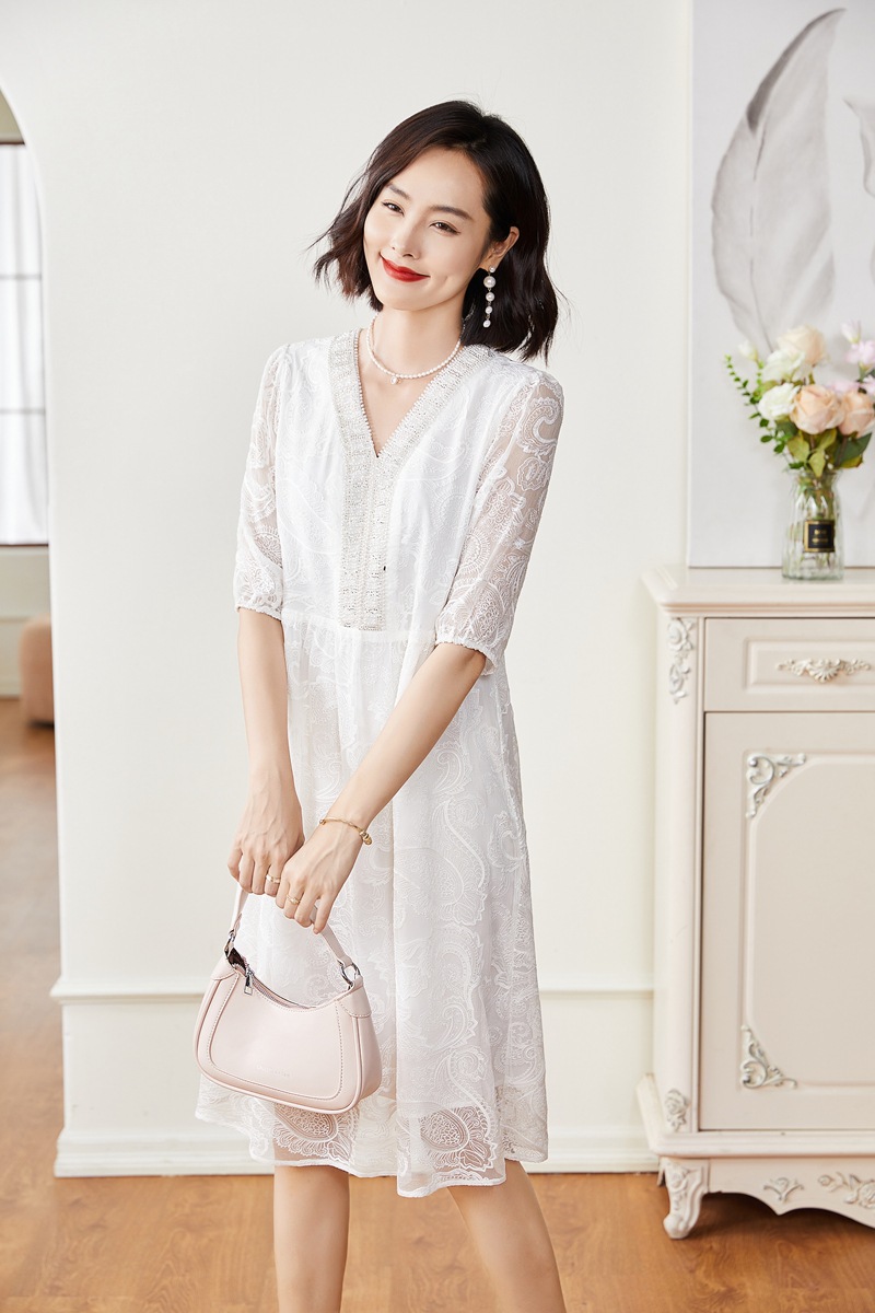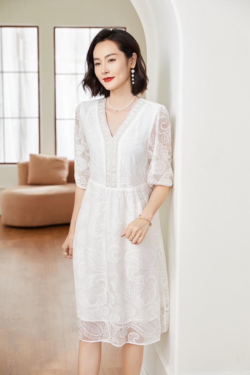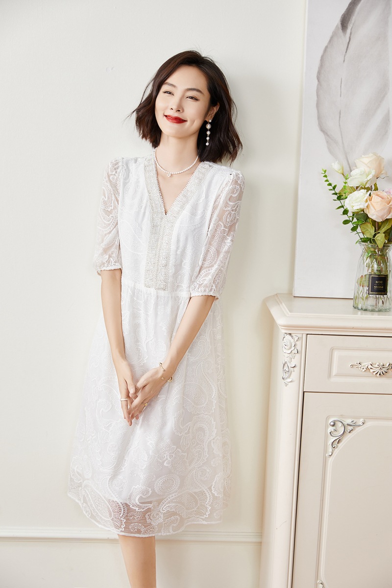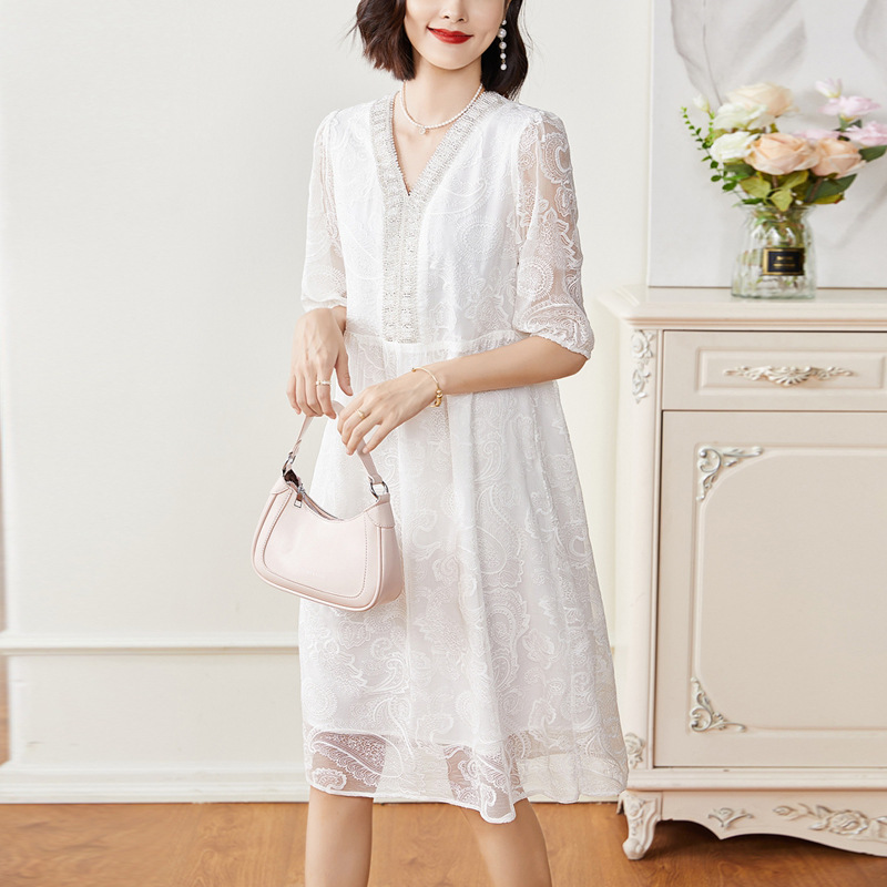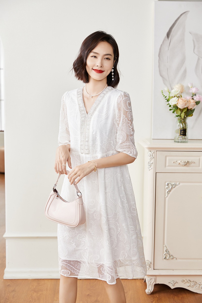 OSL 3513重工刺绣桑蚕丝连衣裙V领气质真丝裙