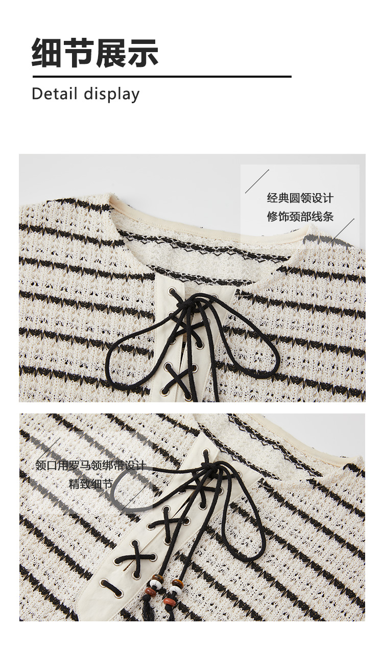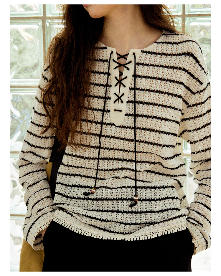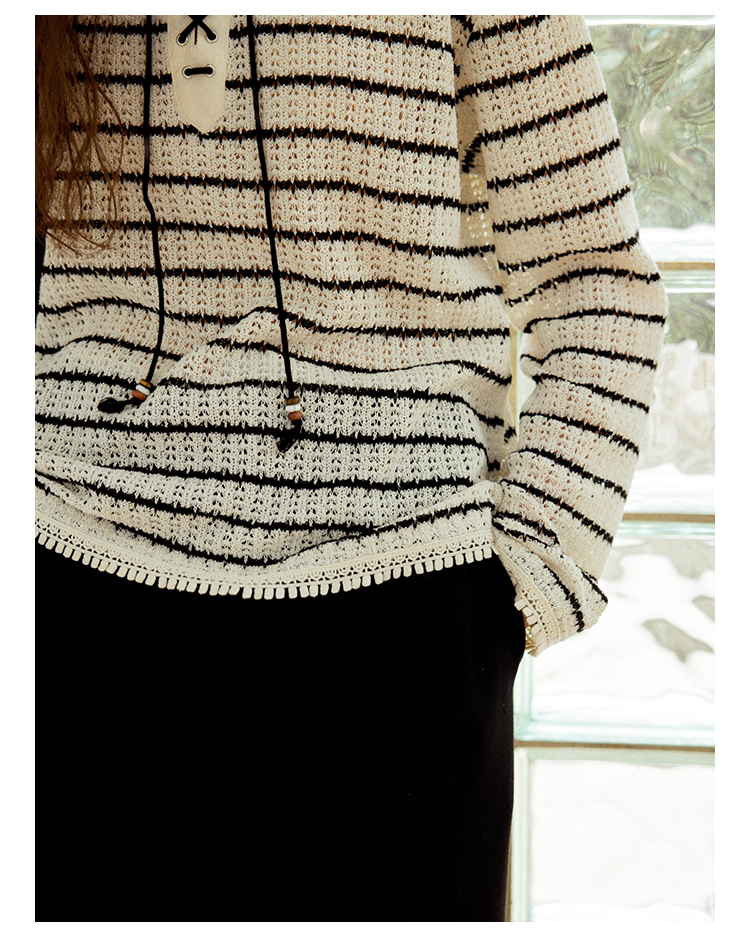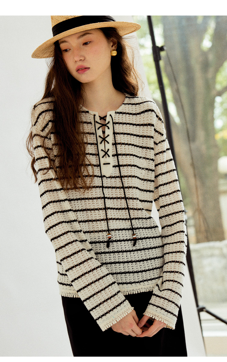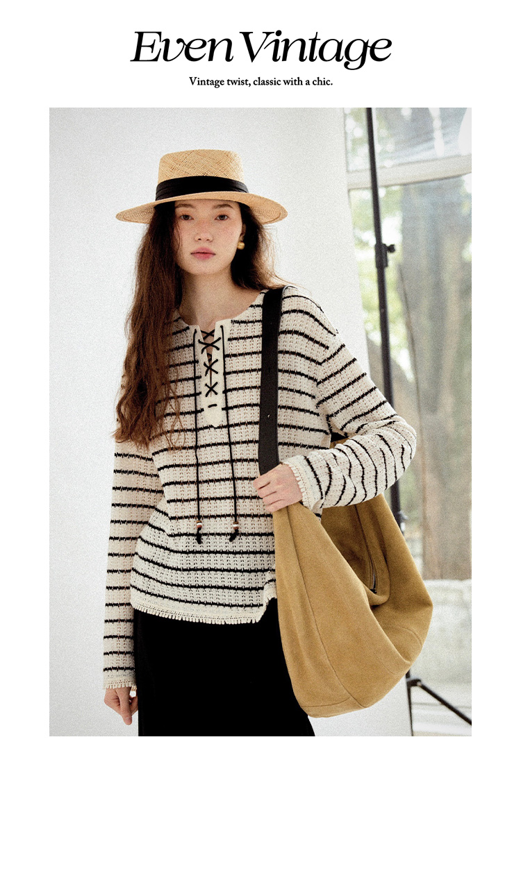 Even Vintage| 复古时髦条纹针织慵懒随性罗马领绑带镂空毛衣罩衫