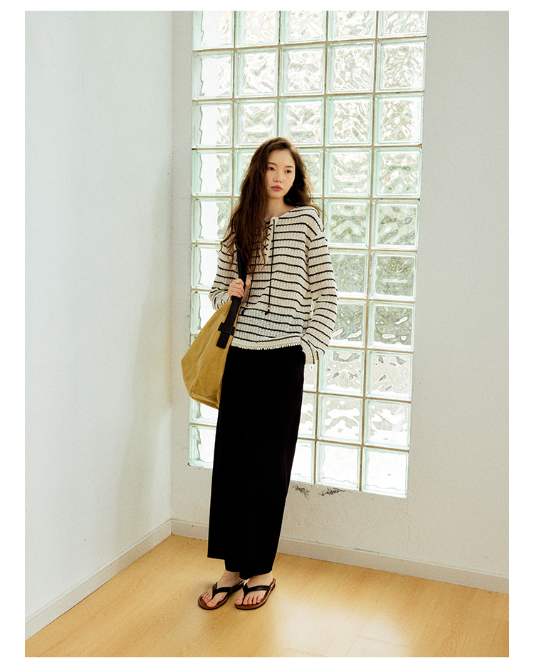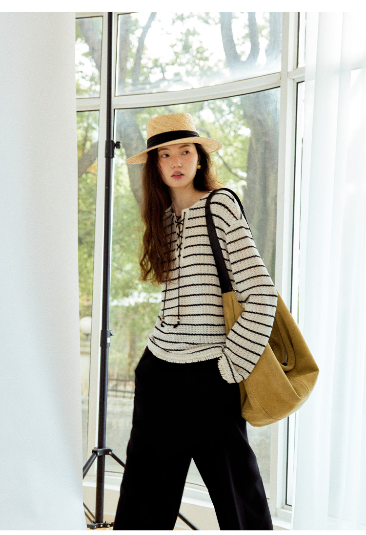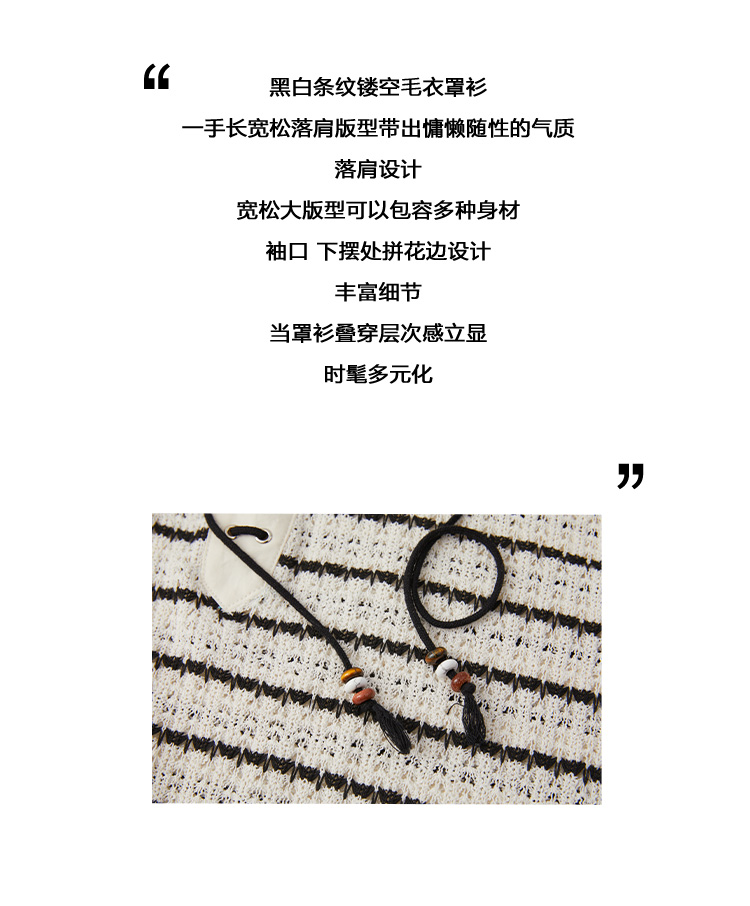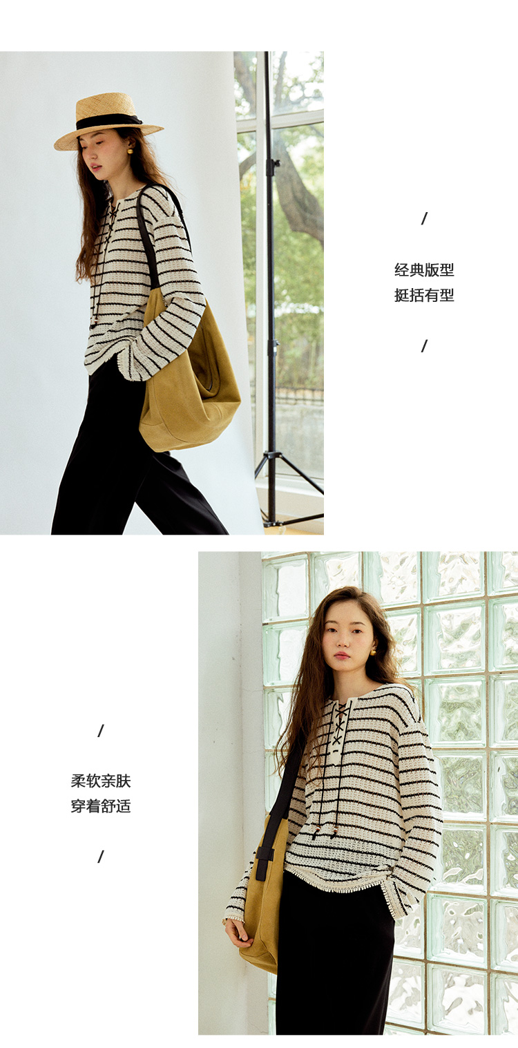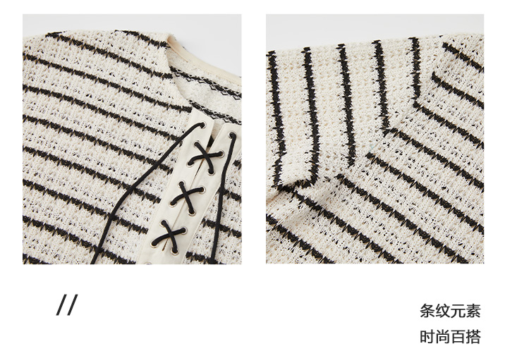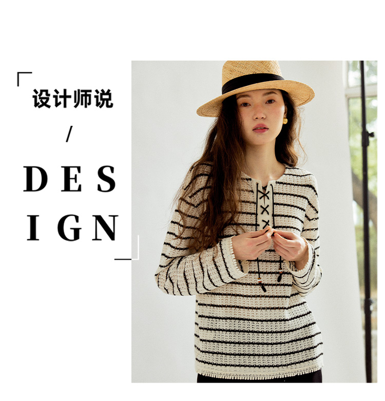 Even Vintage| 复古时髦条纹针织慵懒随性罗马领绑带镂空毛衣罩衫