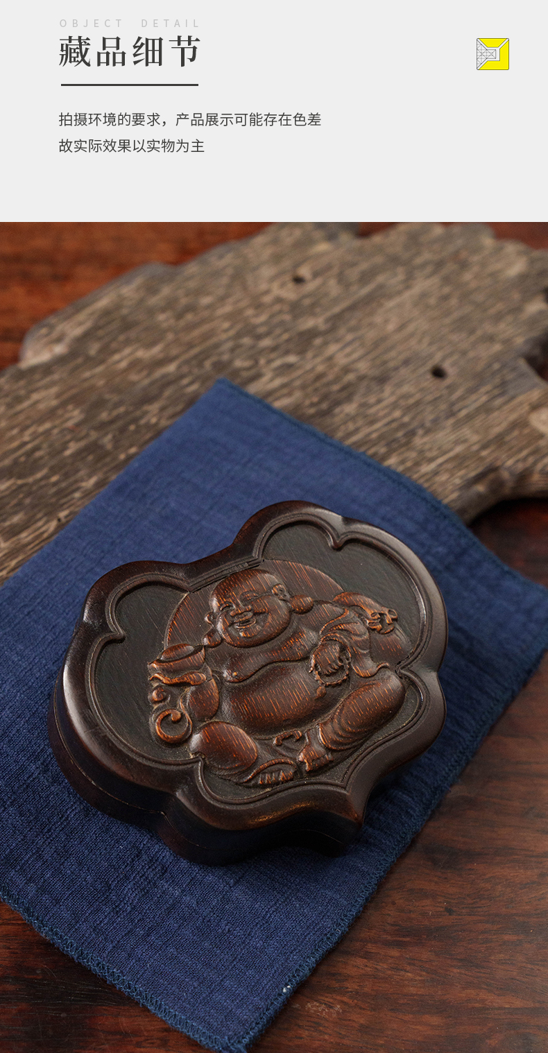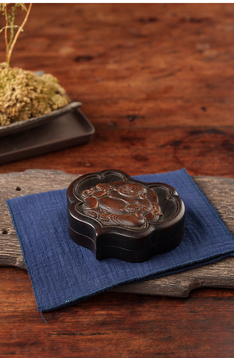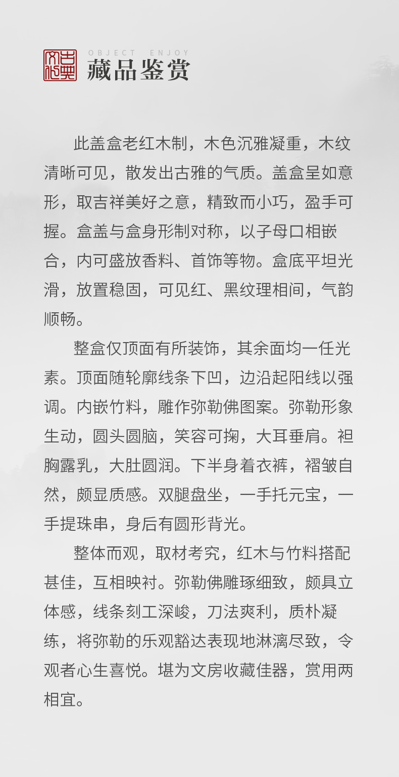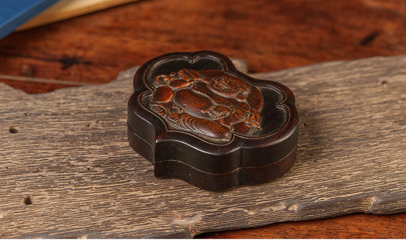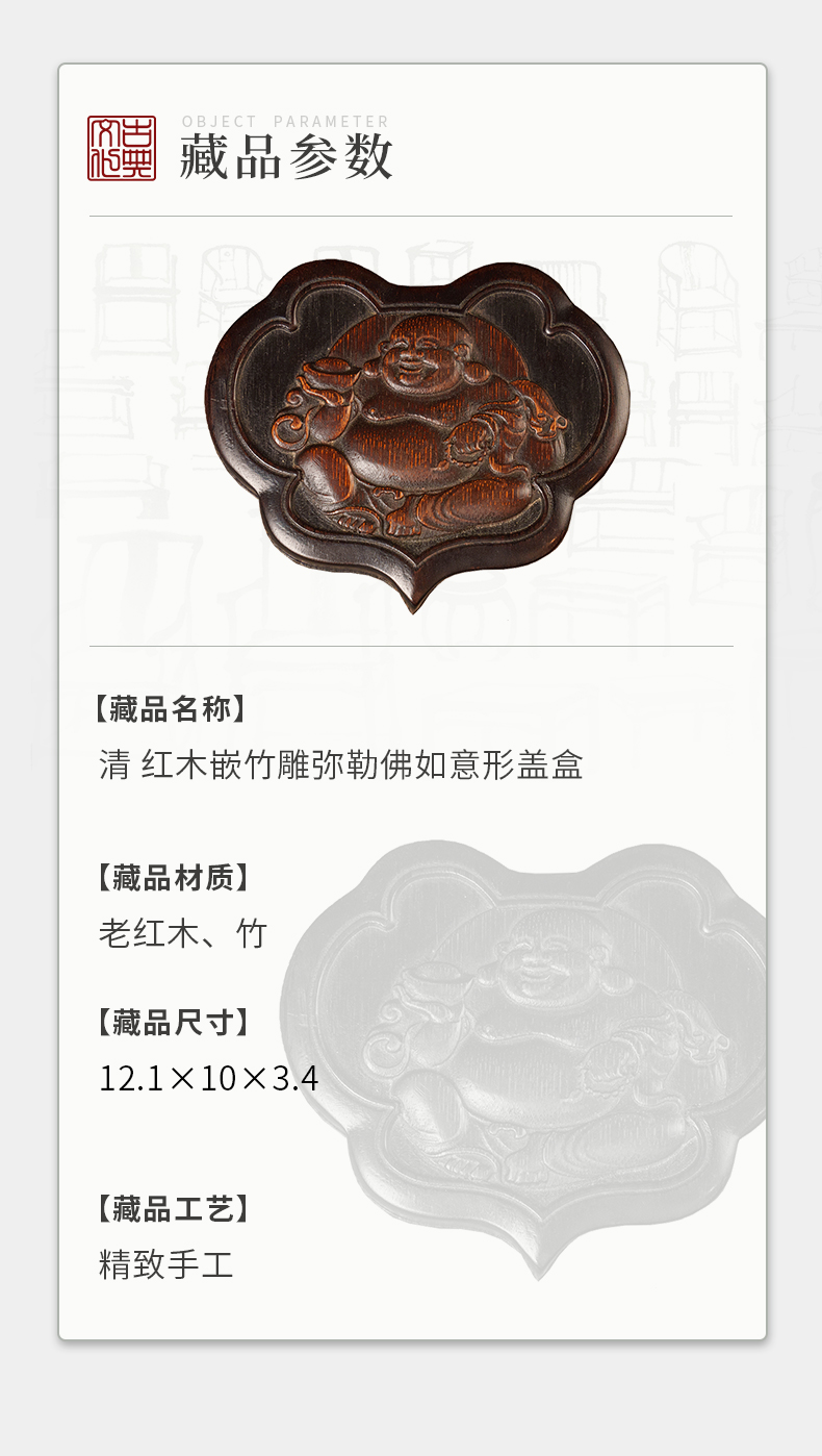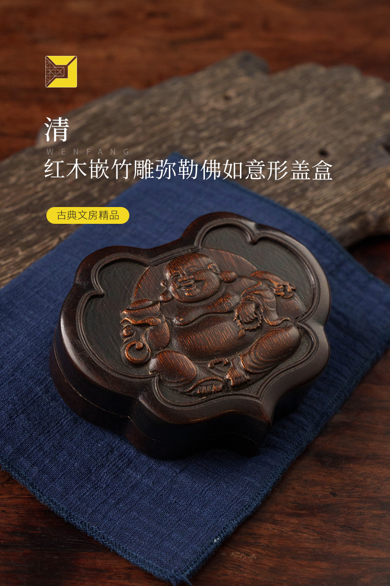 清 红木嵌竹雕弥勒佛如意形盖盒
