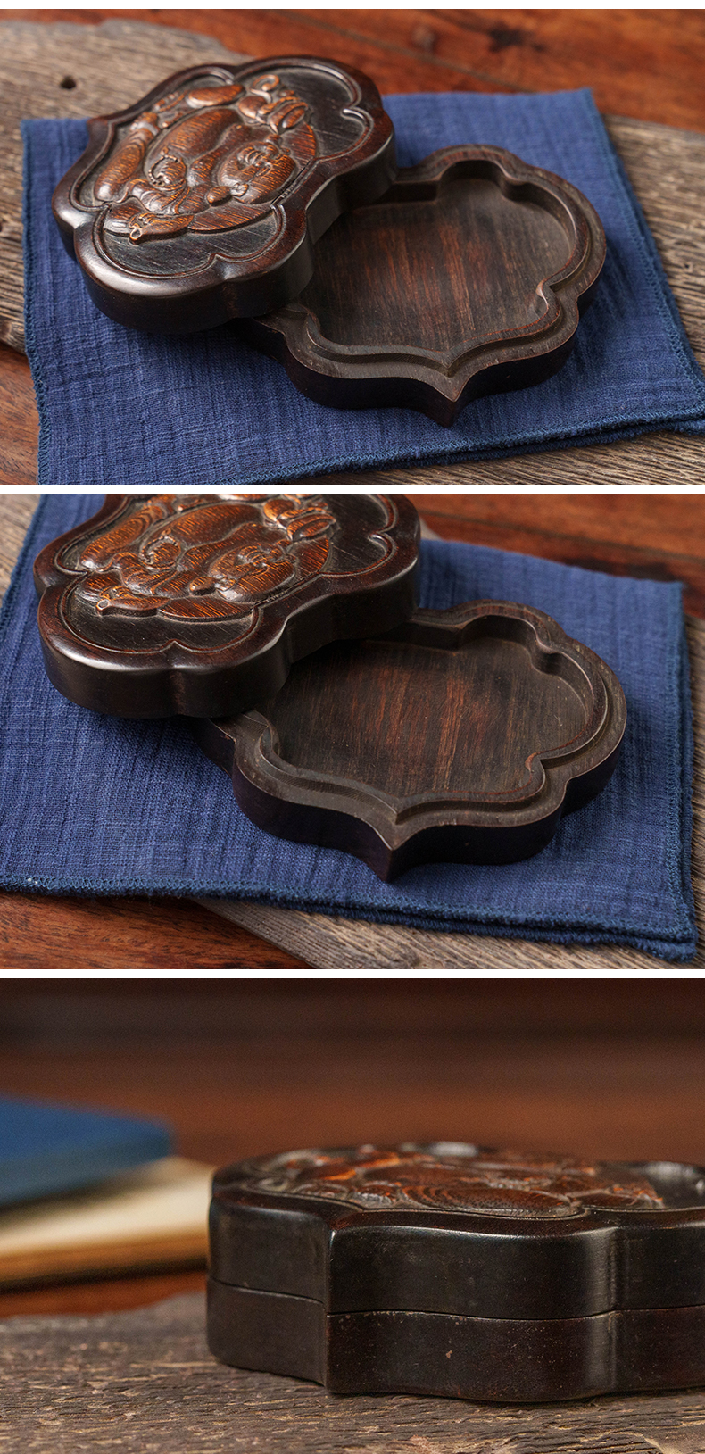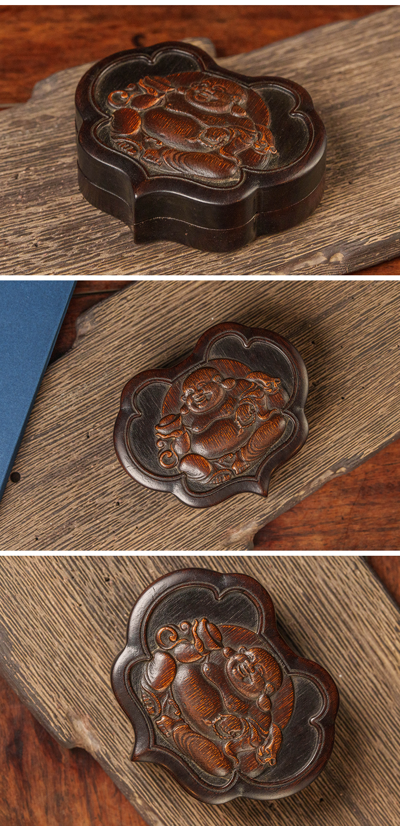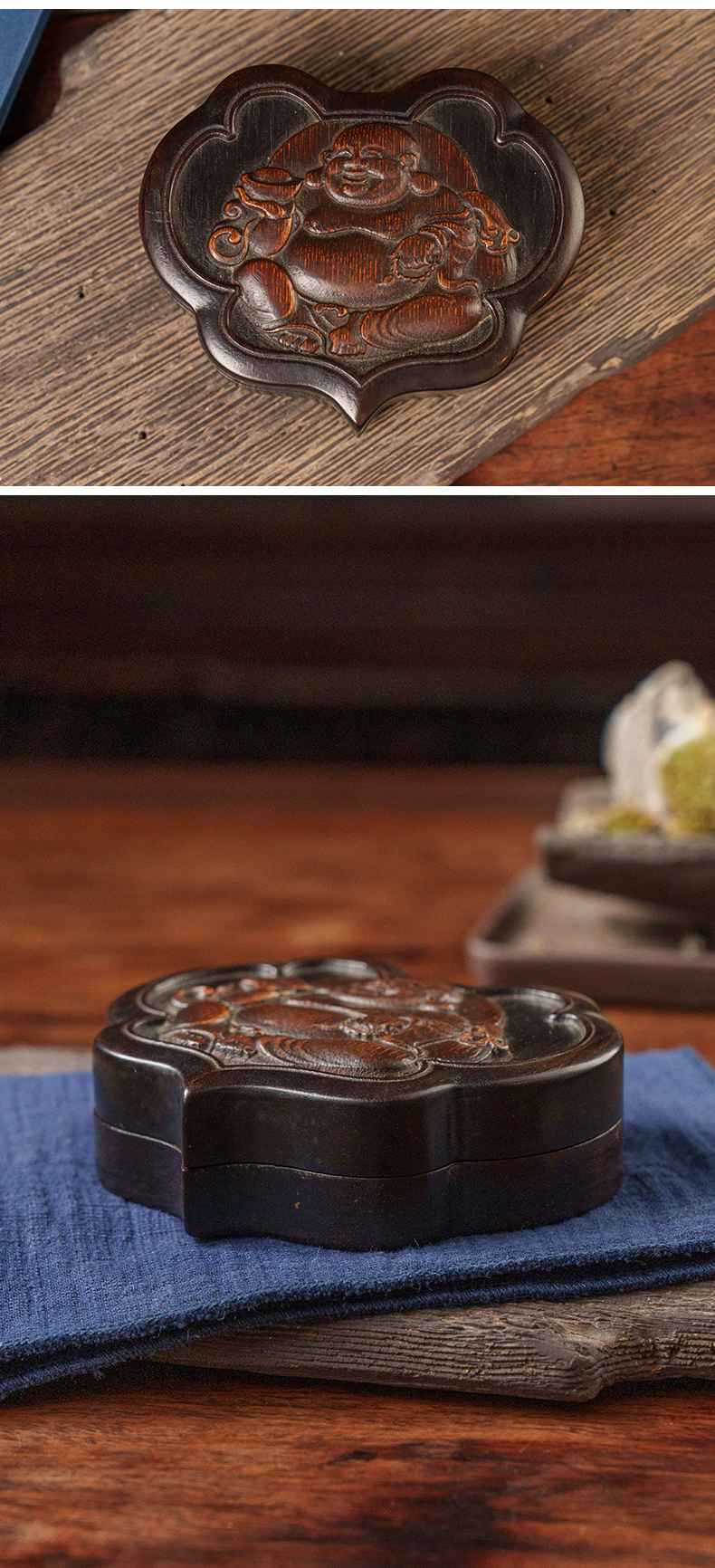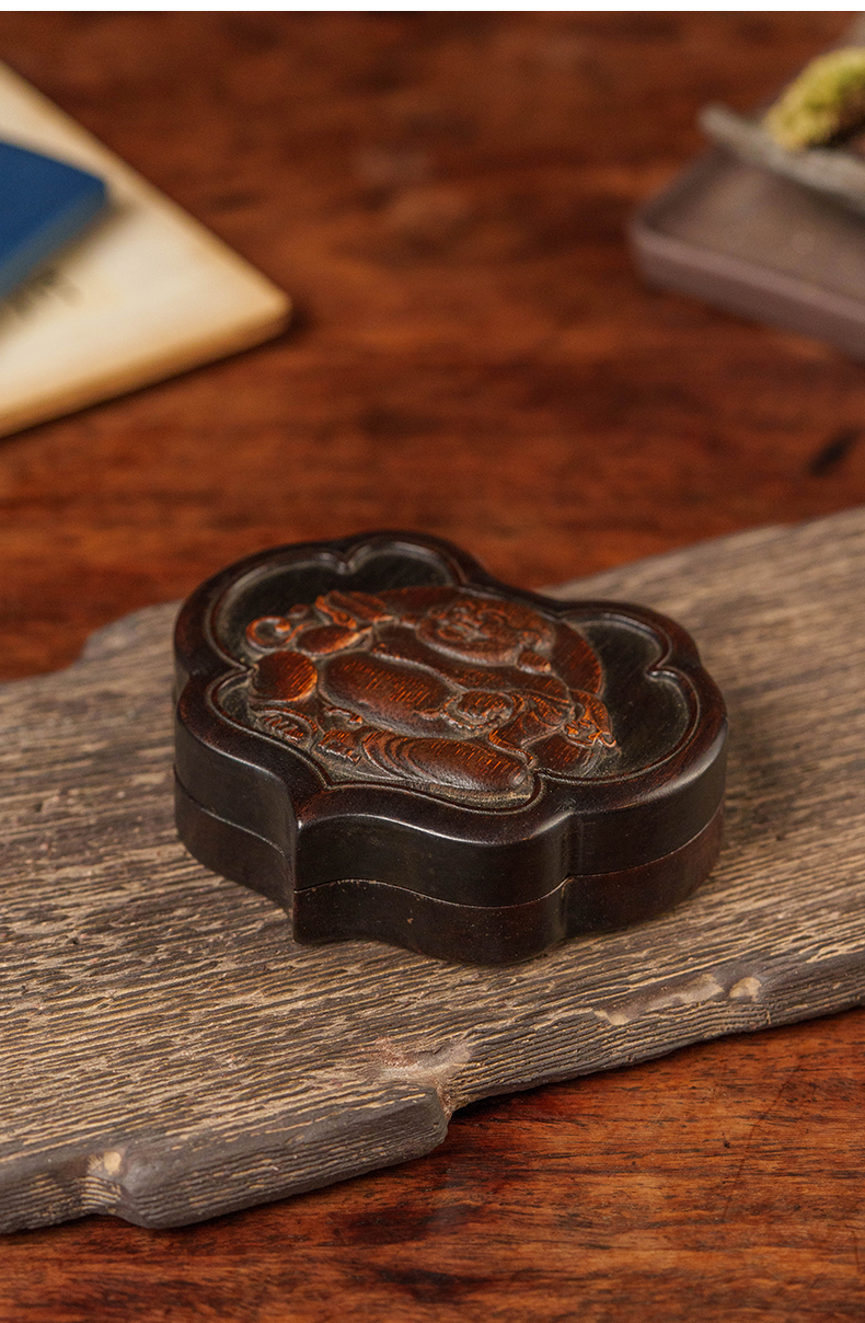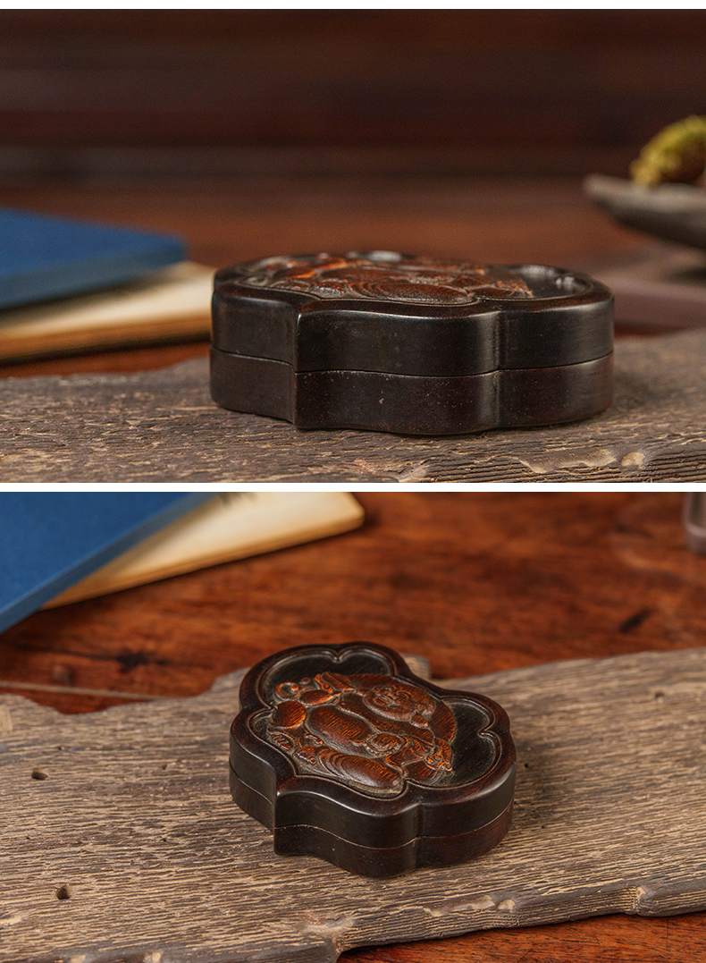 清 红木嵌竹雕弥勒佛如意形盖盒