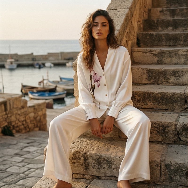 东方鸢尾』桑罗SANGLUO中式V领睡衣套装桑蚕丝女长袖家居服外穿【100%桑蚕丝,19姆米素绉缎】03B22859
