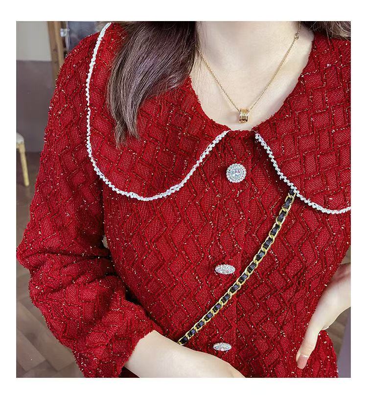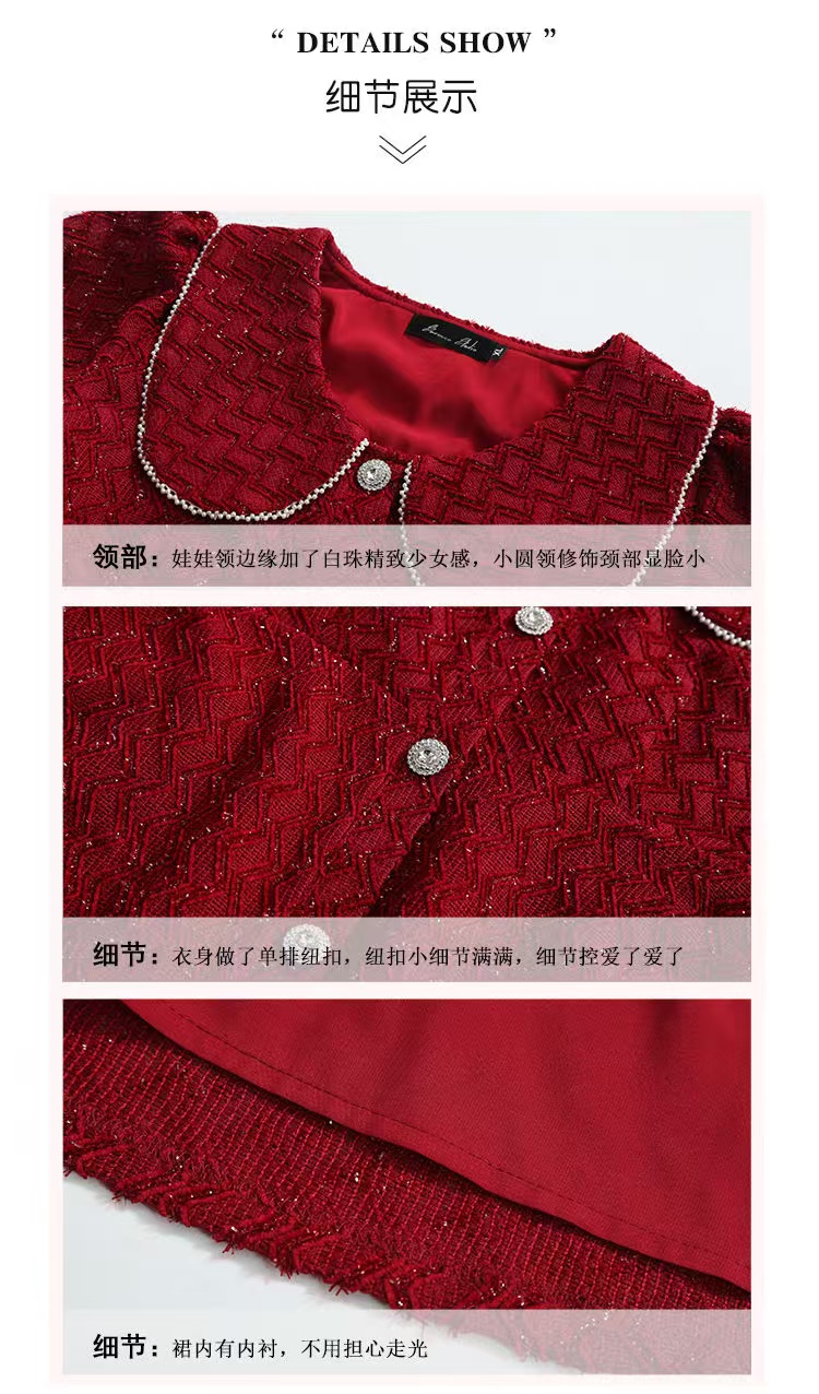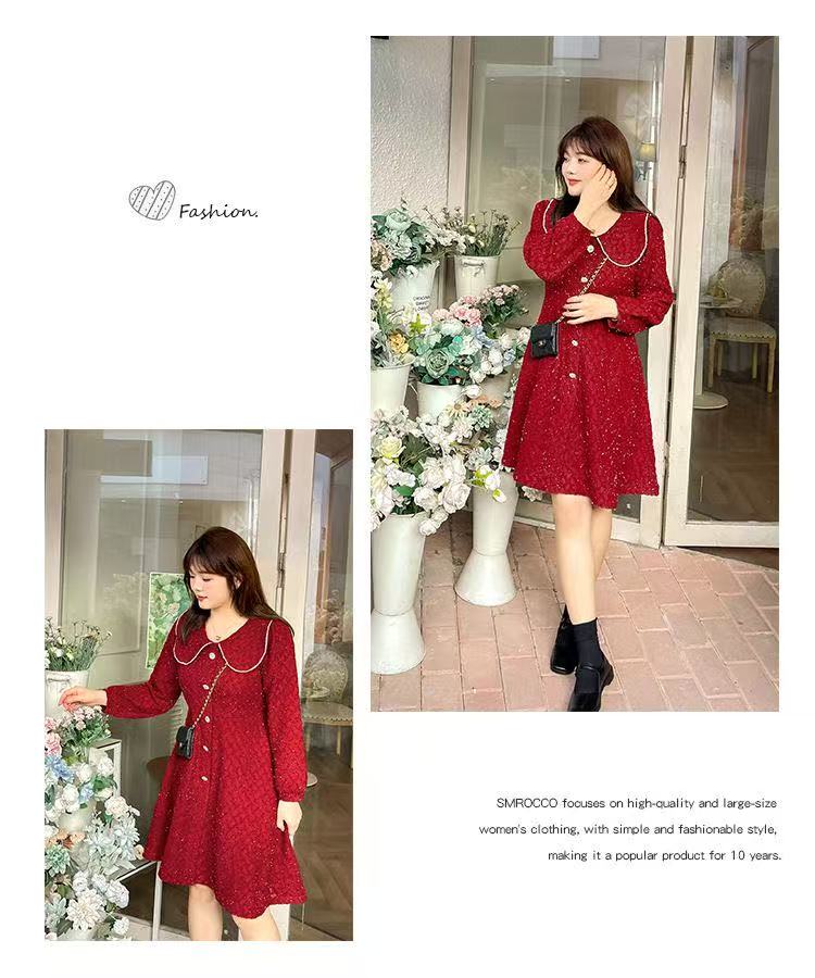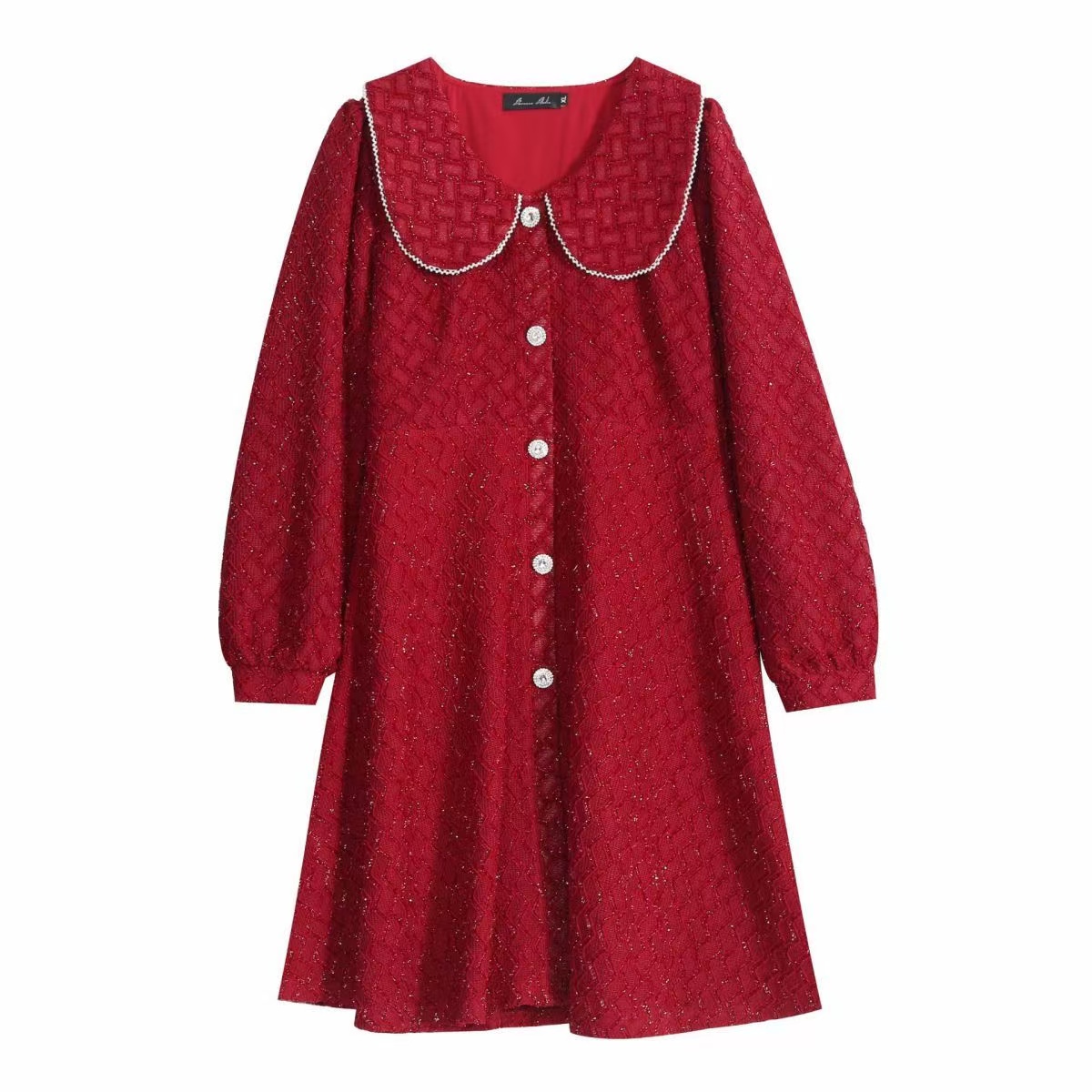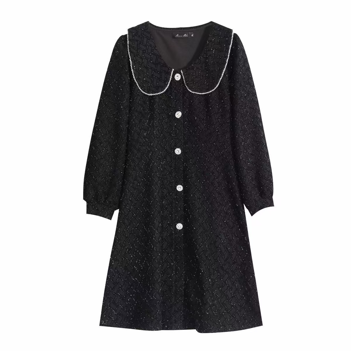 超值购【诗铭洛可】W571连衣裙春秋小香风珍珠翻领亮丝连衣裙C1-1