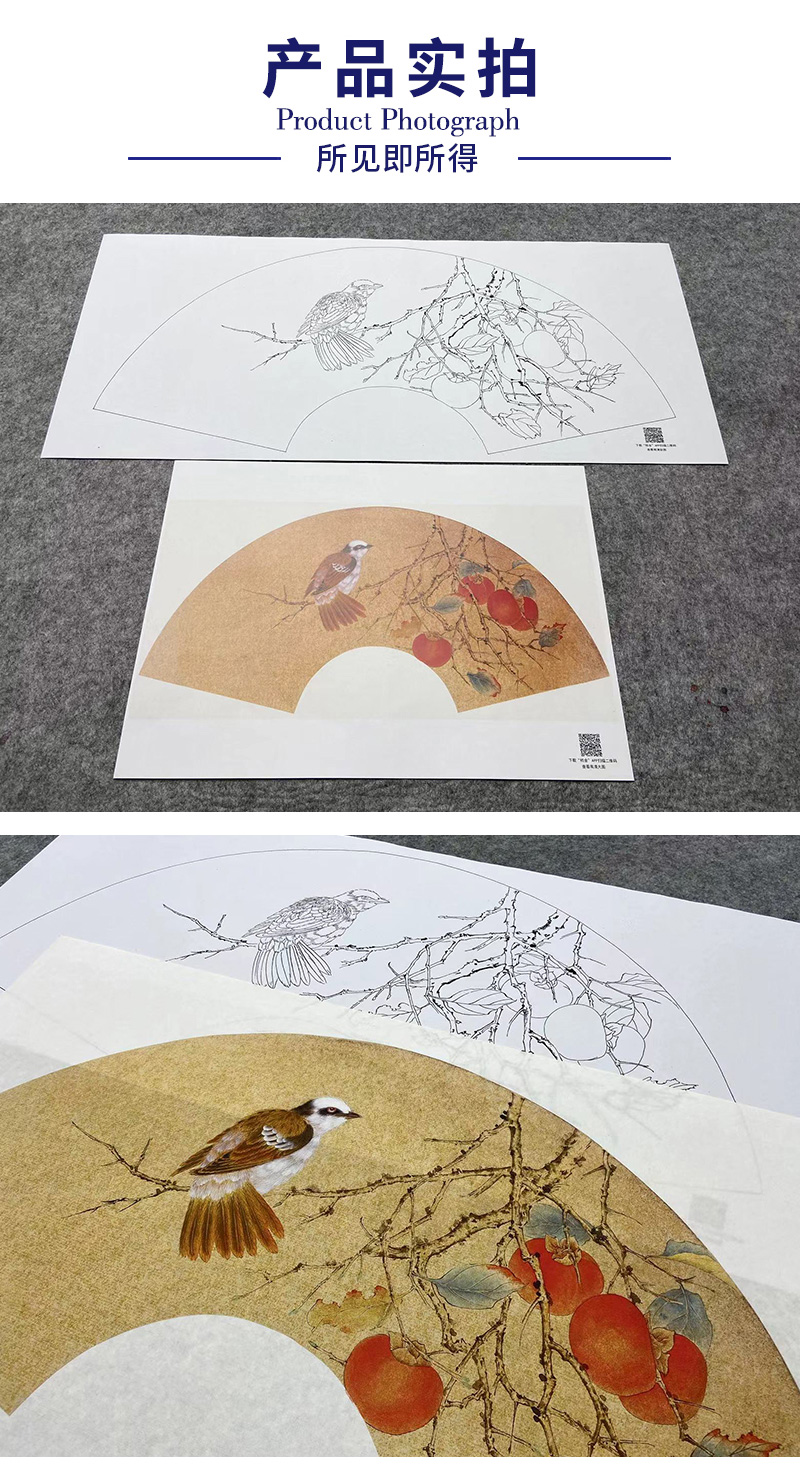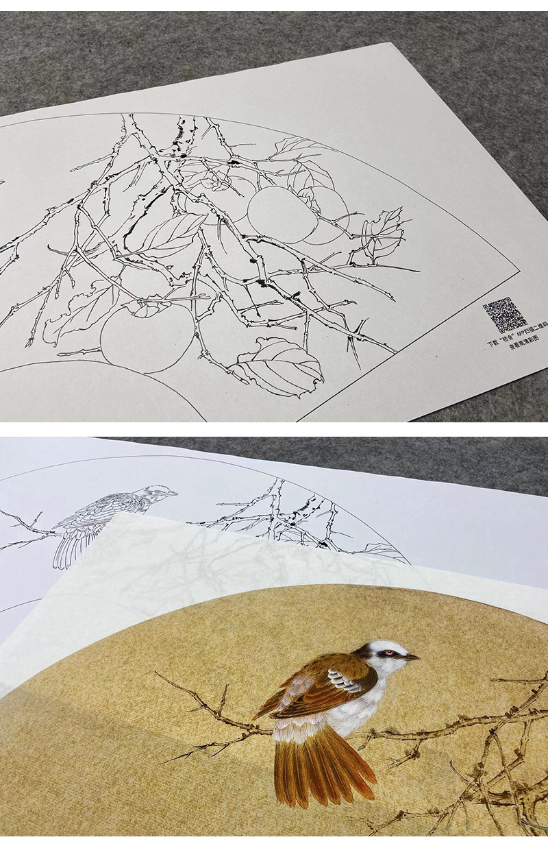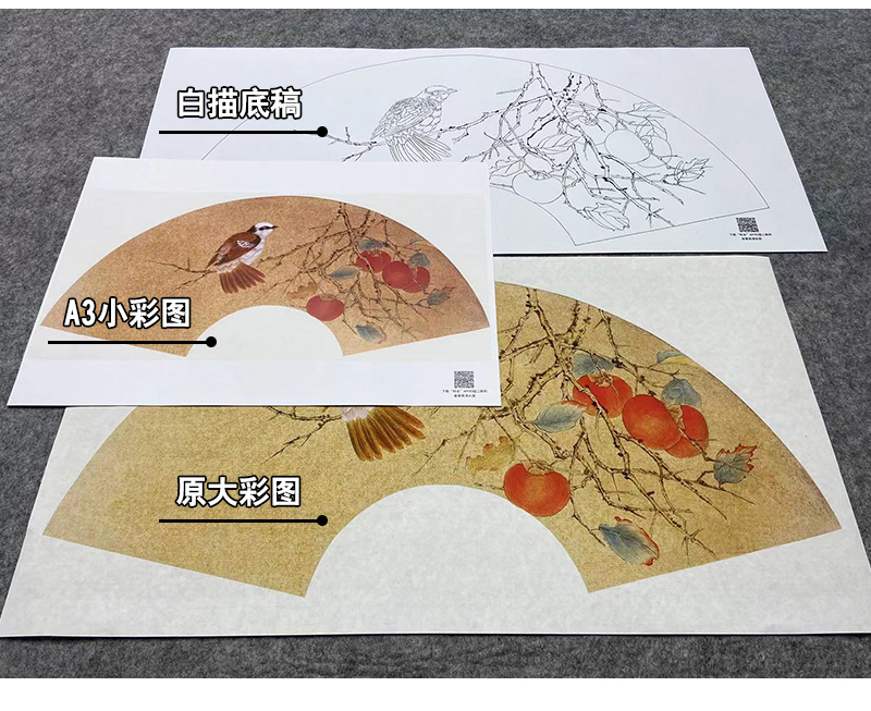 【大彩图】张建军工笔画白描底稿柿子扇面小品临摹勾线花鸟线稿A348