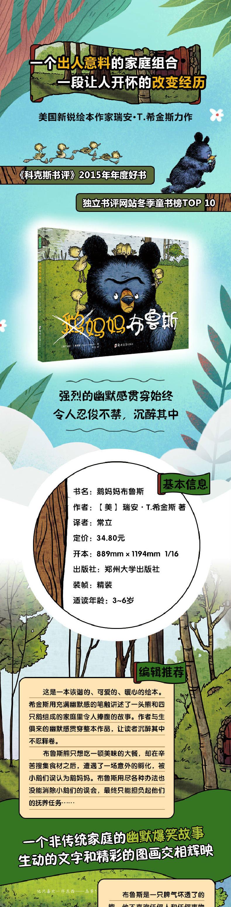 这是一本诙谐的、可爱的、暖心的绘本,希金斯用充满幽默感的笔触讲述了一头熊和四只鹅组成的家庭里令人捧腹的故事,作者与生俱来的幽默感贯穿整本作品,让读者沉醉其中不忍释卷。