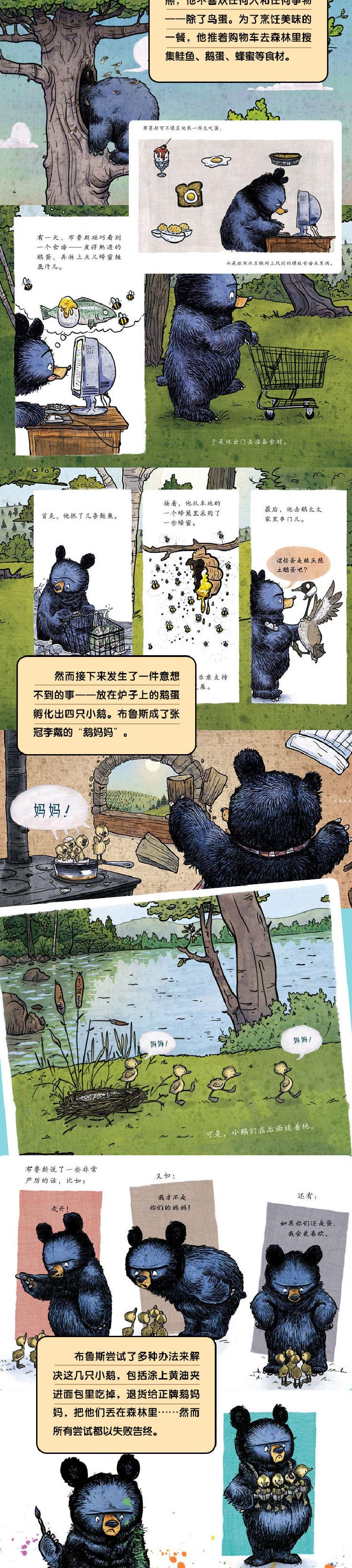 布鲁斯是一只脾气坏透了的熊,他不喜欢任何人和任何事物——除了鸟蛋。为了烹饪美味的一餐,他推着购物车去森林里搜集鲑鱼、鹅蛋、蜂蜜等食材。然而接下来发生了一件意想不到的事——放在炉子上的鹅蛋孵化出四只小鹅。布鲁斯成了张冠李戴的“鹅妈妈”。