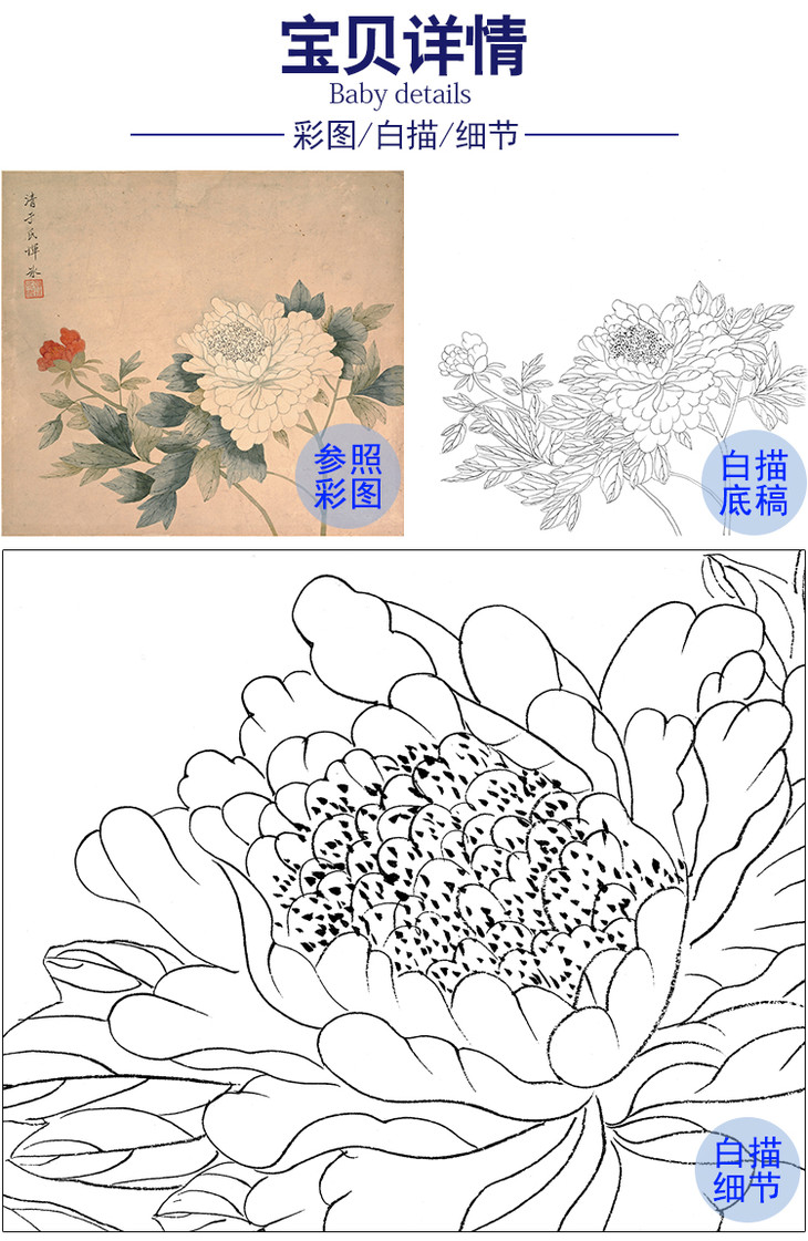 工笔画白描底稿明清花鸟 恽冰 牡丹图 斗方小品册页 MQ13