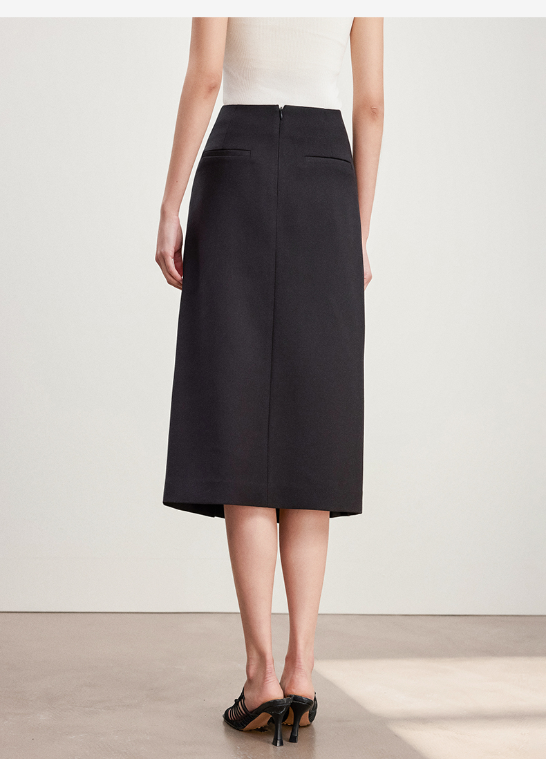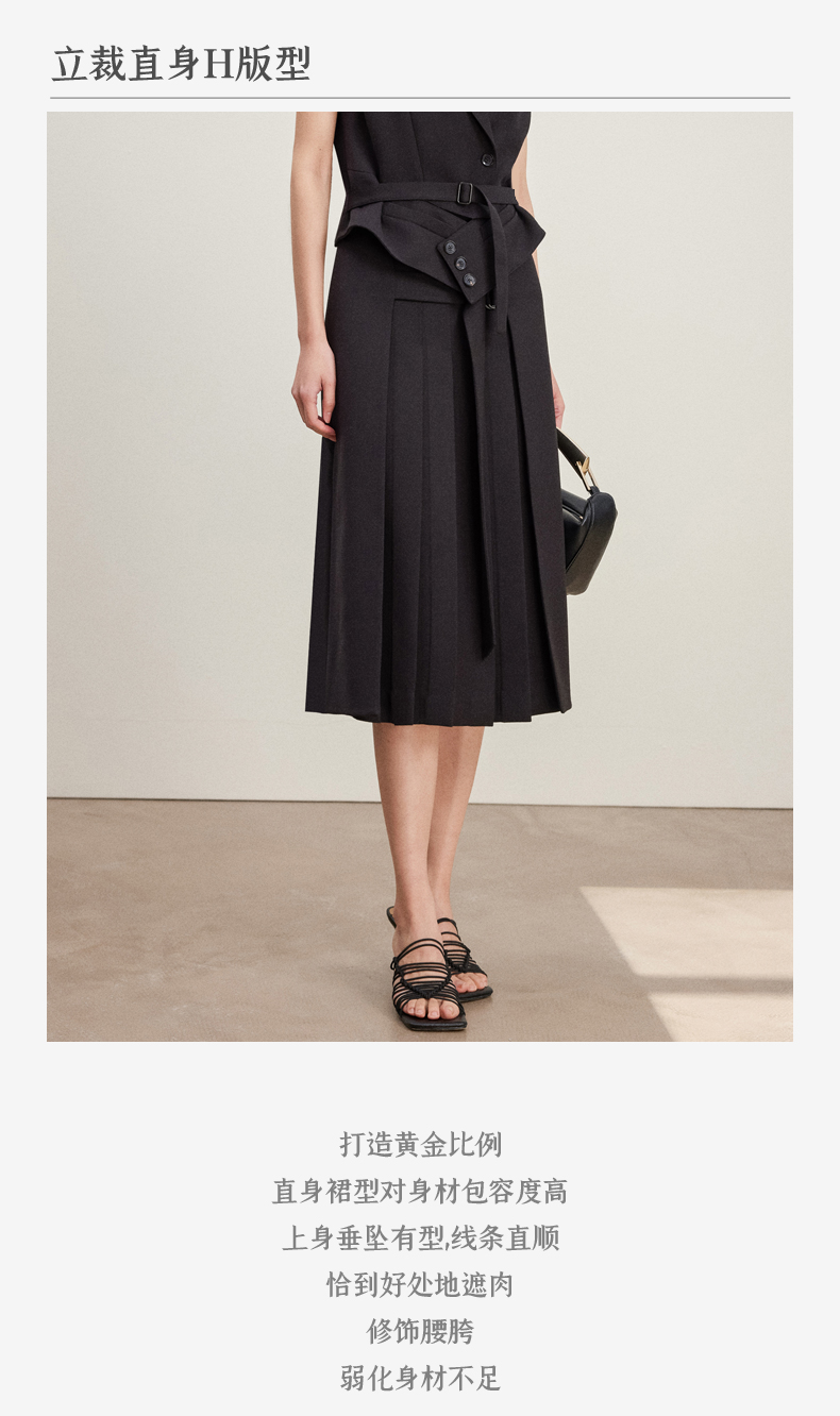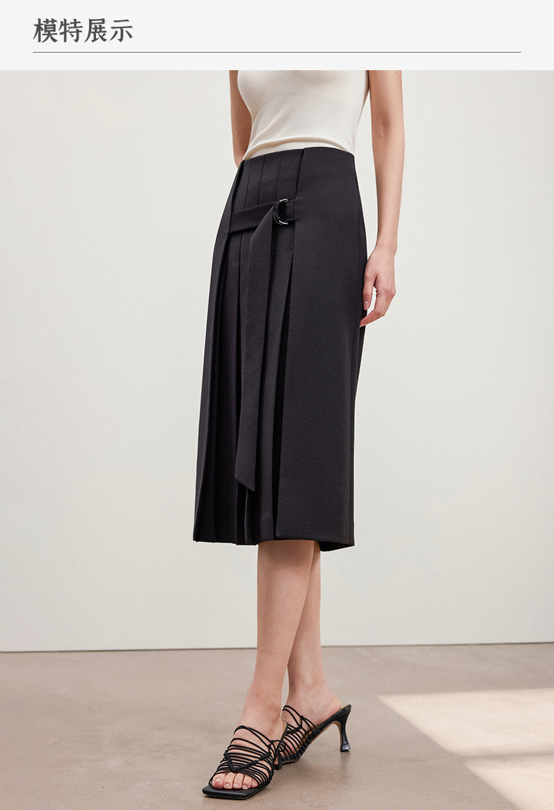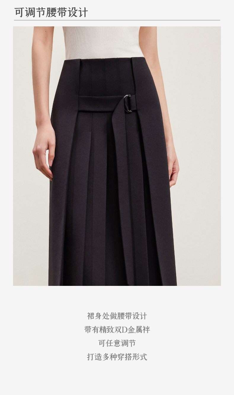 西嘉C+IMPRESS/西嘉精纺羊毛压褶黑色半身裙女春季新款设计感腰带短裙BQ2401009